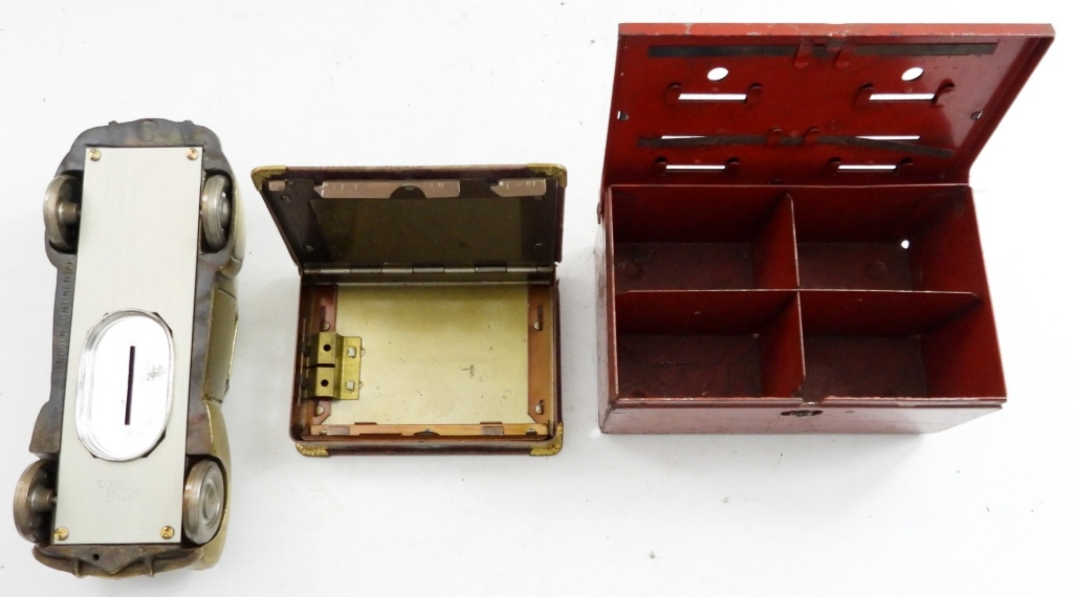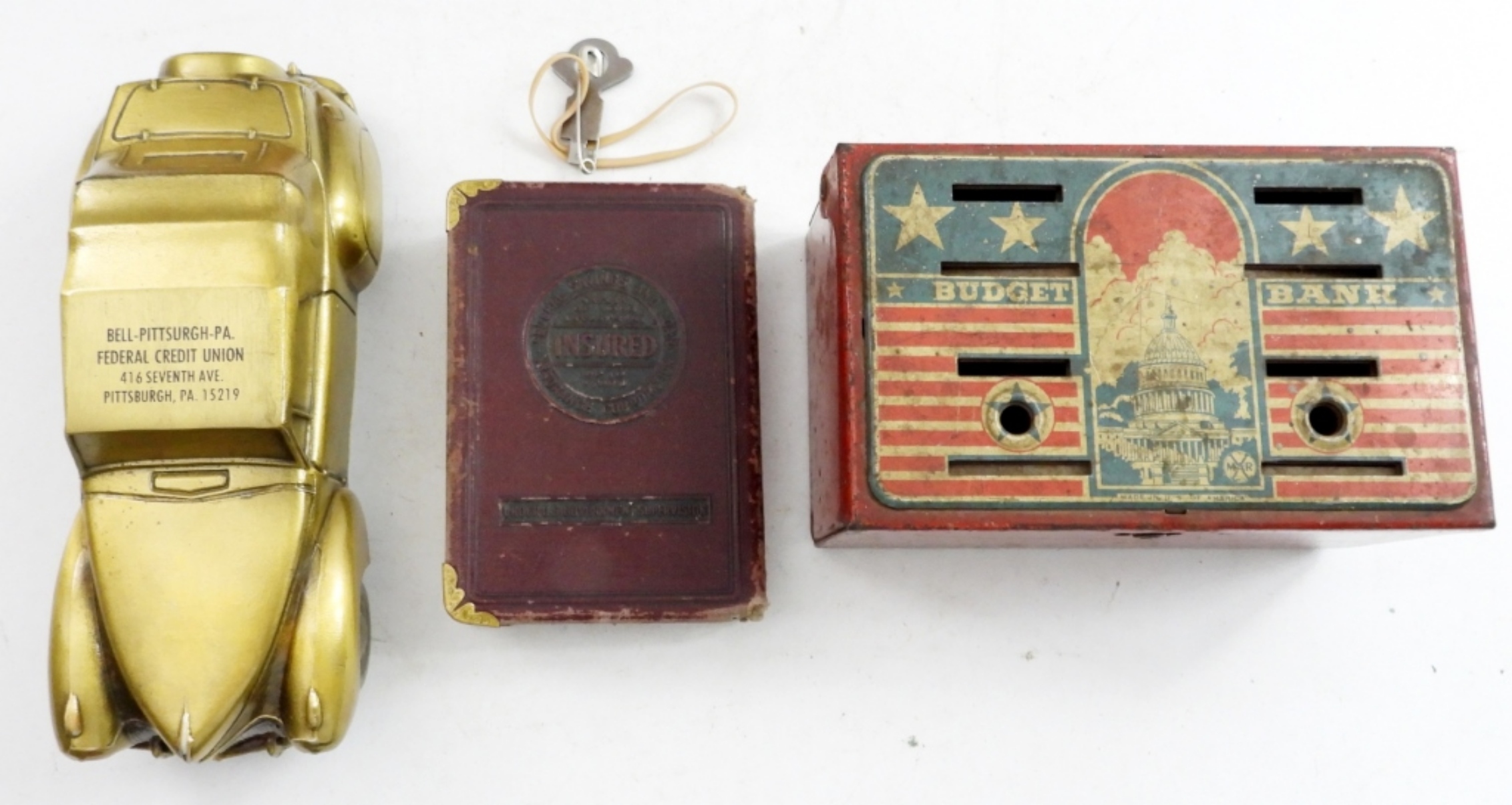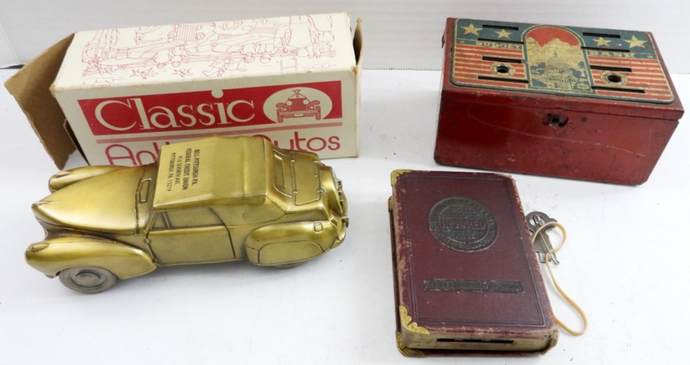 THREE ASSORTED VINTAGE BANKS. 1974 BANTHRICO “1941 LINCOLN CONTINENTAL COIN BANK. BOOK SHAPED BANK WITH KEY! VINTAGE TIN “BUDGET BANK”.