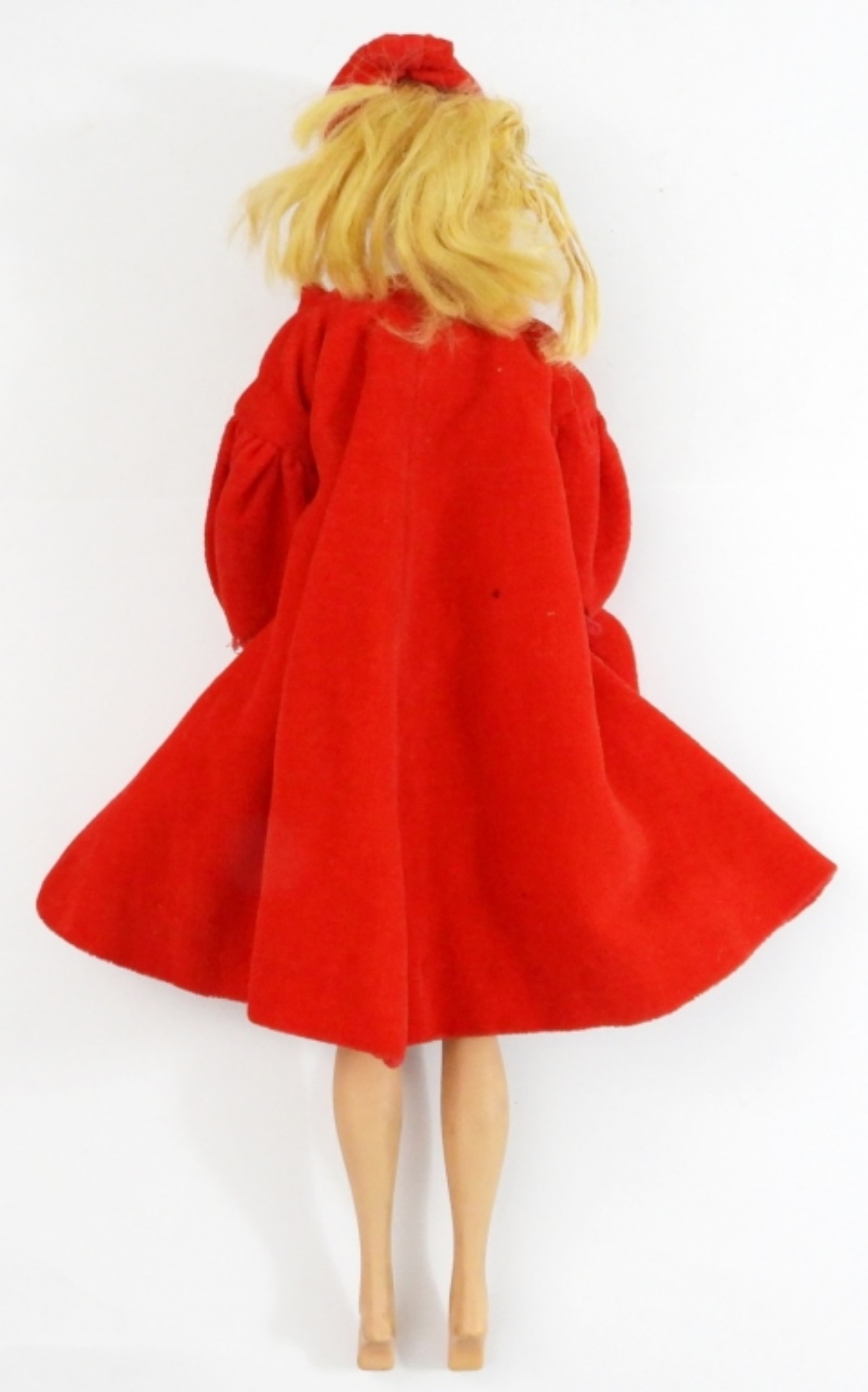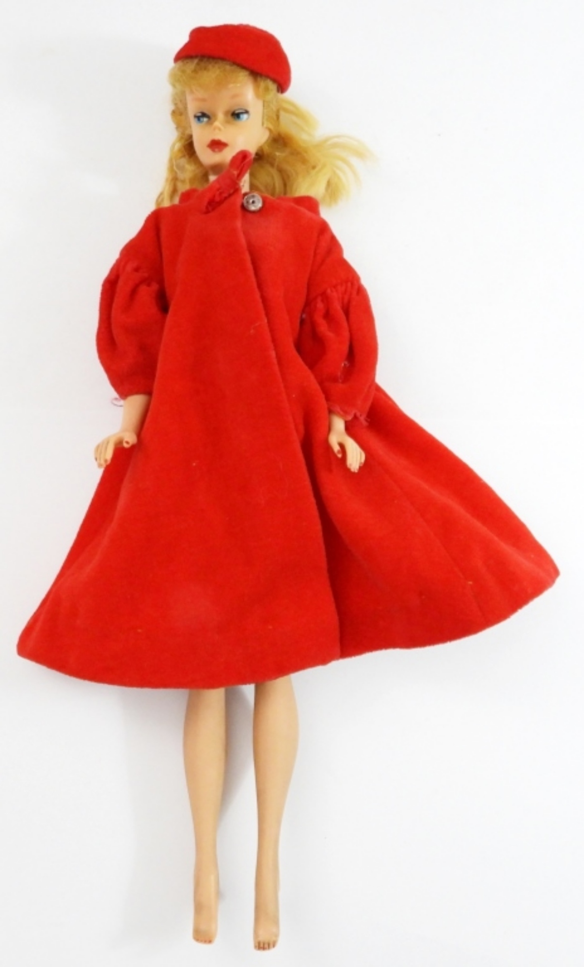1958 MATTEL BARBIE MCMLVIII ON REAR CHEEK. DOES NOT BEND, HANDS AND FEET ARE WHOLE. SHINEY FACE, MAKEUP AND POLISH IS SLIGHTLY FADED. COMES WITH AN ORIGINAL RED BARBIE JACKET & HAT.