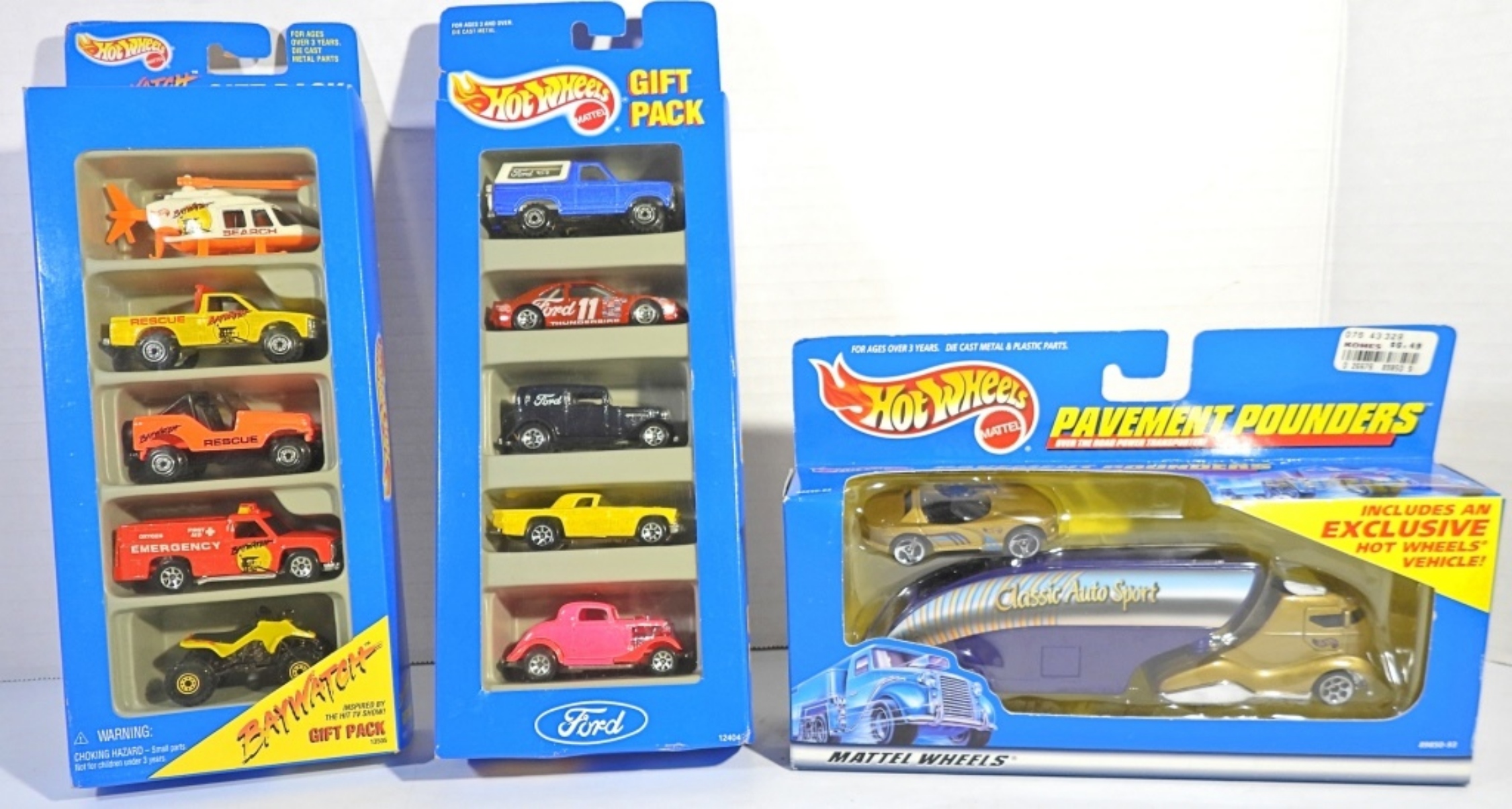 HOT WHEELS BAYWATCH SET, FORD 5 PACK, AND PAVEMENT POUNDERS SET