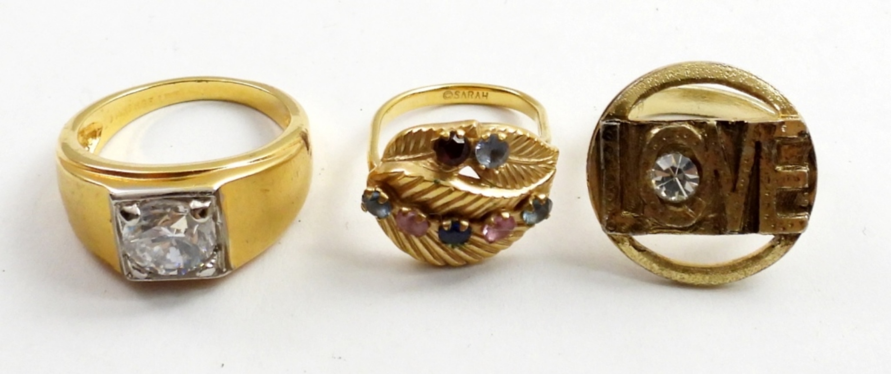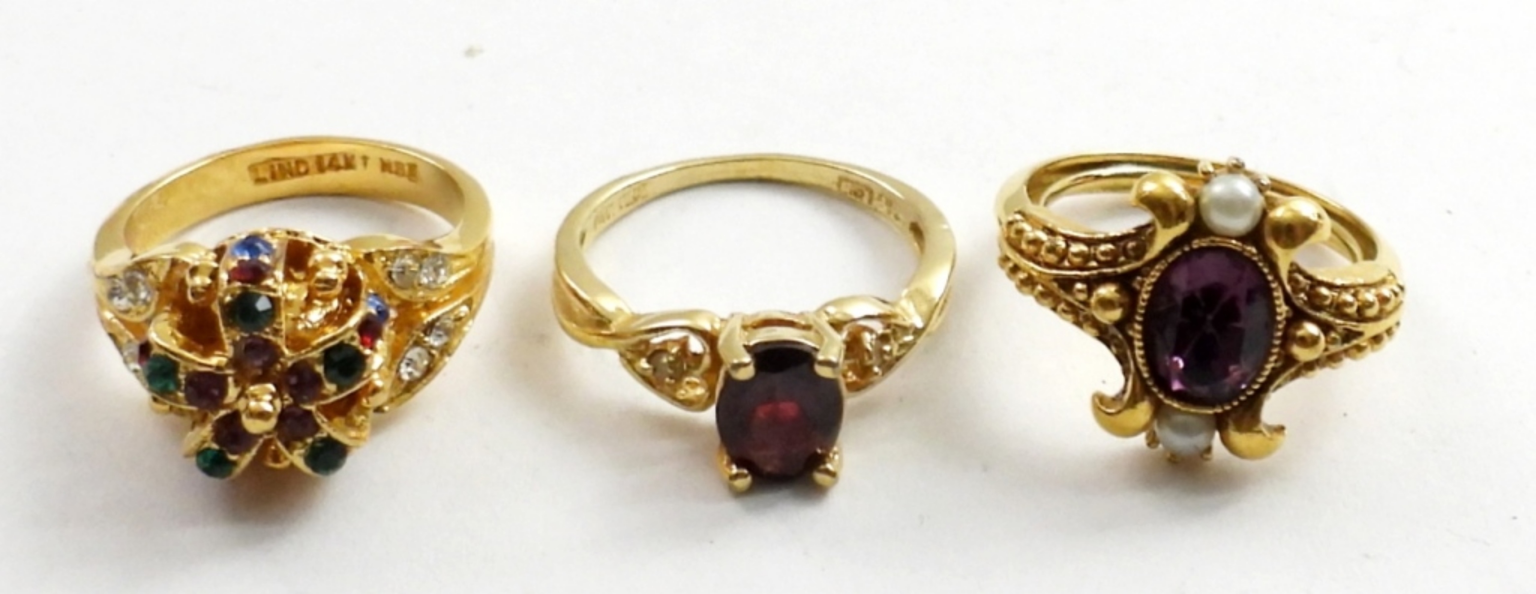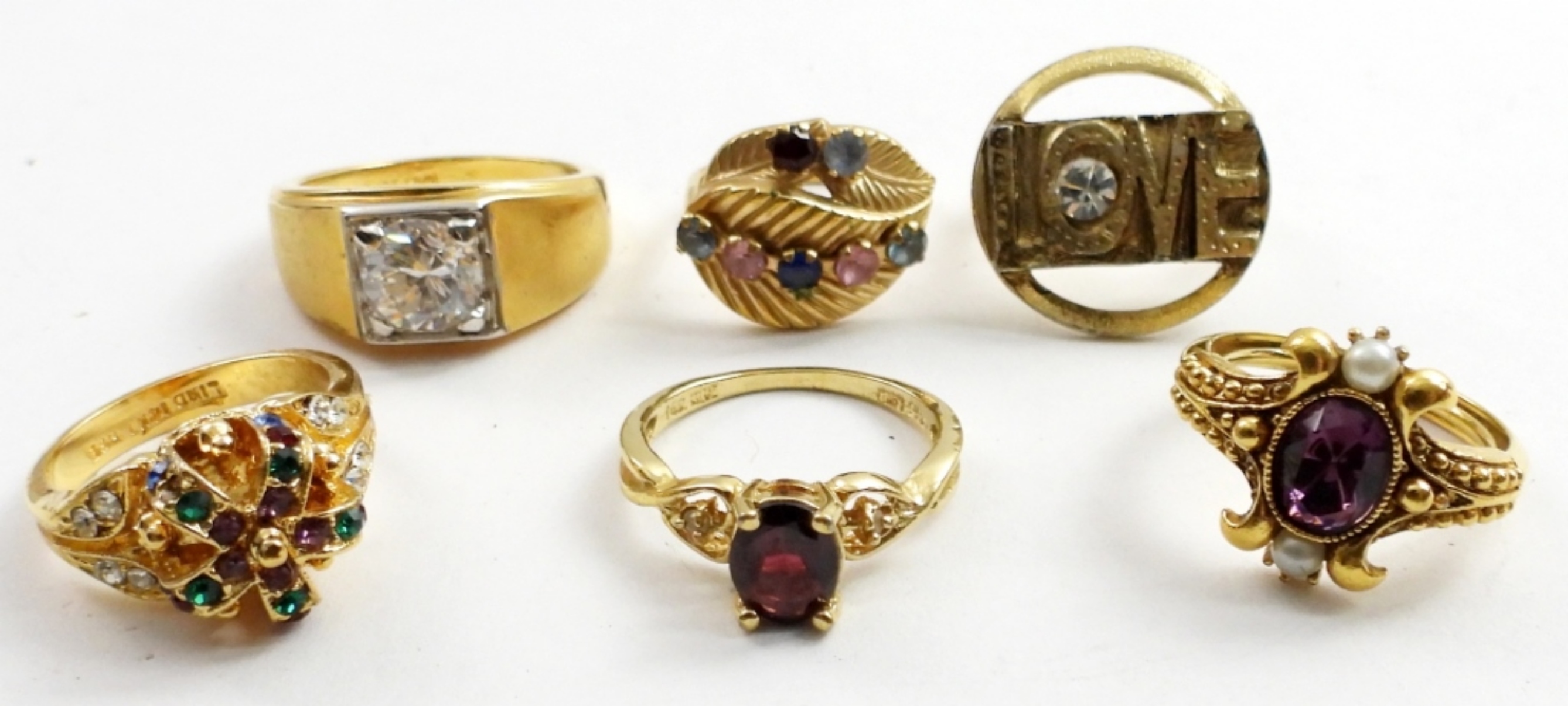 6 GOLD TONE FASHION RINGS WITH ASSORTED STONES. SIZES FROM 5 TO11