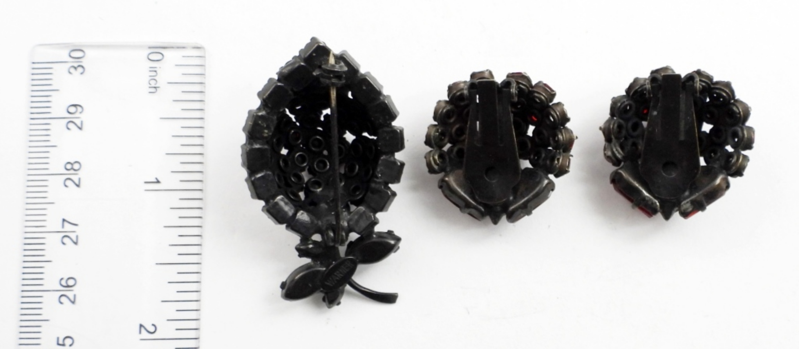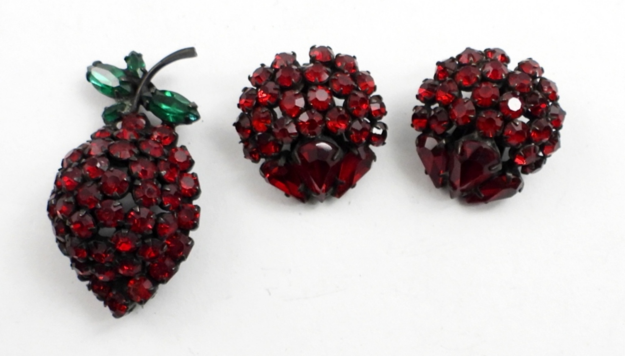 VINTAGE SIGNED WAREN RED RHINESTONE STRAWBERRY FRUIT PIN WITH MATCHING EARRINGS