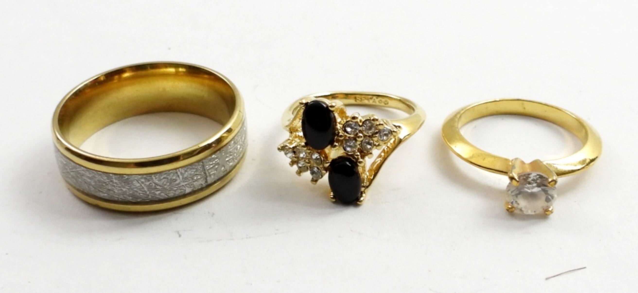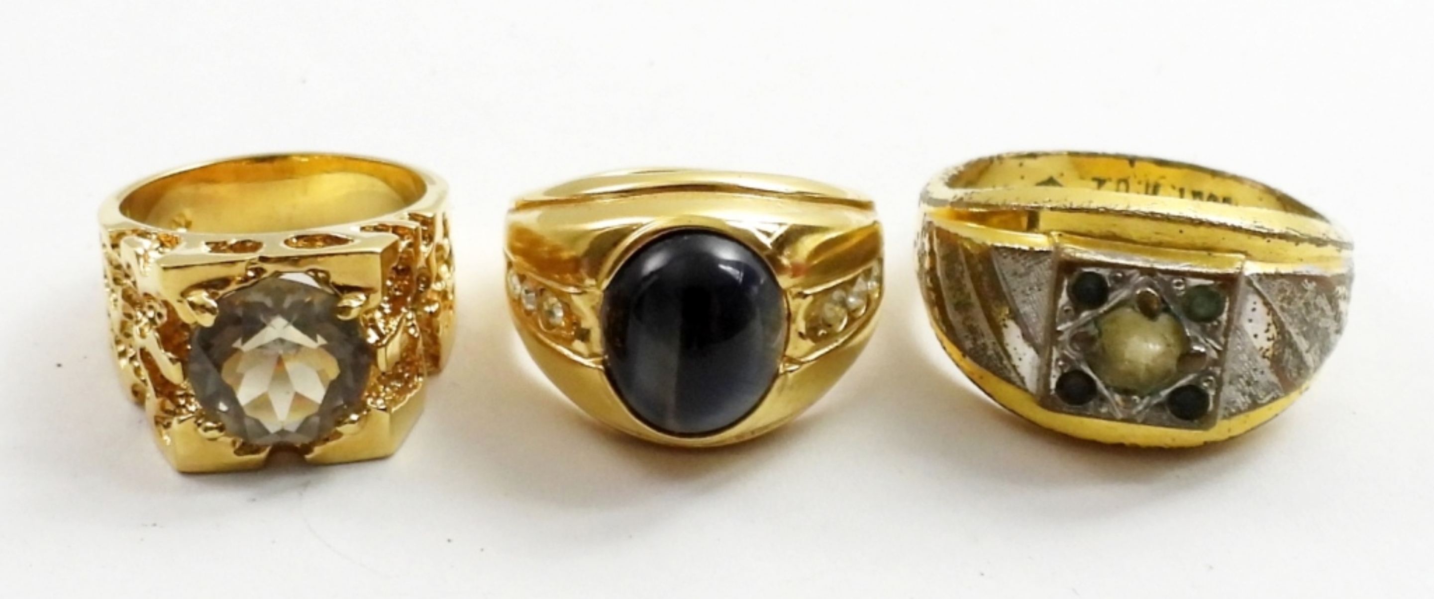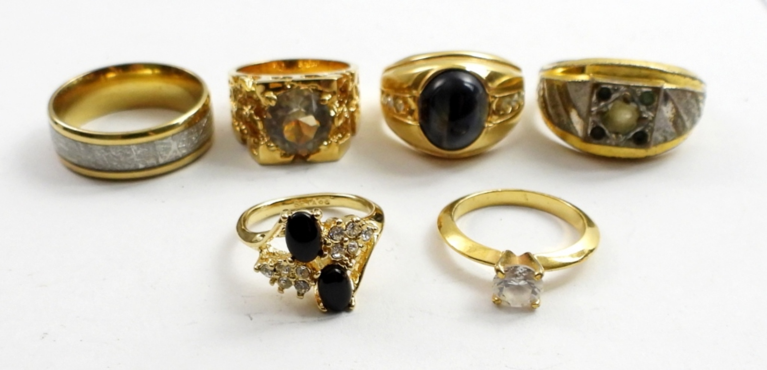 6 BEAUTIFUL GOLD TONE FASHION RINGS WITH ASSORTED STONES. SIZE 5.5,6,7,9,11,12
