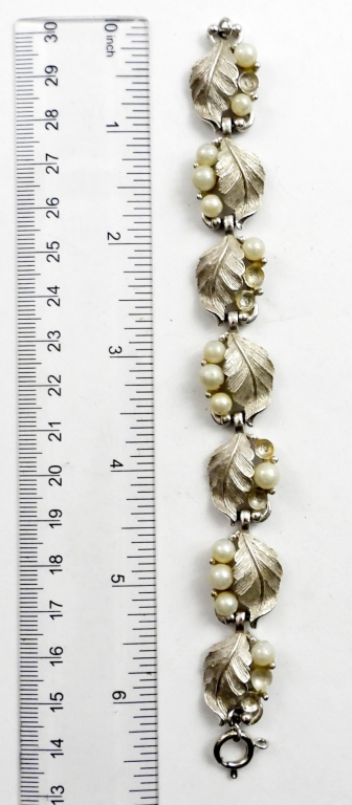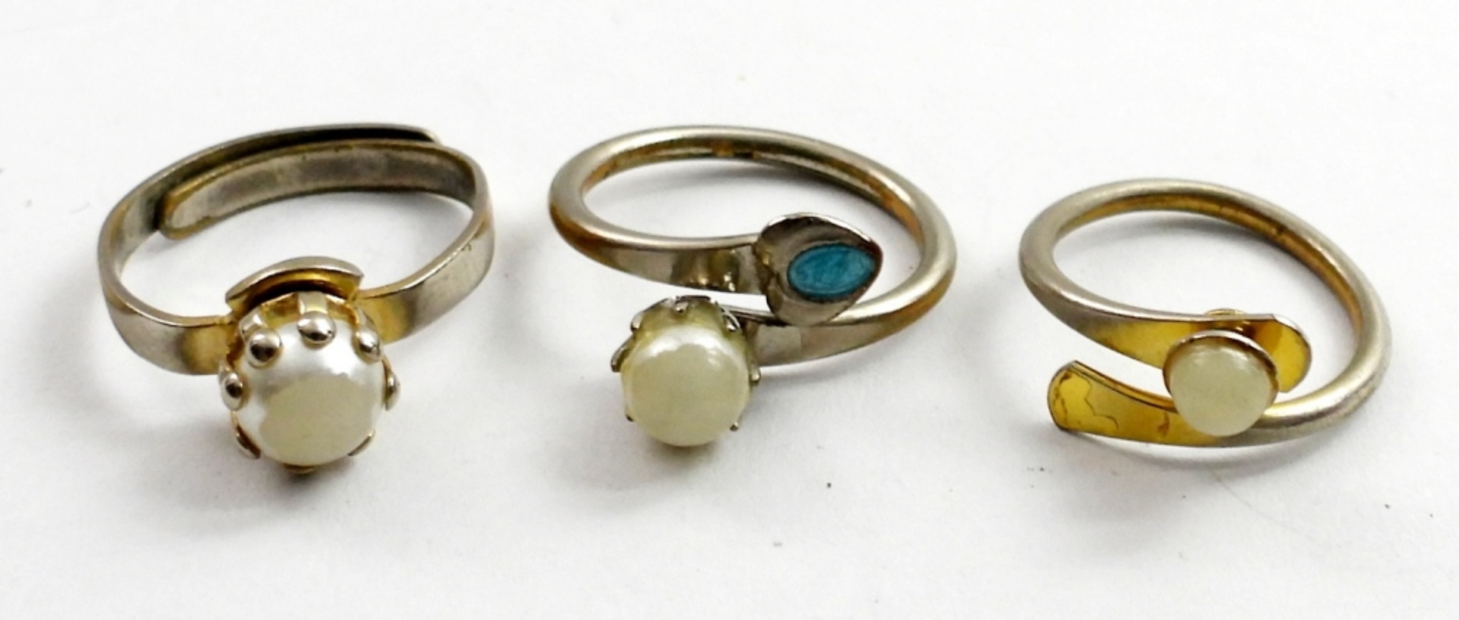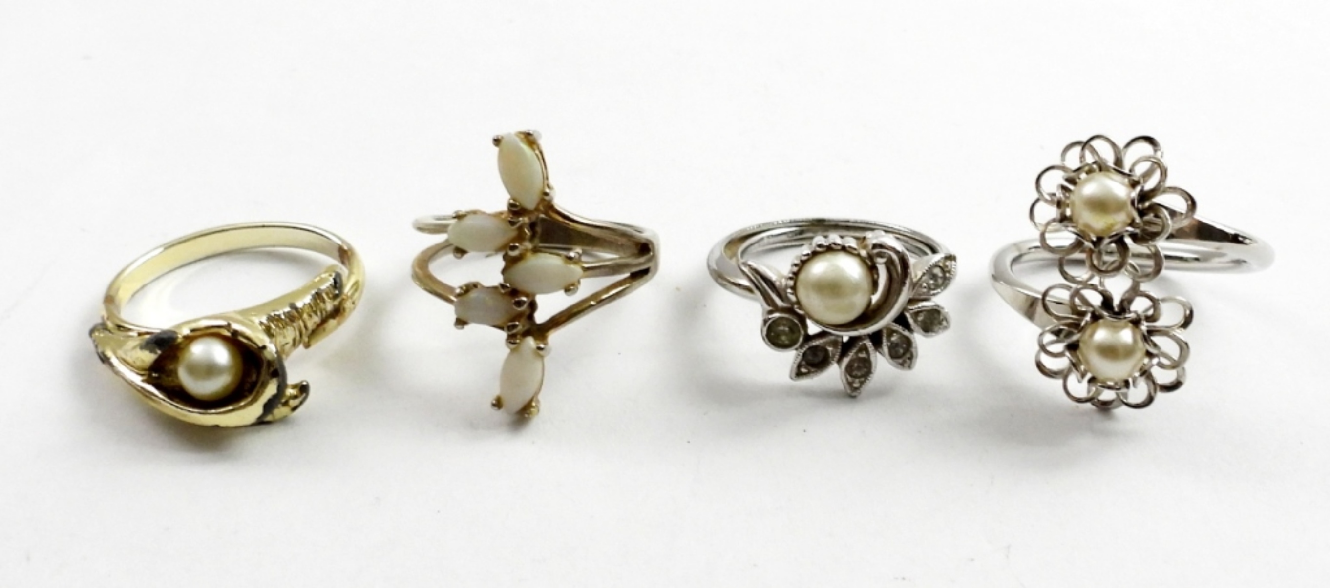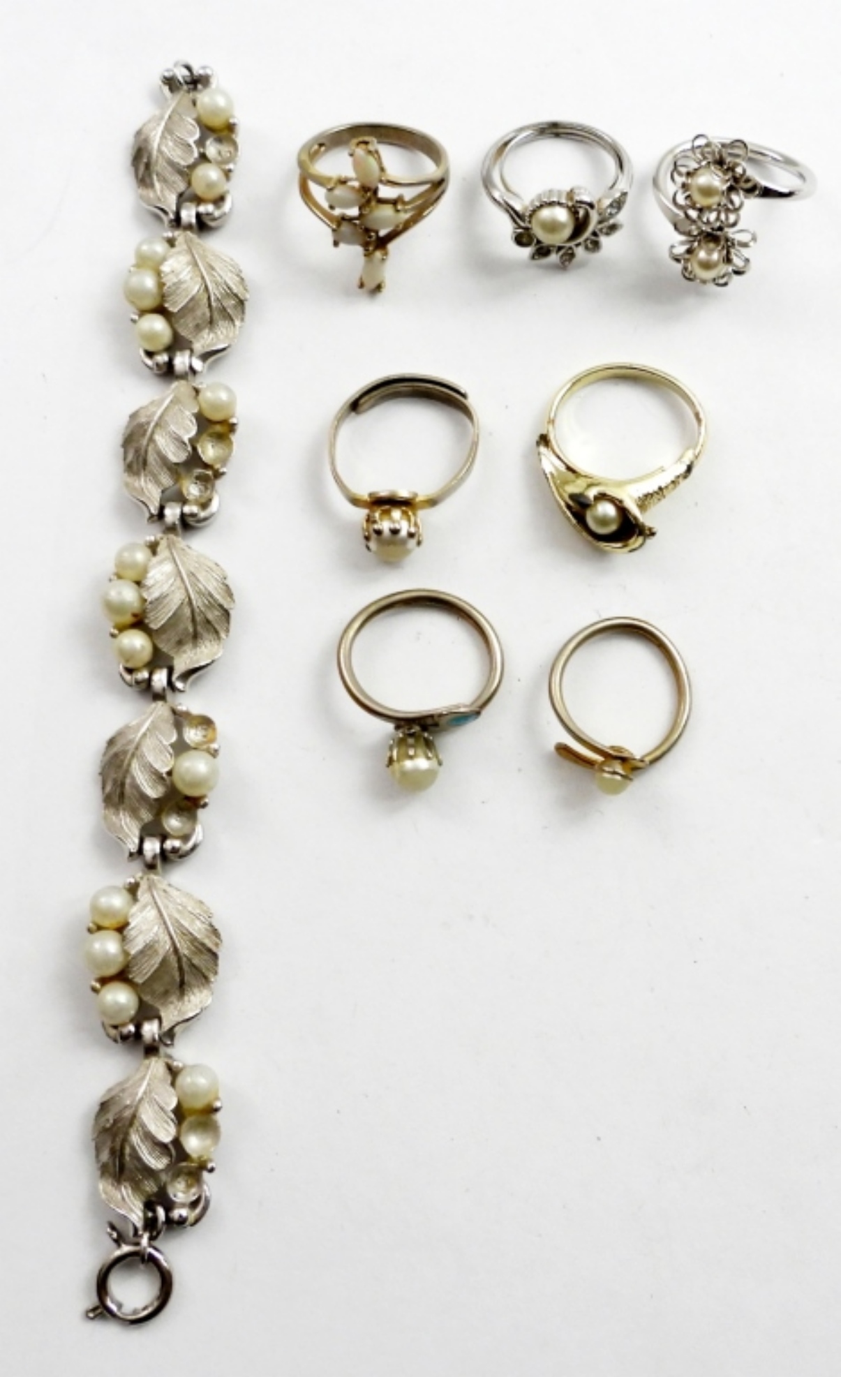 6″VINTAGE FAUX PEARL BRACELET & 7 FAUX PEARL AND OPAL RINGS. SIZE 5 -7.5