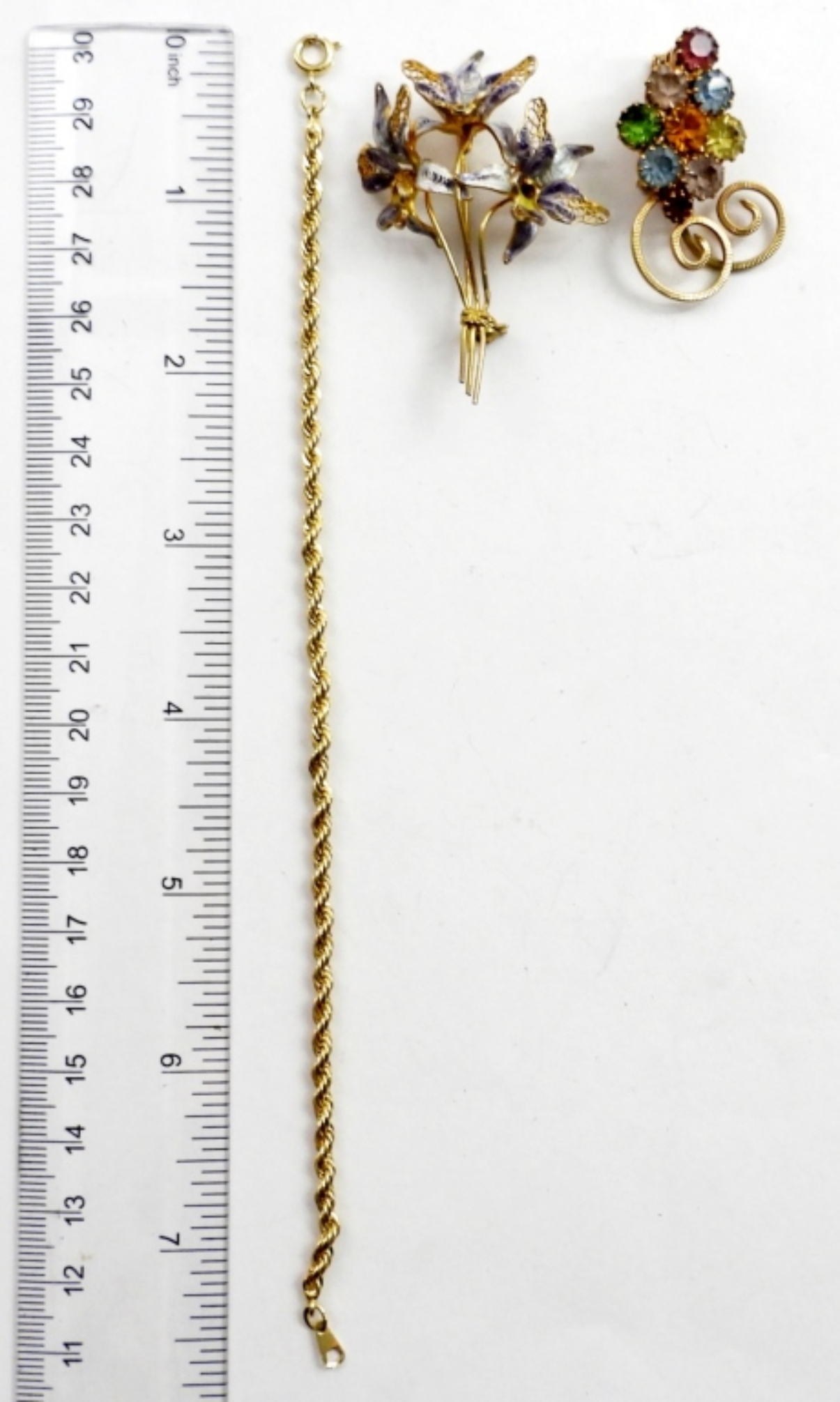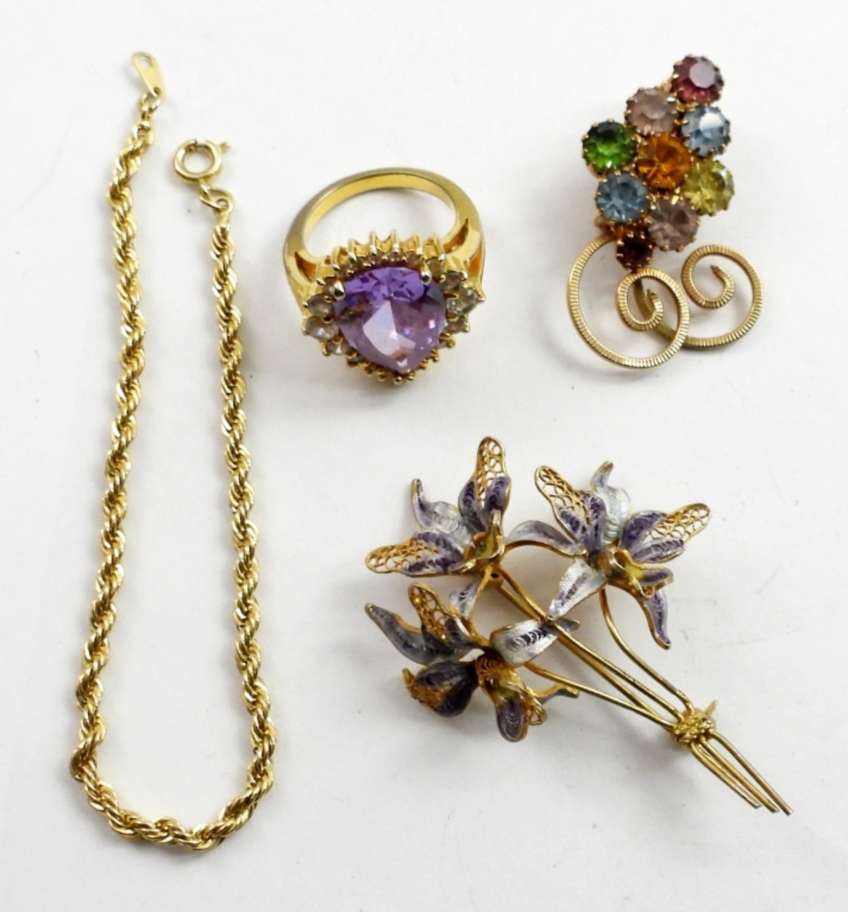 VINTAGE URANIUM GLASS BROOCH GOLD TONE ,GOLD TONE FLOWER BROOCH,7″BRACELET AND GOLD TONE RING SIZE 8