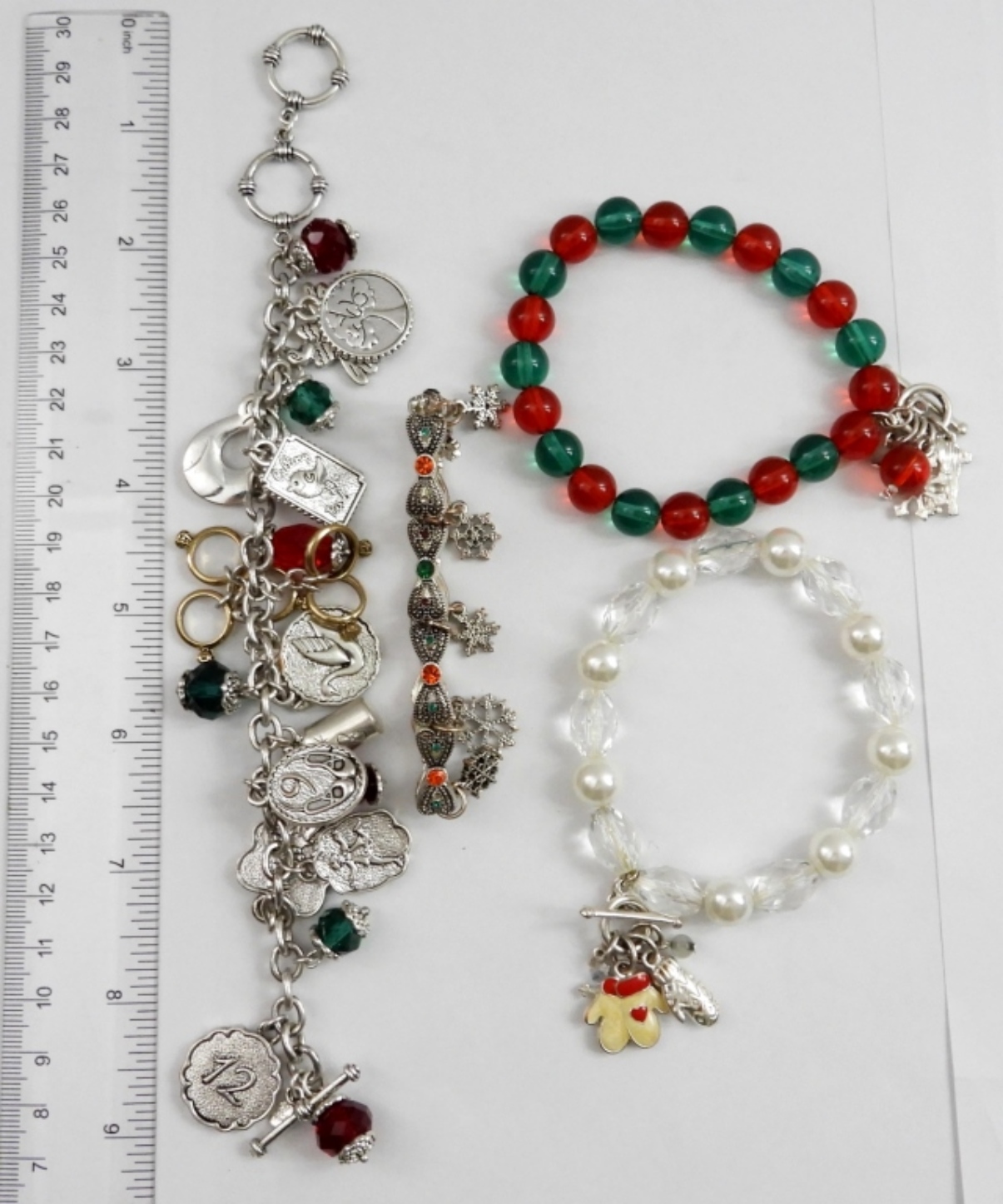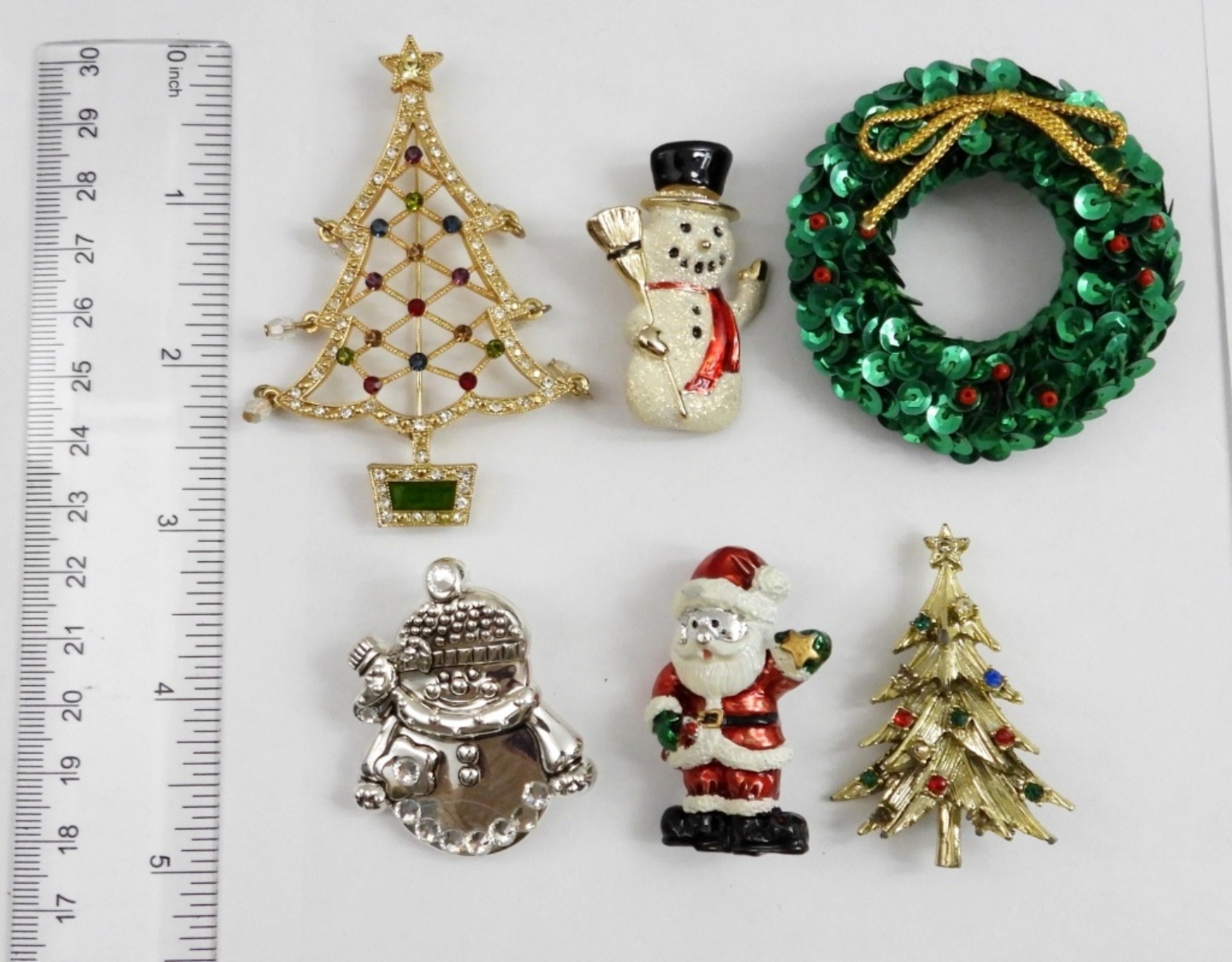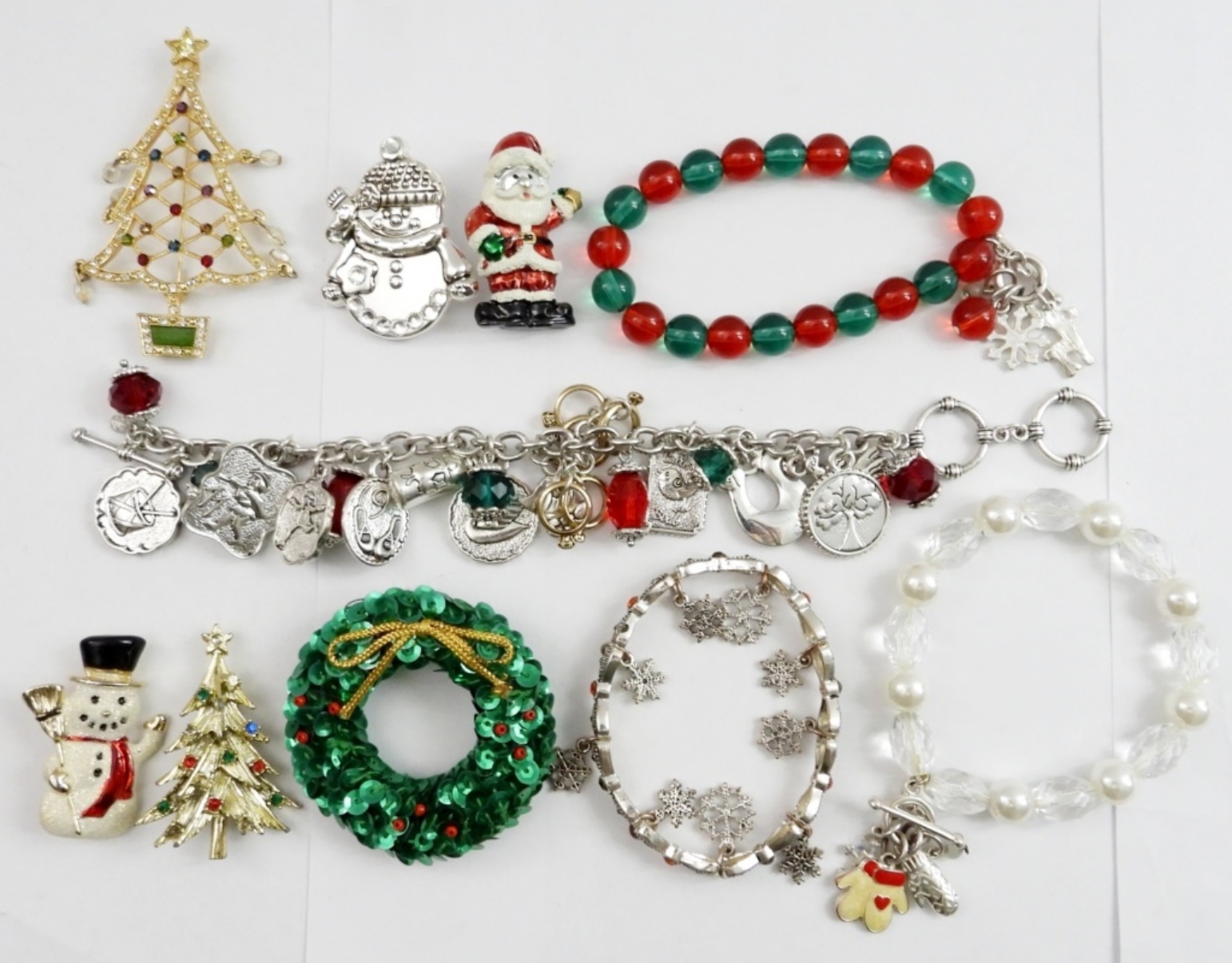 (6) CHRISTMAS BROOCH PINS, (4) BRACELETS WITH CHRISTMAS & SNOWFLAKE CHARMS