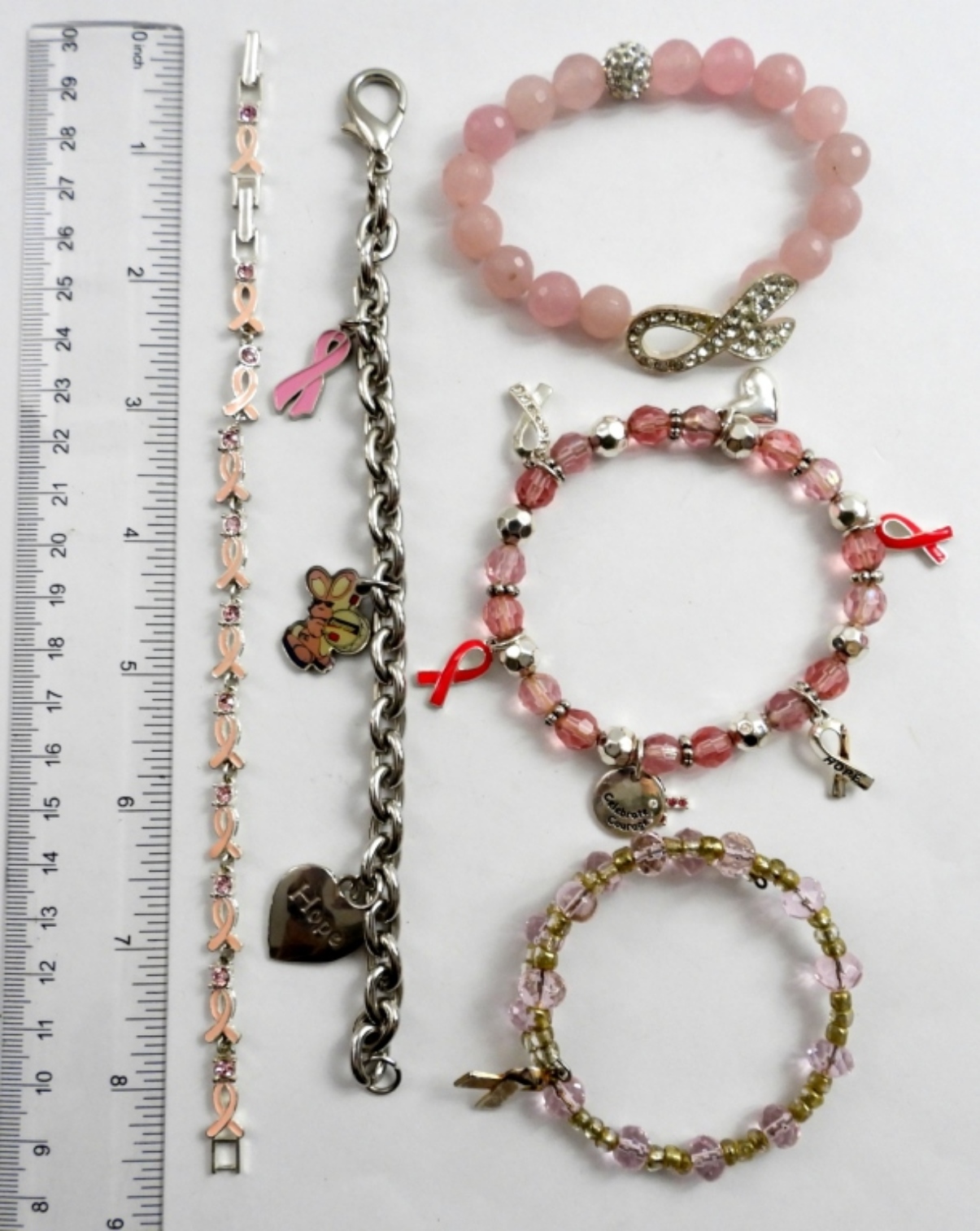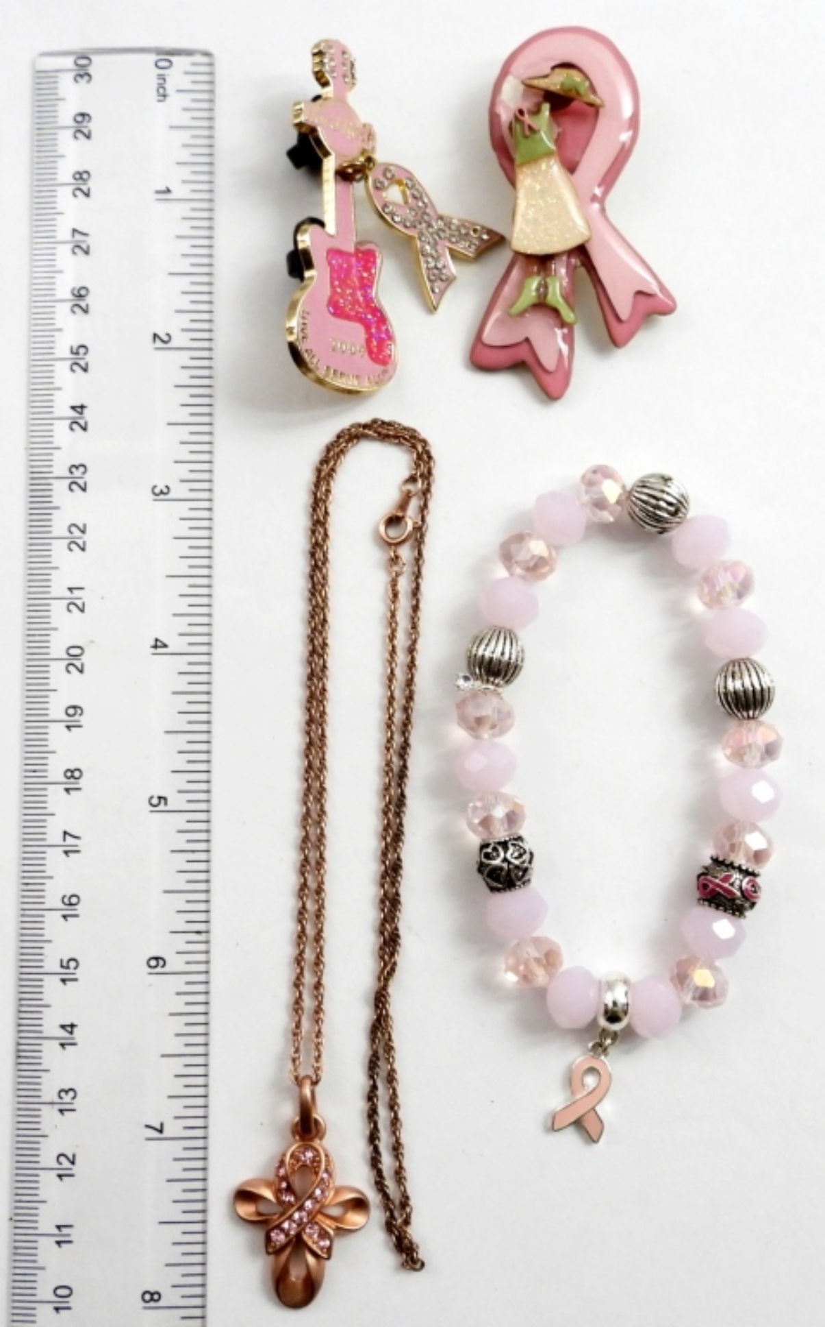 PINK BREAST CANCER AWARENESS RIBBON JEWELRY, (6) BRACELETS (2) BROOCH PINS (1) NECKLACE WITH PENDANT