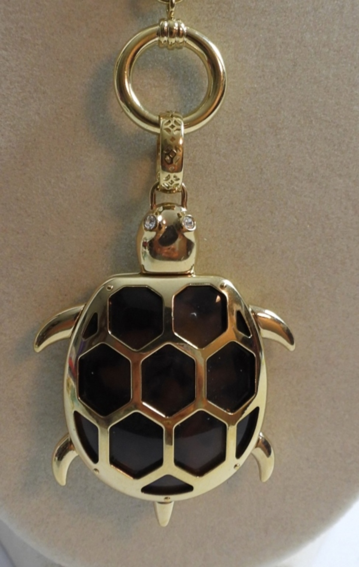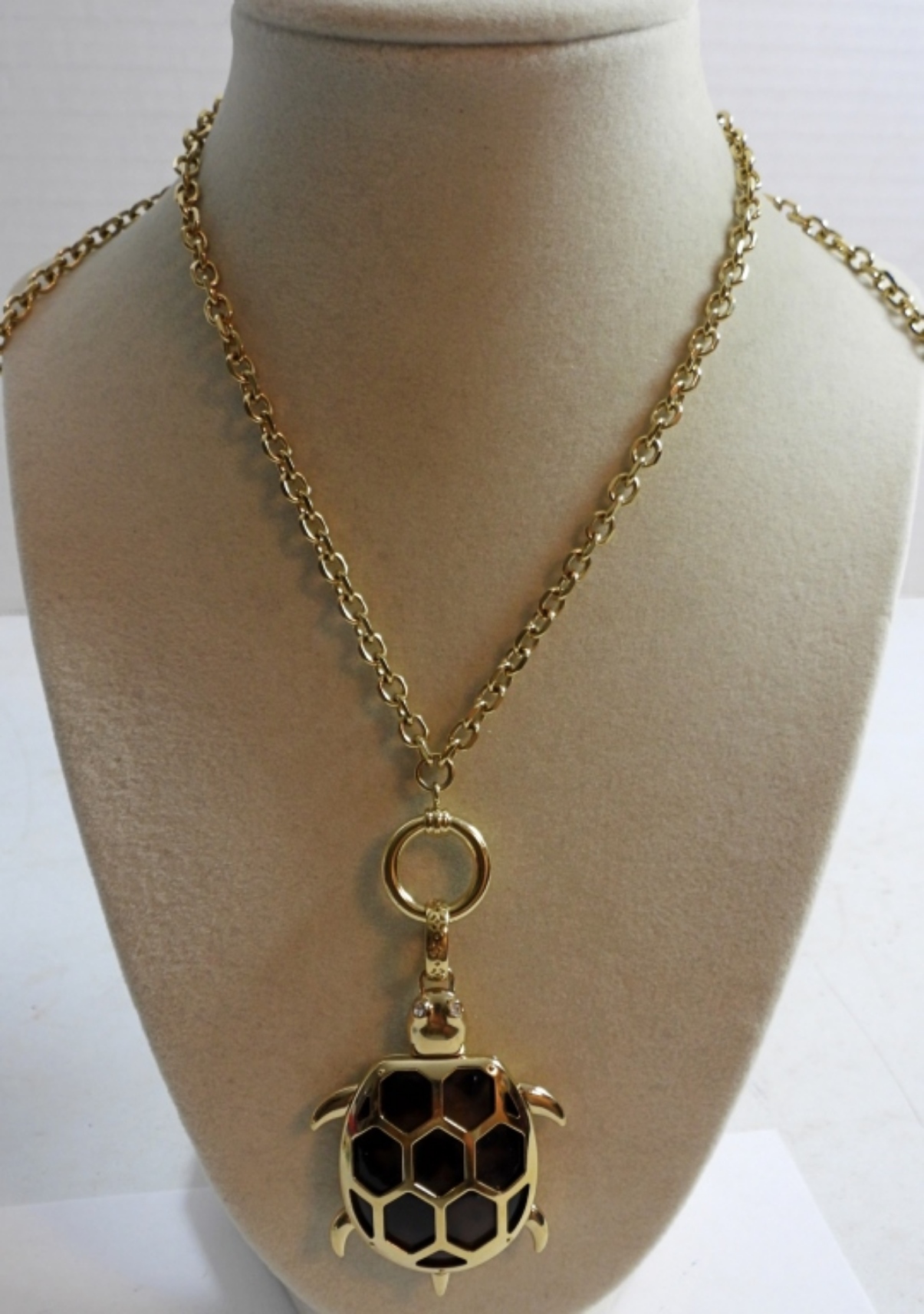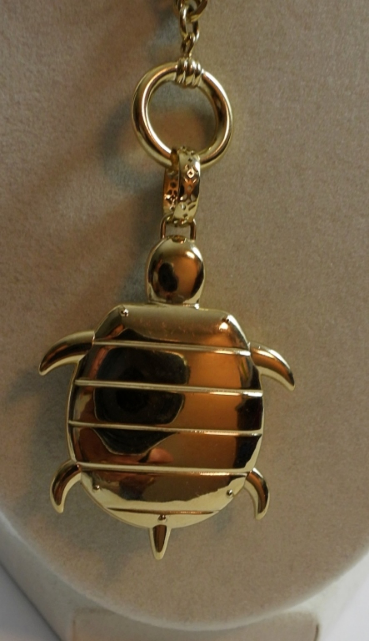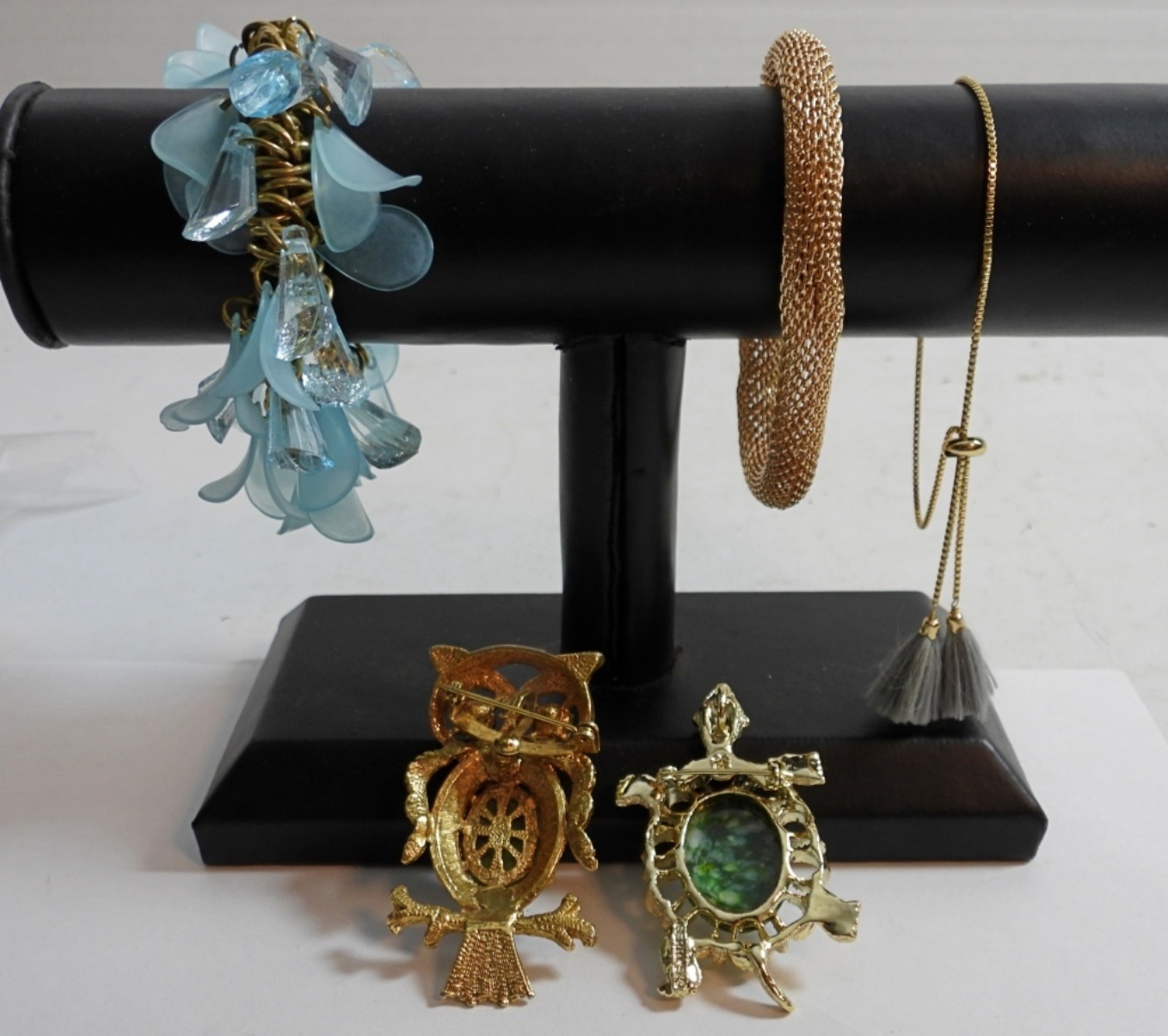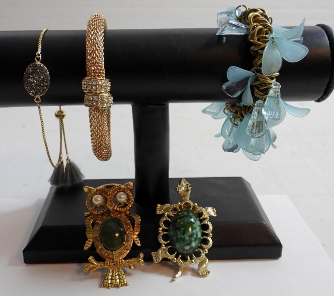 GOLD TONE TURTLE NECKLACE 18″. SILVER TONE TURTLE BROOCH, GOLD TONE OWL BROOCH. 3 GOLD TONE 7″ BRACELETS.