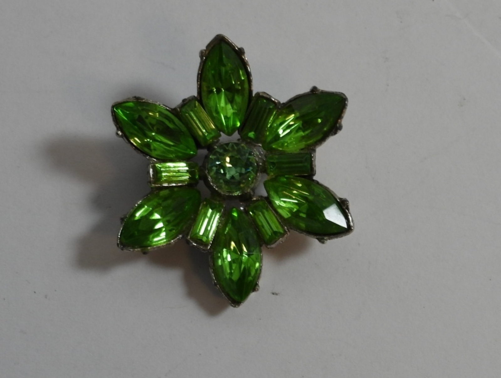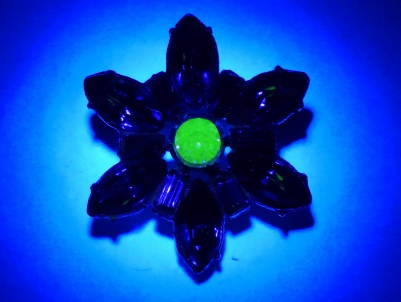 VINTAGE BROOCH, CENTER STONE IS URANIUM GLASS. 1.5″.