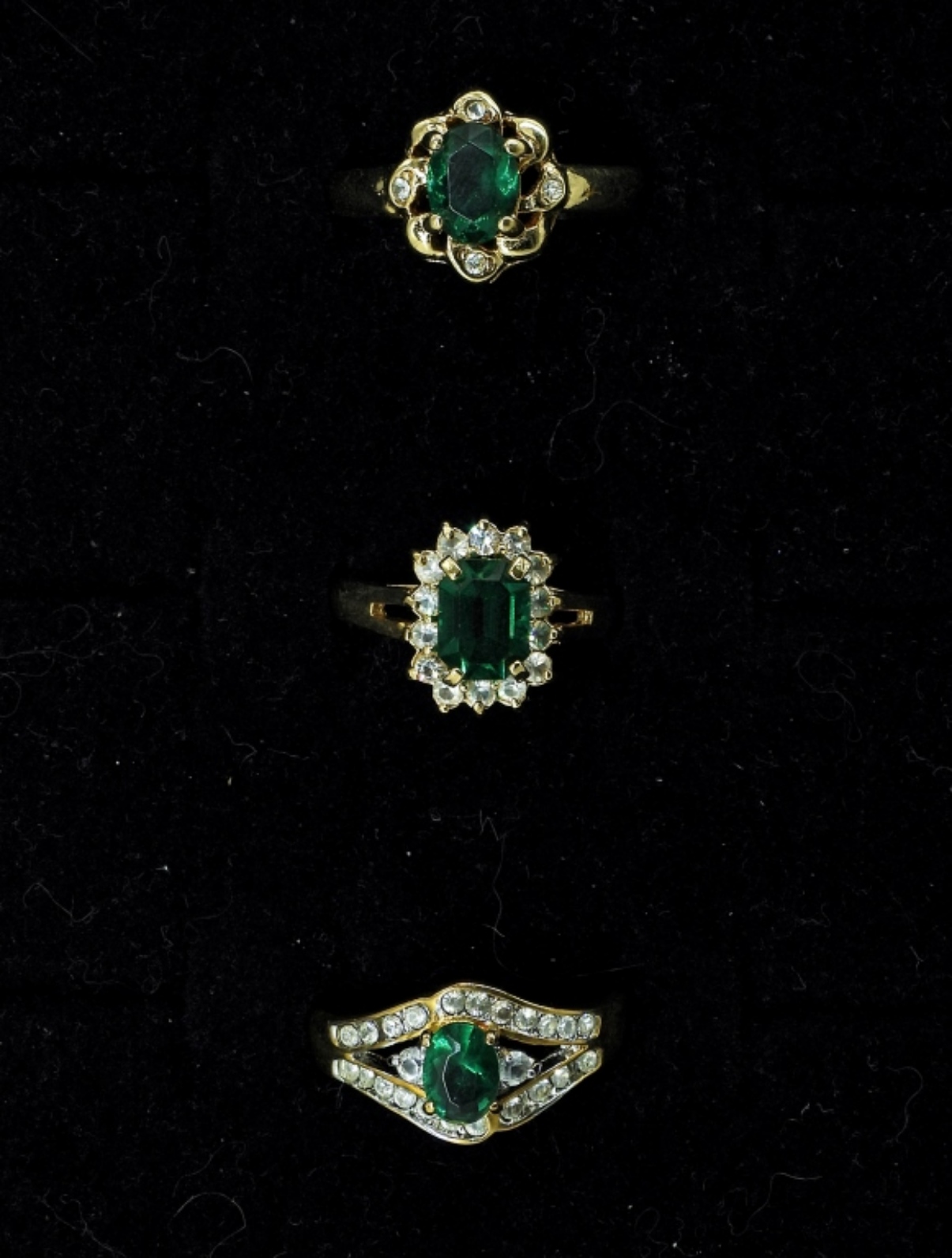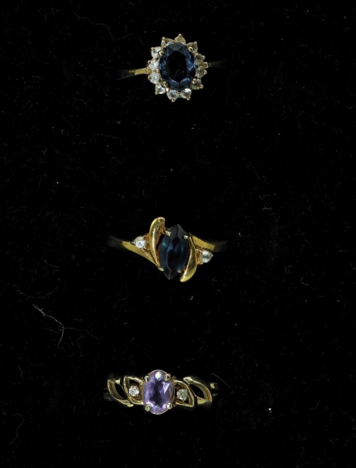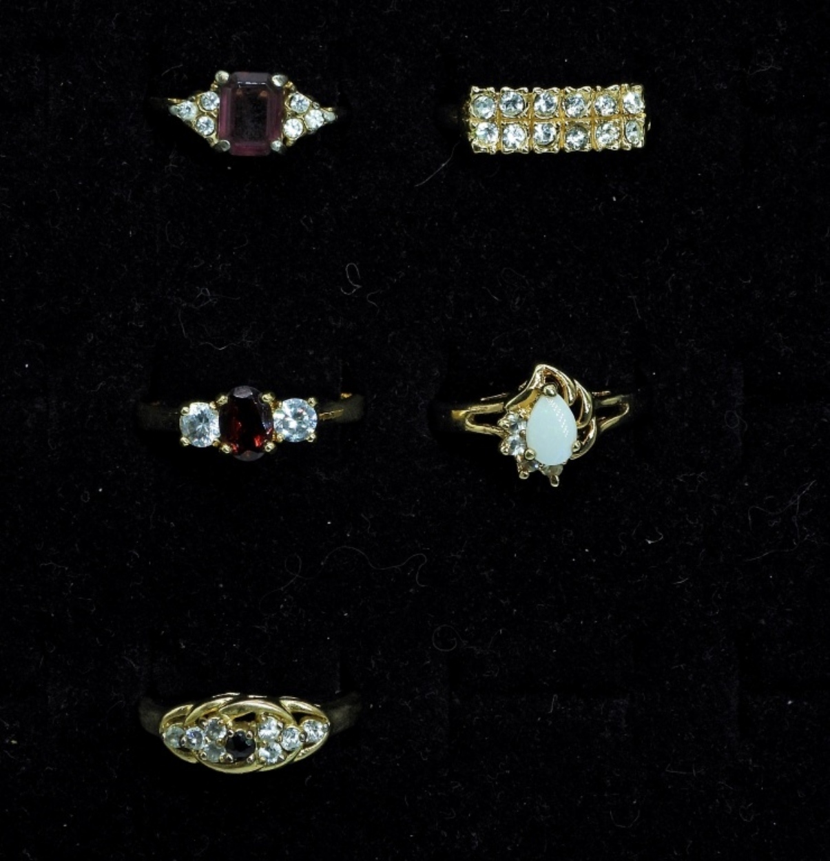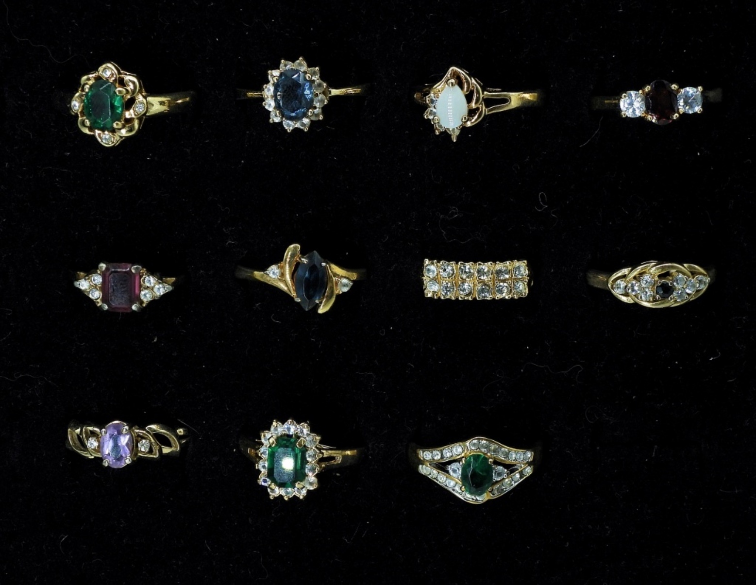 11 GOLD TONE FASHION RINGS WITH GEMSTONES. SIZES 8, 8.5, 9, 10