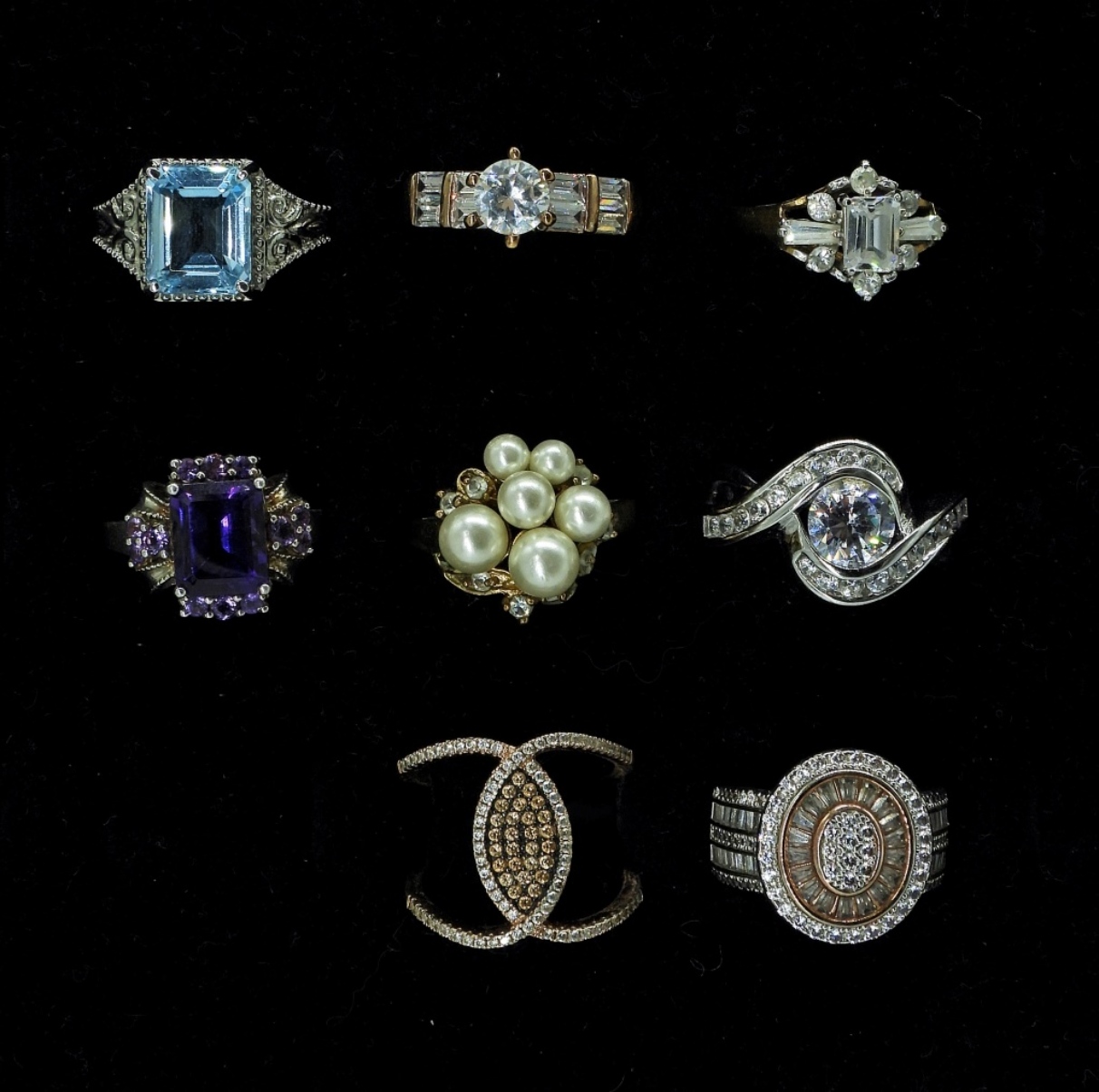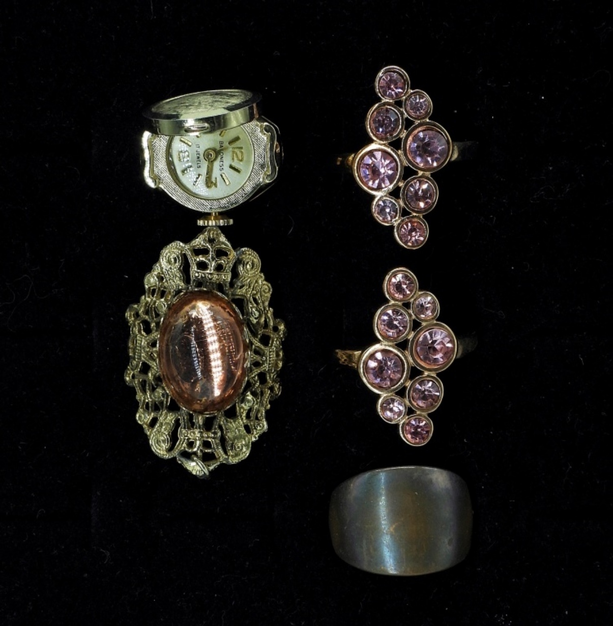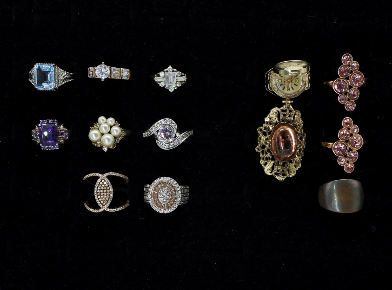 13 GOLD AND SILVER TONE FASHION RINGS WITH GEMSTONES. ONE WATCH RING, SIZE 5. RINGS ARE SIZES 5, 7, 8, 9, 10.