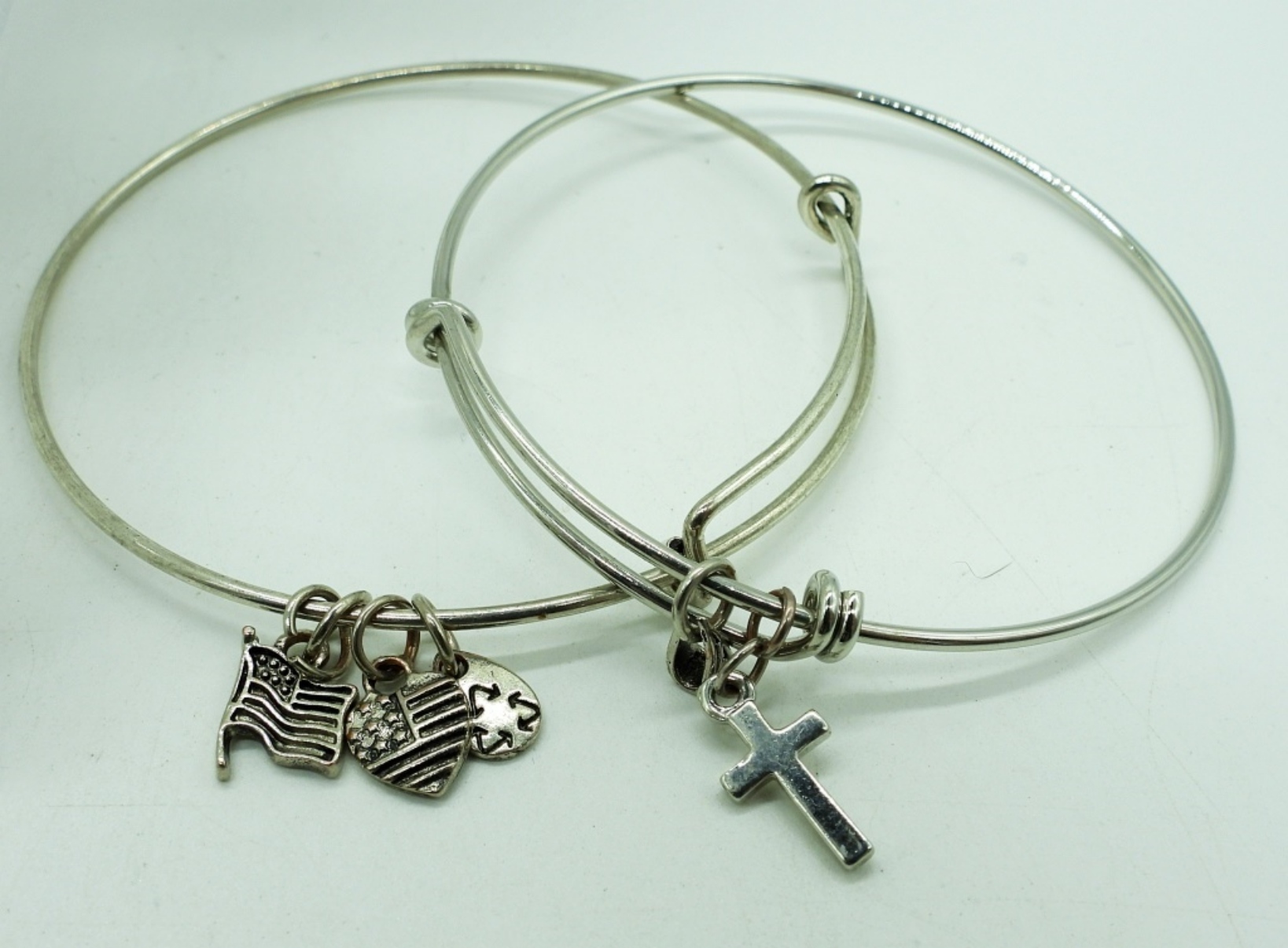 THREE SILVER TONE BANGLE BRACELETS, TWO ARE MODERN CHARM BRACELETS. THE OTHER HAS LARGE CLEAR PLASTIC GEMSTONES WRAPPED IN WIRE. 8″.