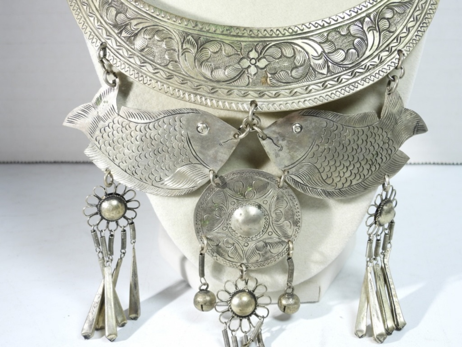 VINTAGE HAND MADE THAILAND HILL TRIBE ETCHED FISH BIB STYLE NECKLACE. 6″ WIDE 11″ LONG. VERY DETAILED, VERY PRETTY!