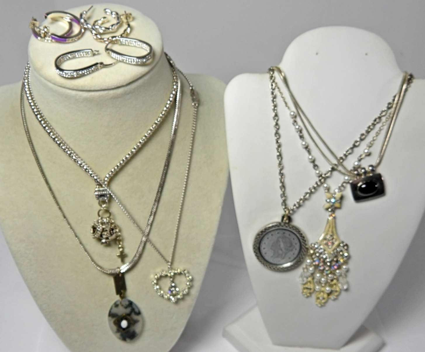 3 VERY NICE SILVER TONE EARRINGS. 1 7INCH SILVER TONE CHARM BRACELET. 5 SILVER TONE CHAINS WITH PENDANTS VARYING IN SIZE FROM 16-24INCHES