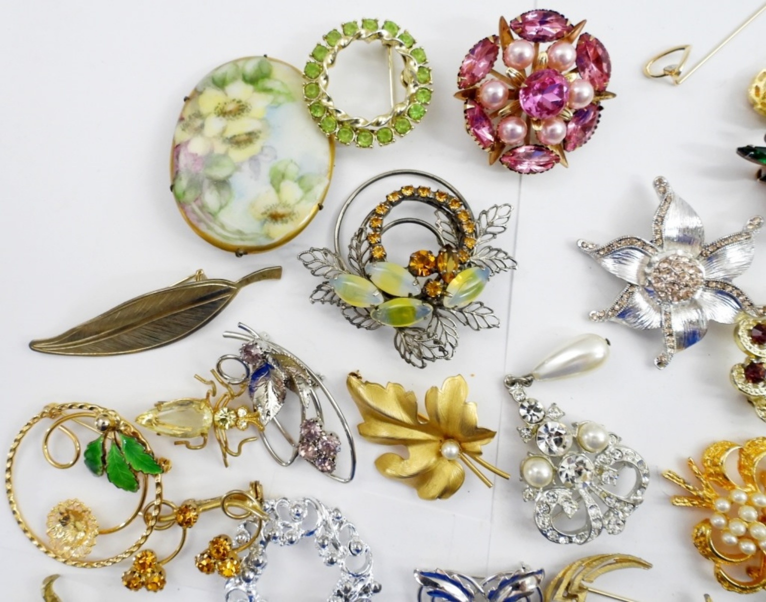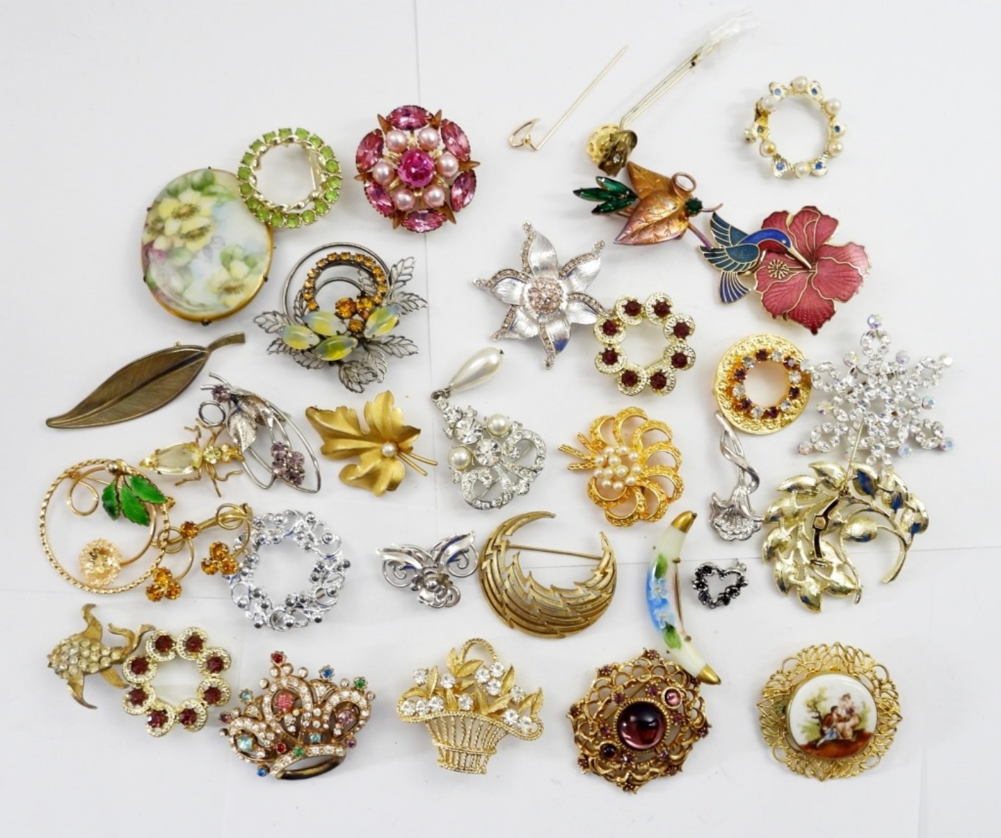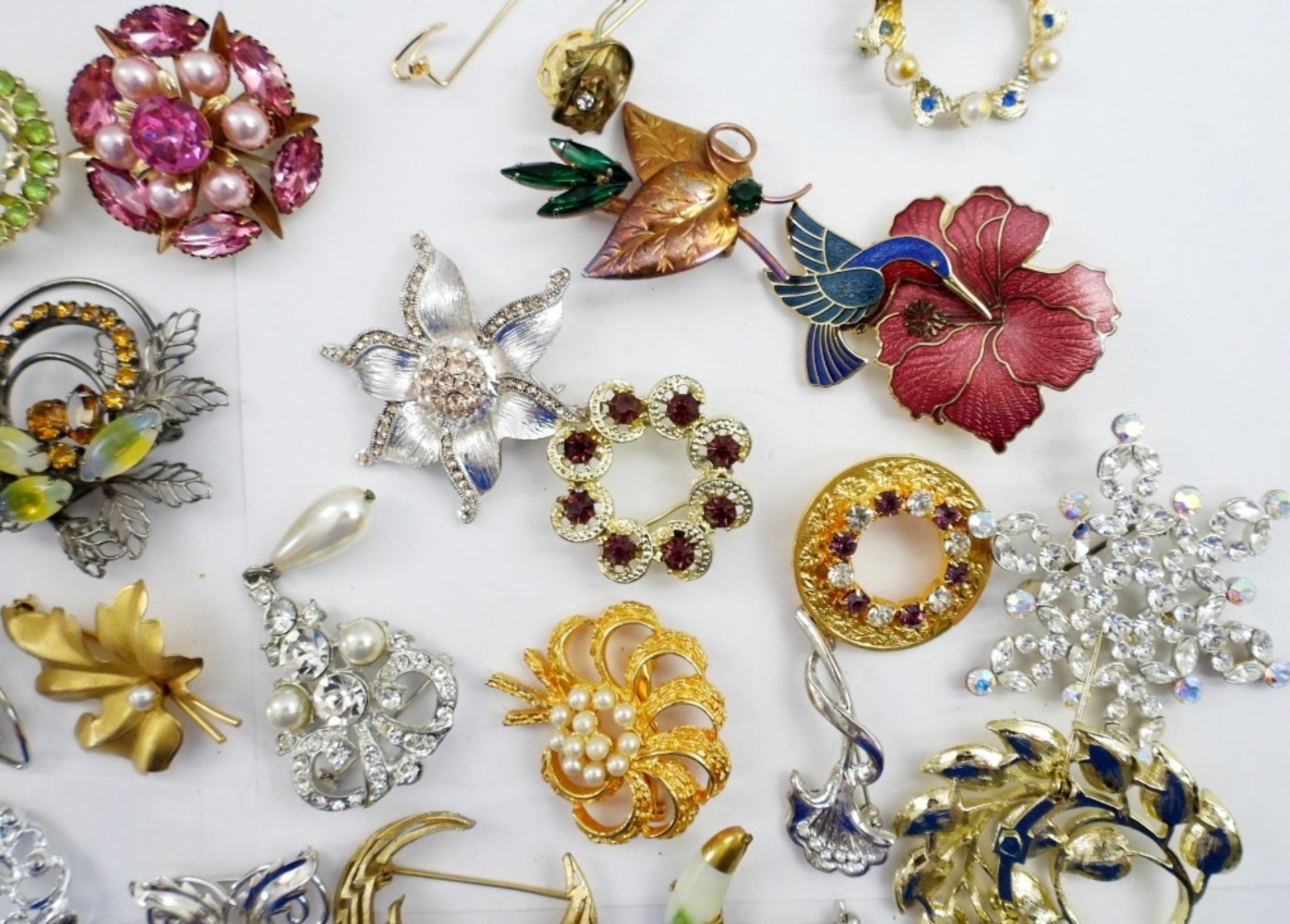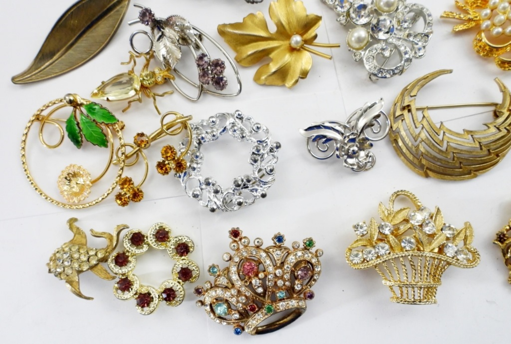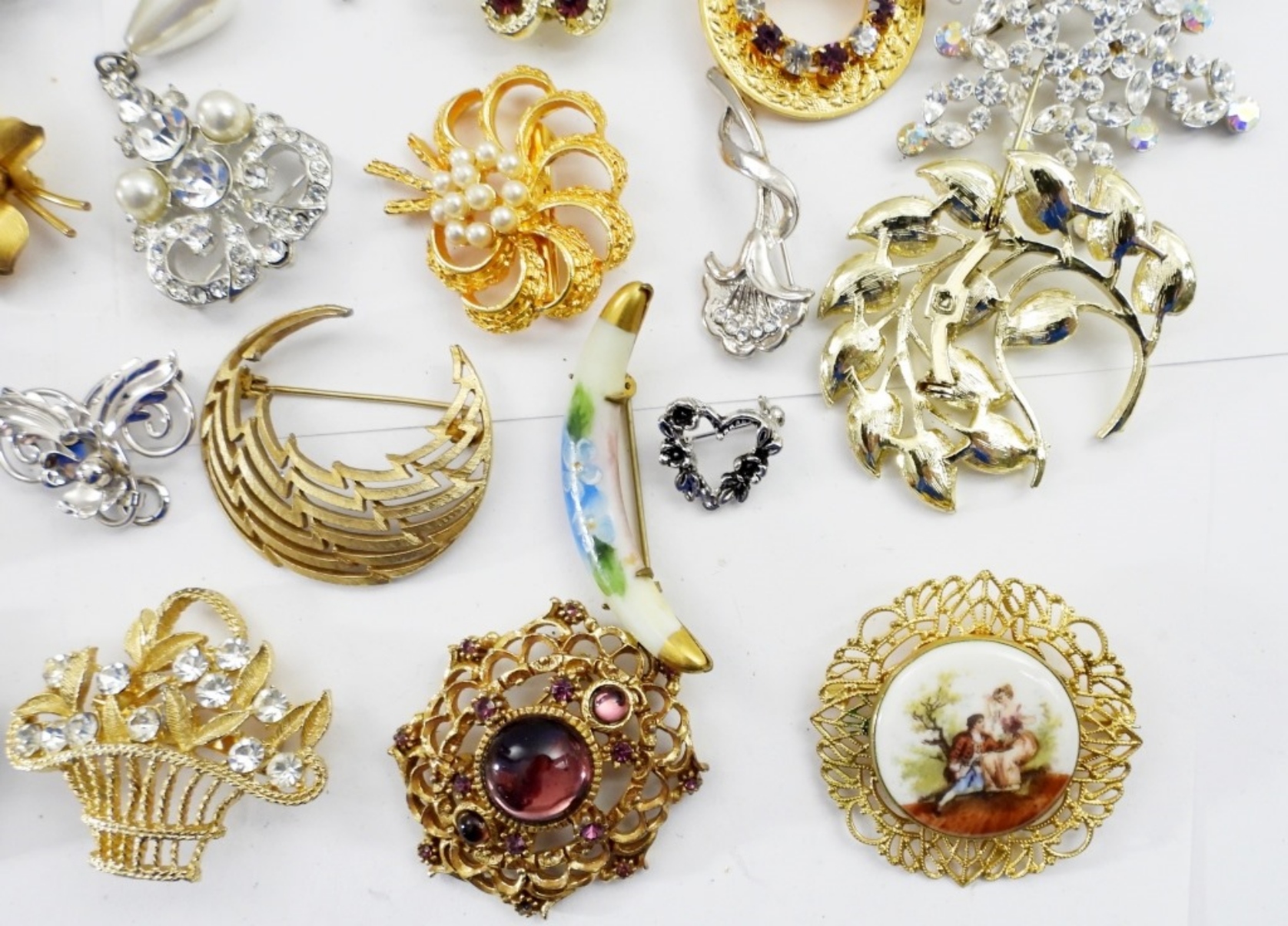 35 VINTAGE ASSOERDED BROOCHES WITH VARIOUS RHINESTONES, BOTH GOLD AND SILVER TONE