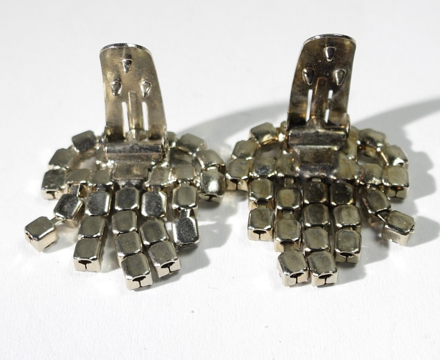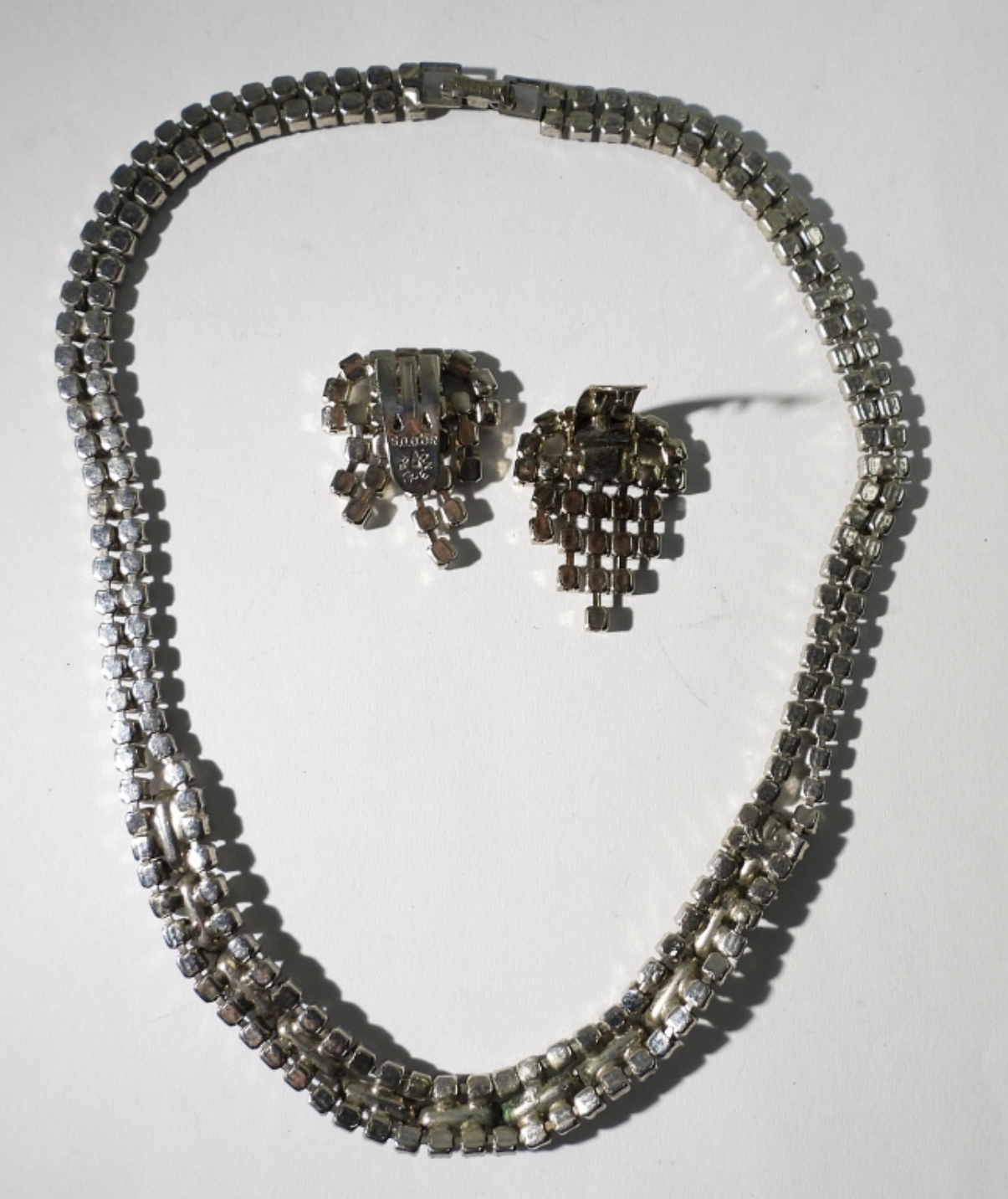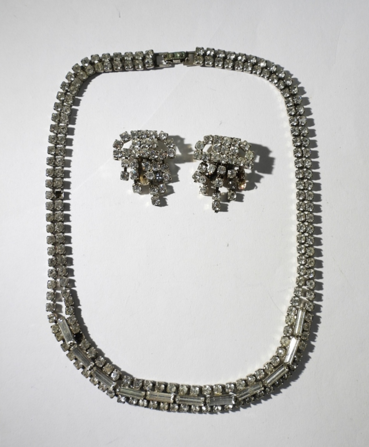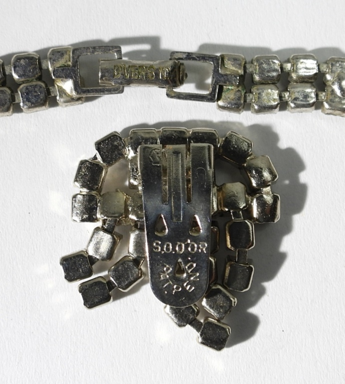 D’VERS RHINESTONE NECKLACE (MISSING 2 SMALL RHINESTONES, 15″. S.G. D’OR SIGNED VINTAGE RHINESTONE SHOE CLIPS (MISSING 1 RHINESTONE).