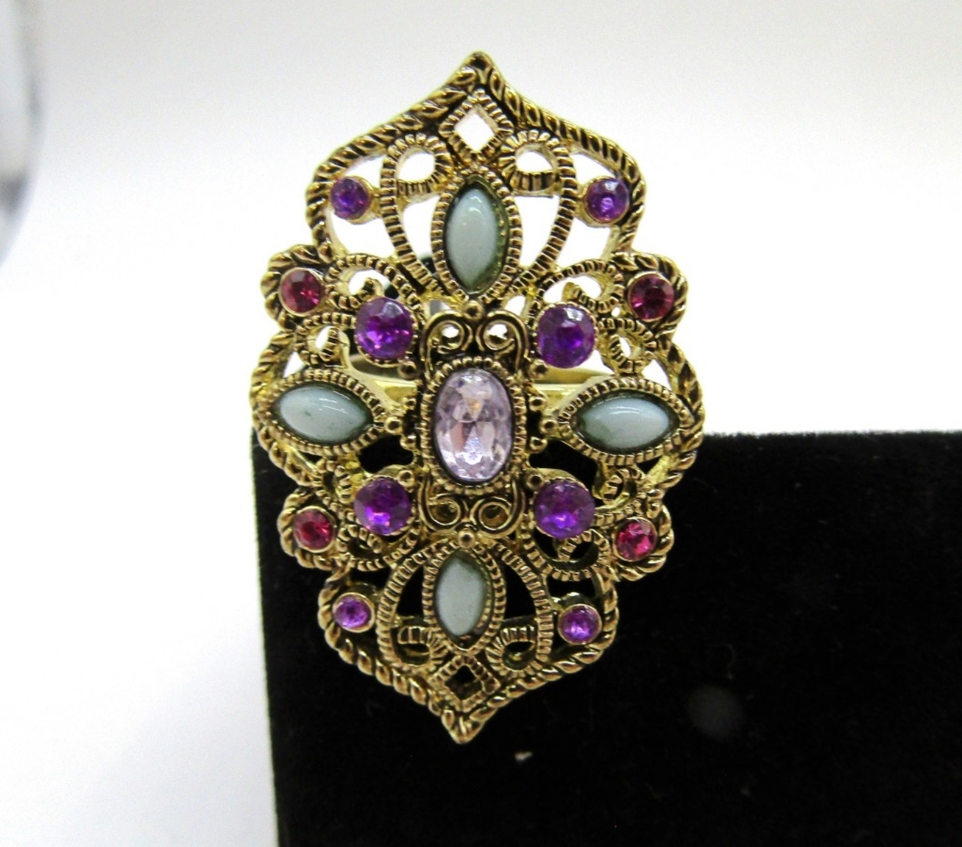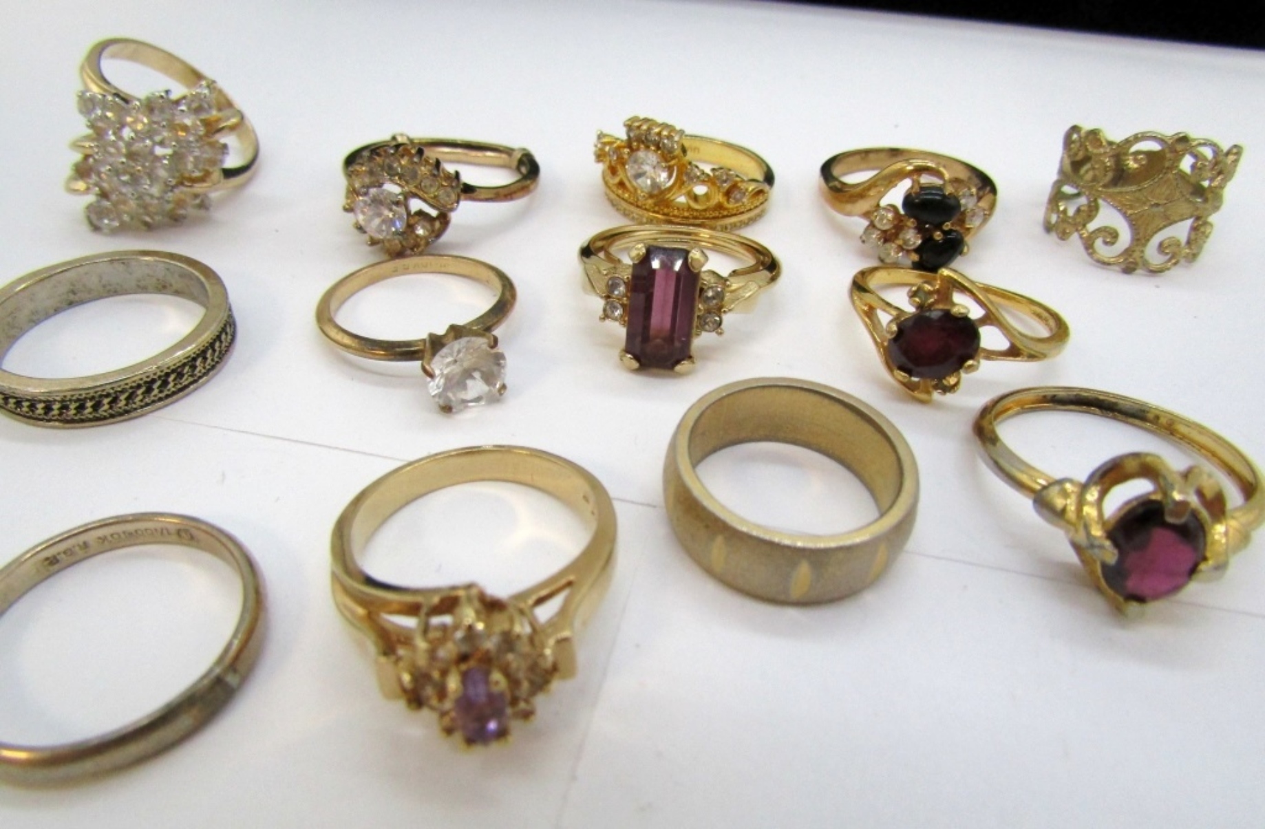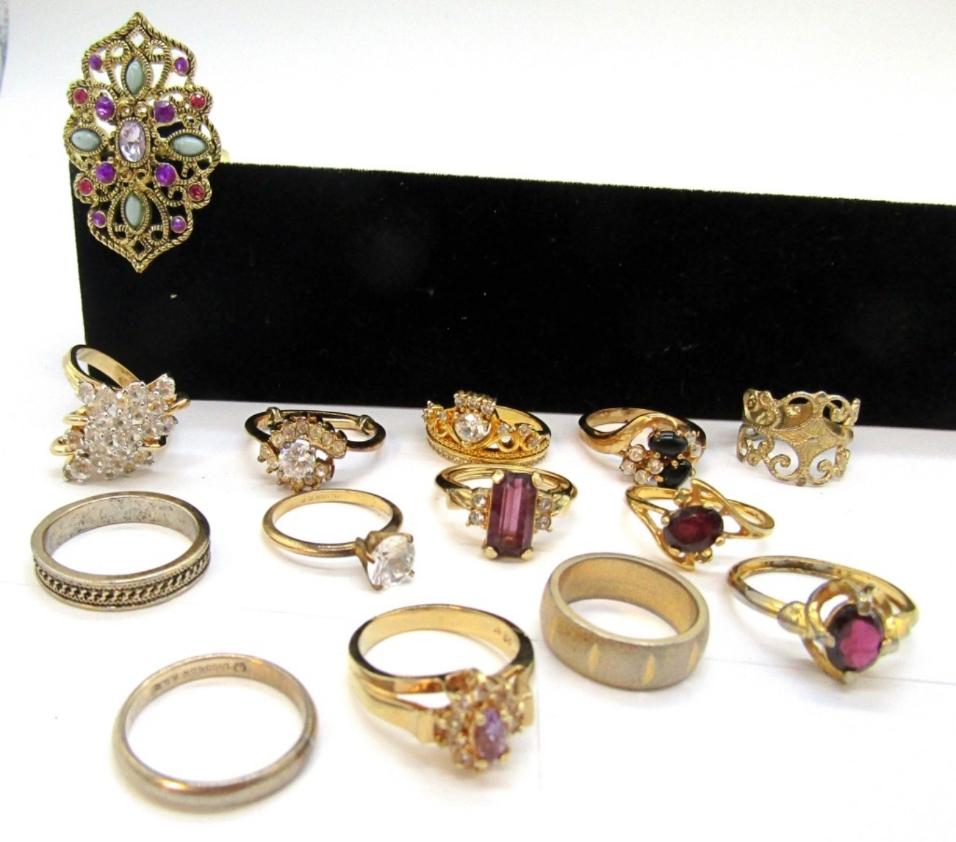 FOURTEEN GOLD TONE FASHION GEMSTONE RINGS. ONE BAND IS MISSHAPEN. STYLES VARY. SIZES 5-9