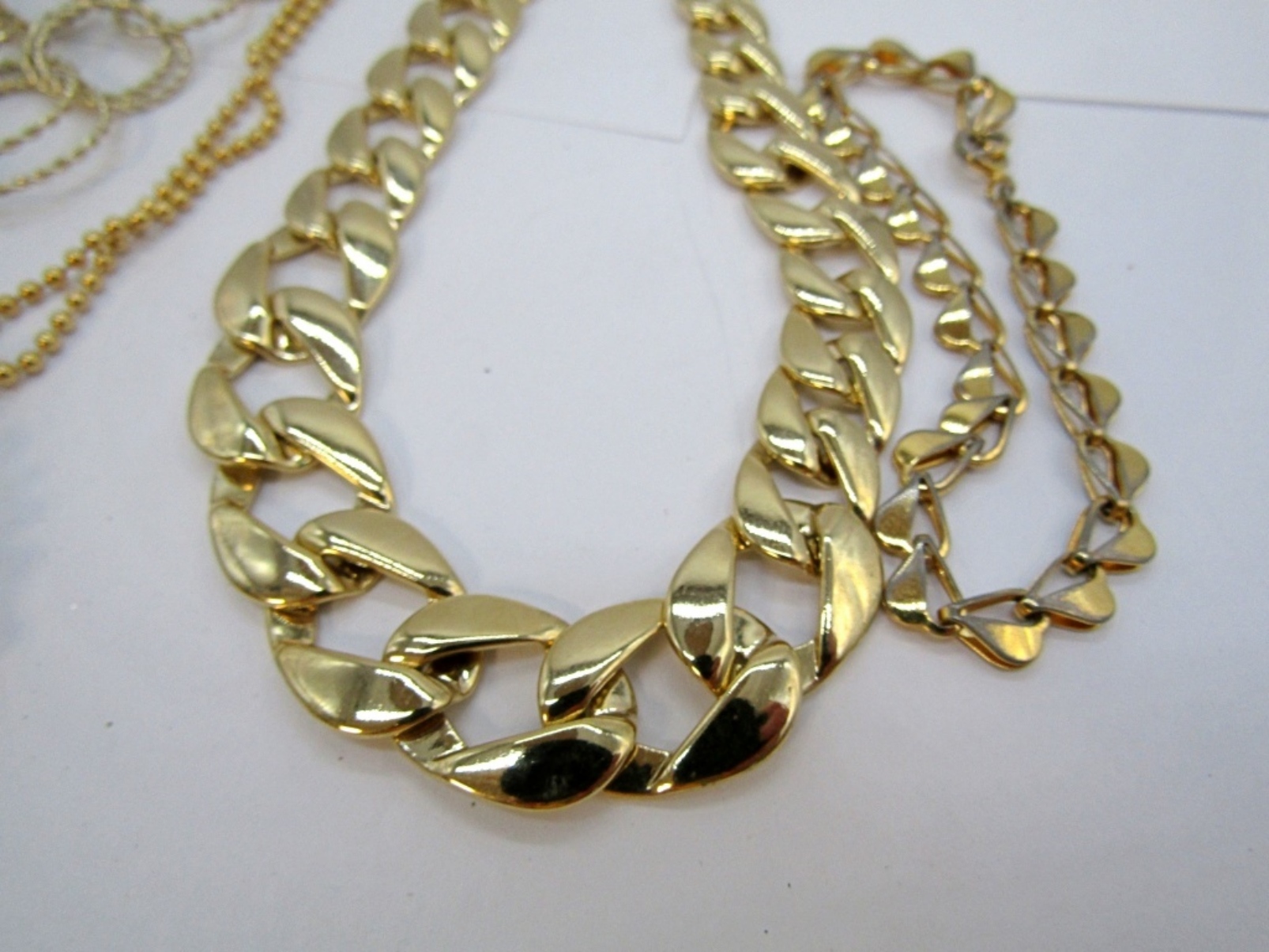 FOUR GOLD TONE NECKLACES, LENGTHS VARY 18-30″. ONE GOLD TONE 7″ BRACELET.