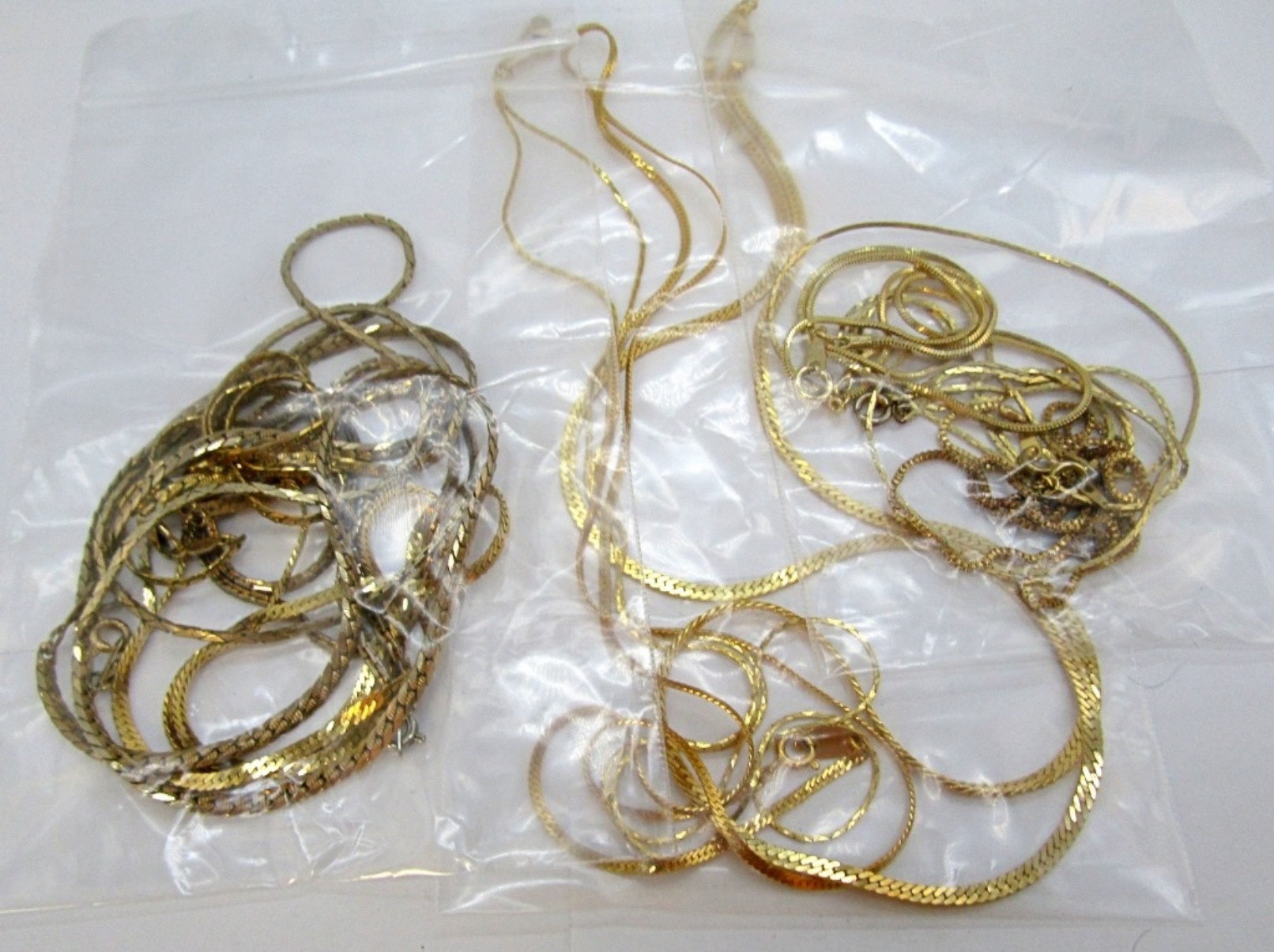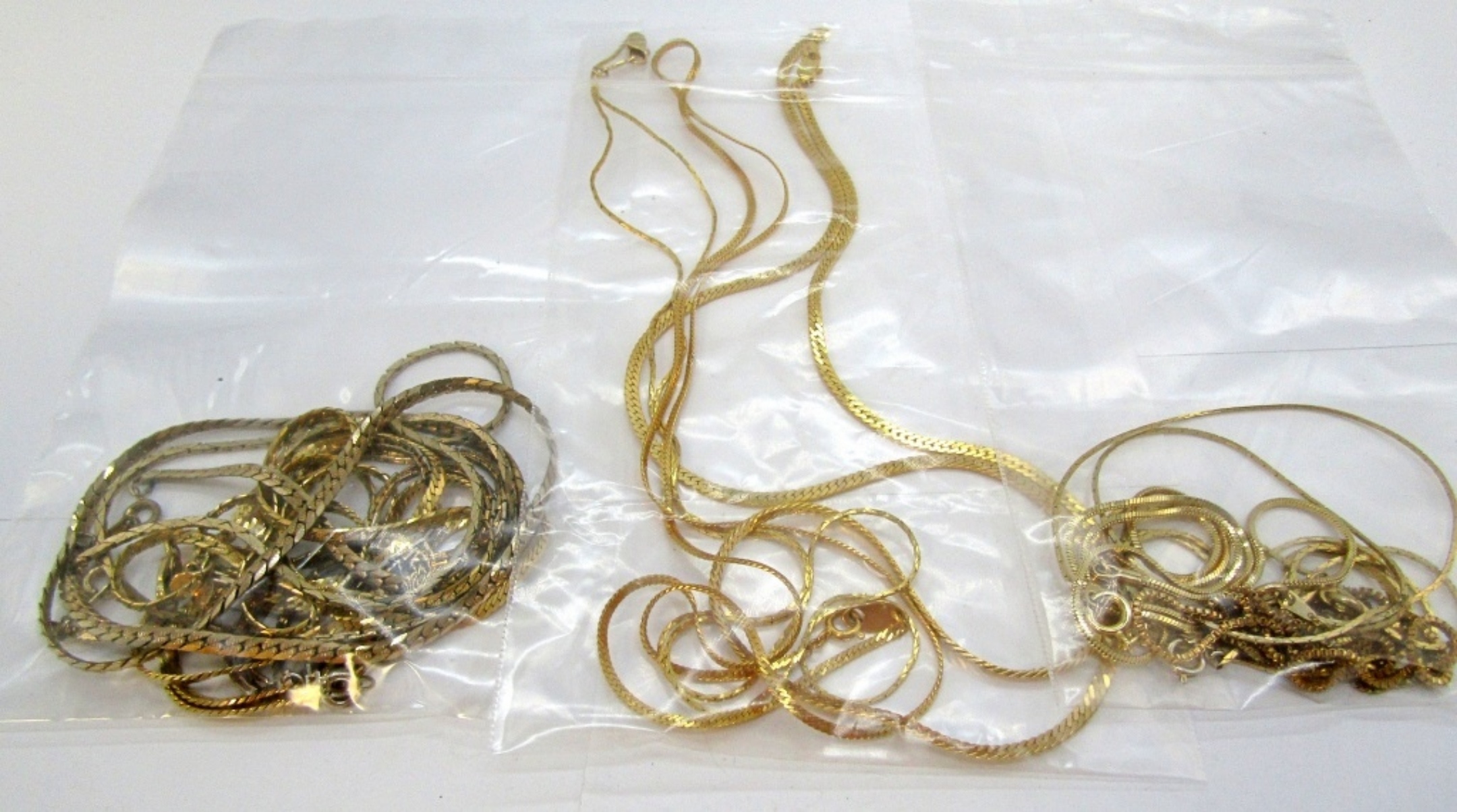TWELVE GOLD TONE FASHION CHAINS IN SEVERAL STYLES. LENGTHS VARY 16-24″.