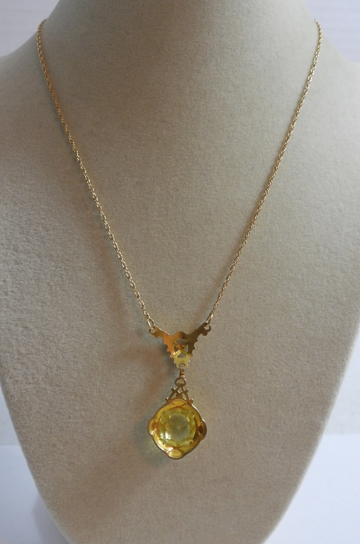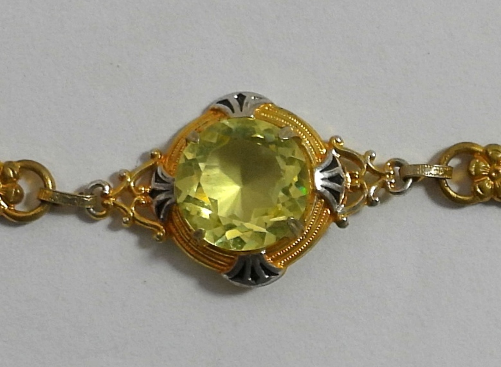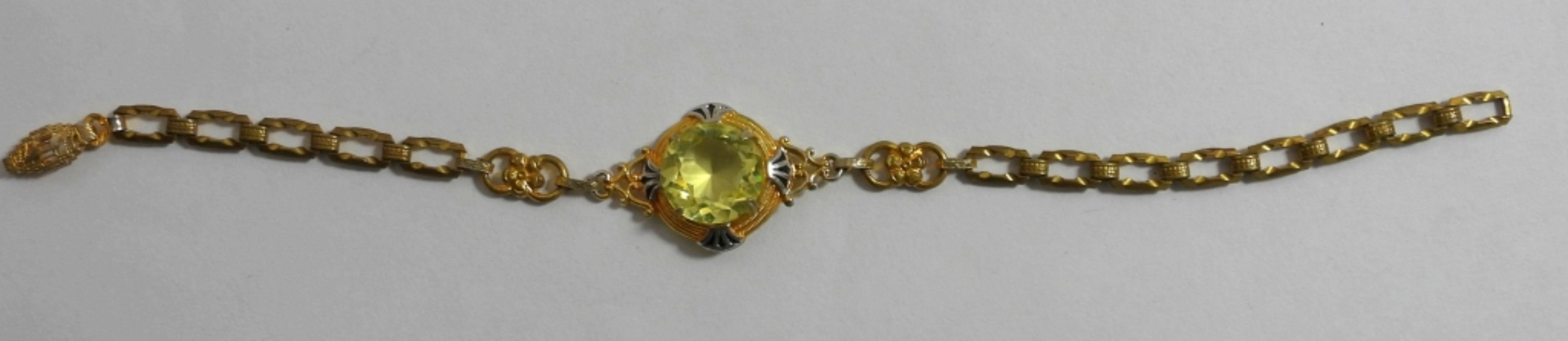GOLD TONE PERIDOT COLORED GEMSTONE NECKLACE (16″) & BRACELET (7″) SET. GOLD TONE FILIGREE RING WITH DIAMOND LIKE GEMSTONE, SIZE 9.