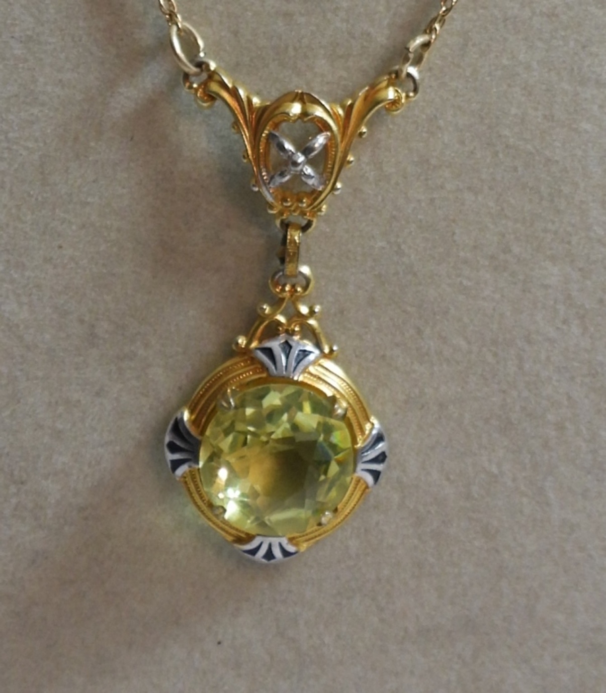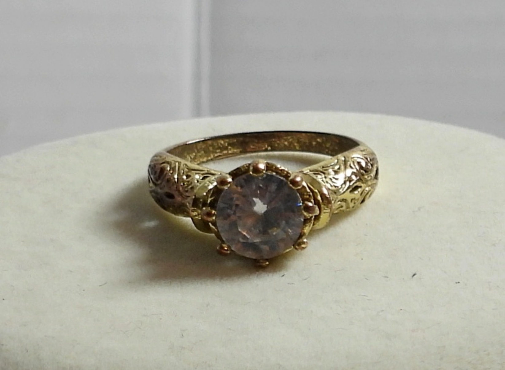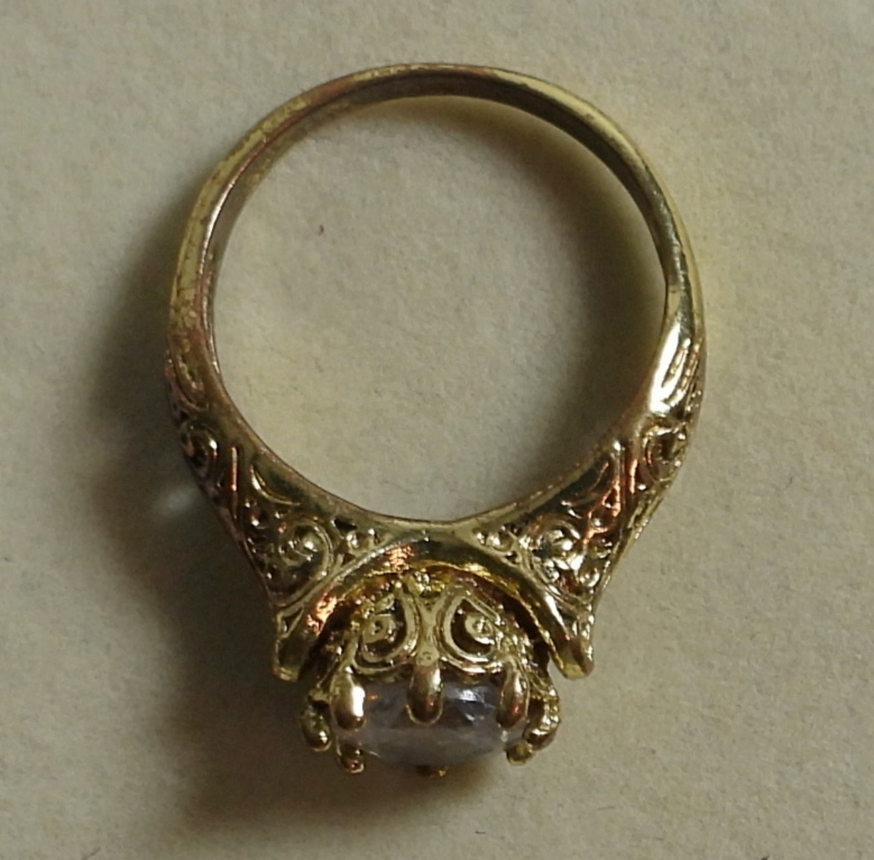 GOLD TONE PERIDOT COLORED GEMSTONE NECKLACE (16″) & BRACELET (7″) SET. GOLD TONE FILIGREE RING WITH DIAMOND LIKE GEMSTONE, SIZE 9.