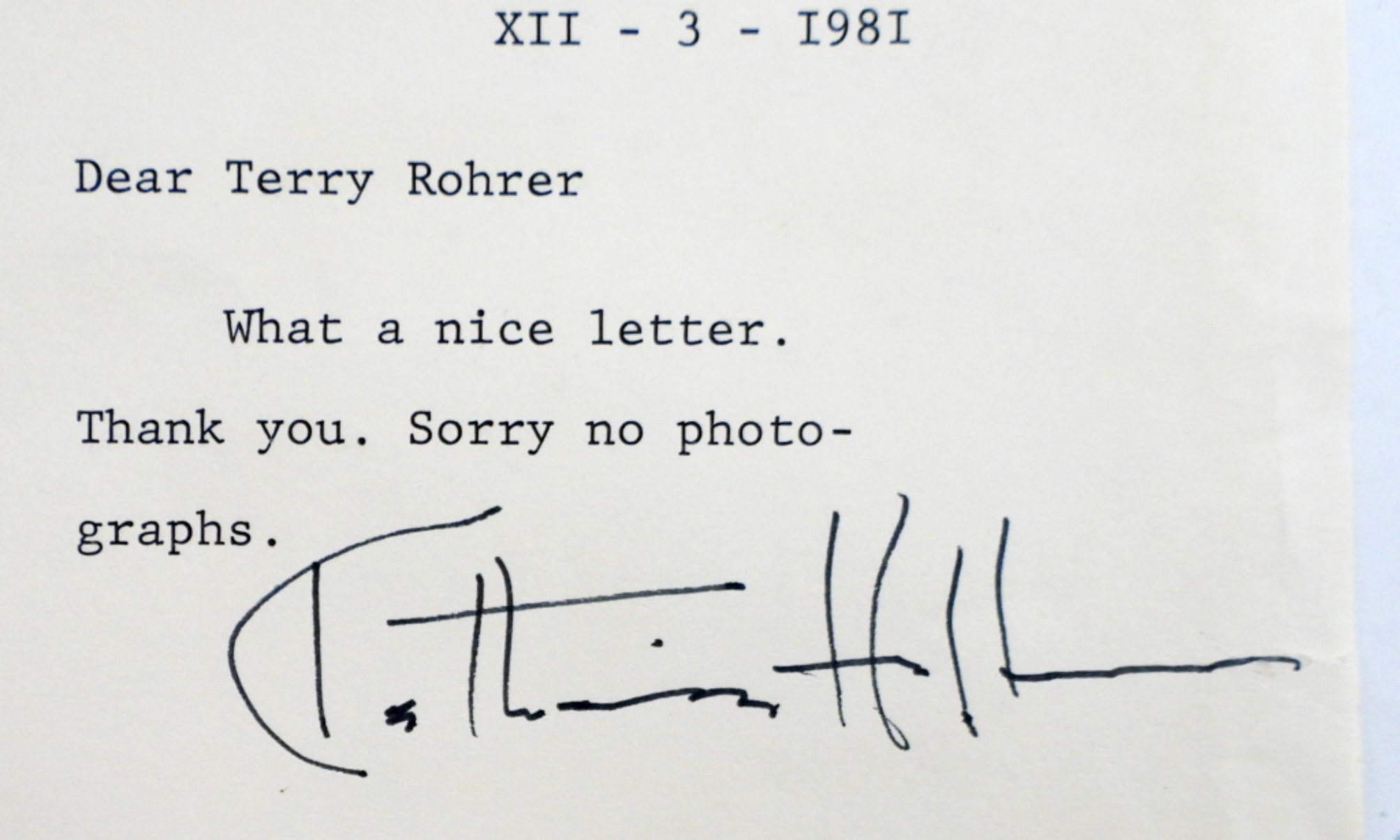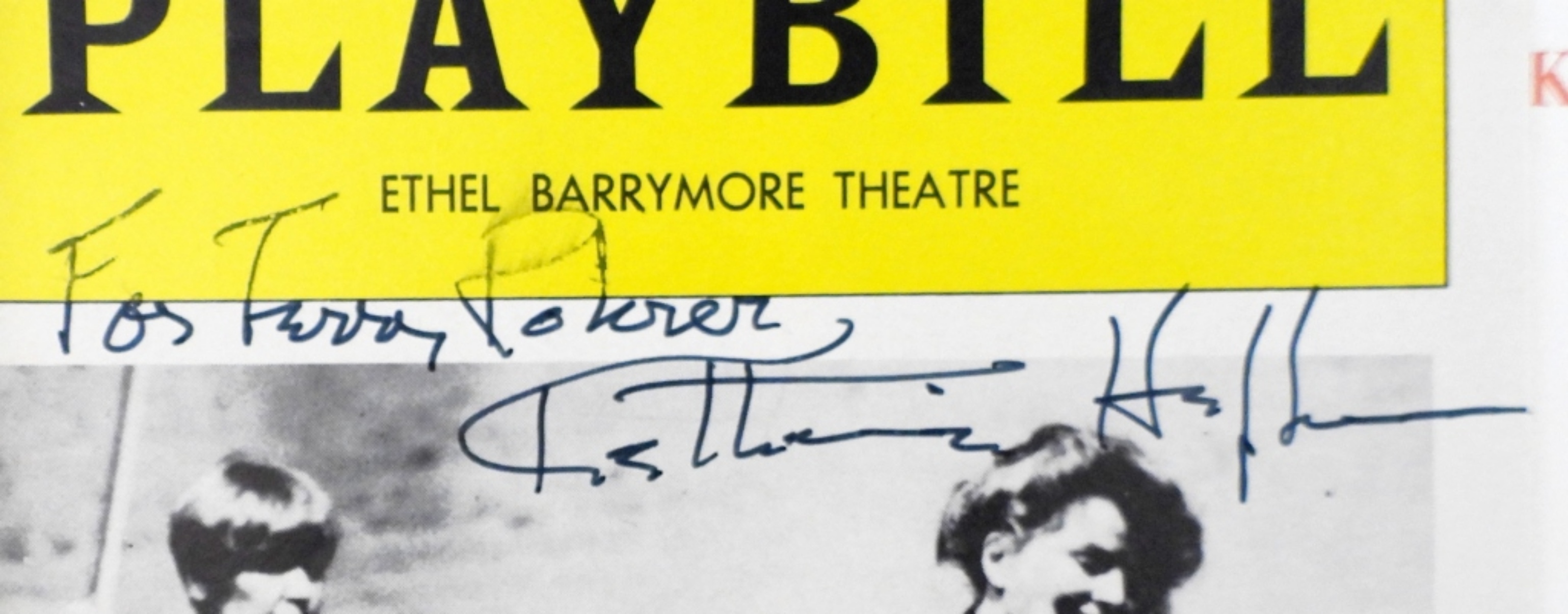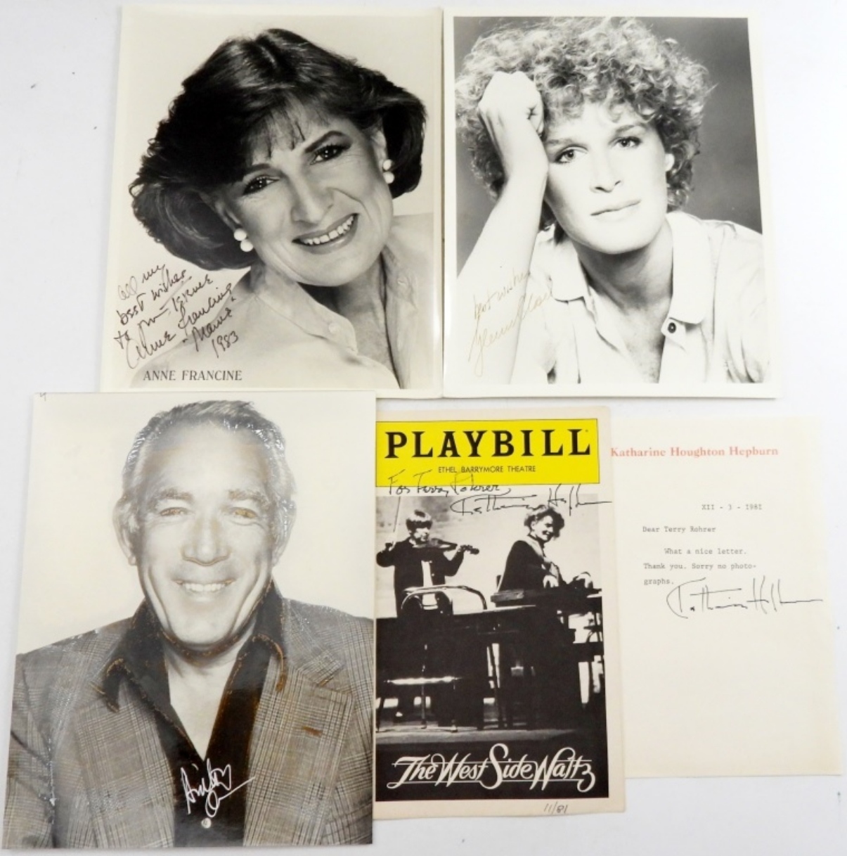 5 PIECE SIGNED AUTOGRAPH HEADSHOTS, ANTHONY QUINN,GLENN CLOSE,ANNE FRANCINE.& A 1981 SIGNED PLAY BILL BY KATHARINE HEPBURN WITH A SIGNED LETTERHEAD.NO COA.