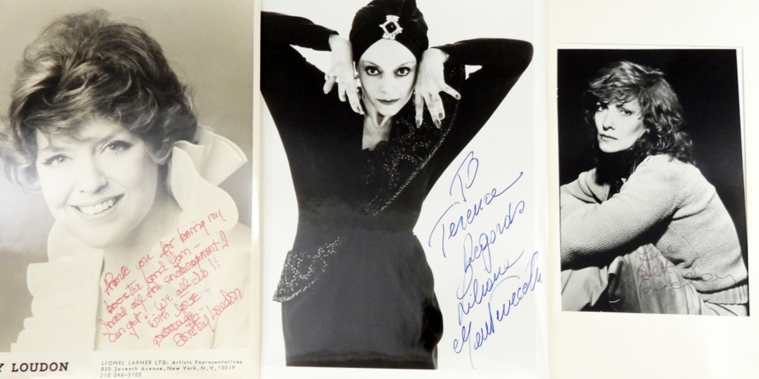AUTOGRAPHED 8X10 JUDY JUHN HEADSHOT,ANNE PITONIAK 8X10 SIGNED HEADSHOT, DORTHY LOUDON PRSONALIZED HEADSHOT AND PLAYBILL COVER,8X10 LILIAN MONTEVECCHI AUTOGRAPHED HEADSHOT,5X7 BETTY BUBKLEY SIGNED PHOTO. NO COA