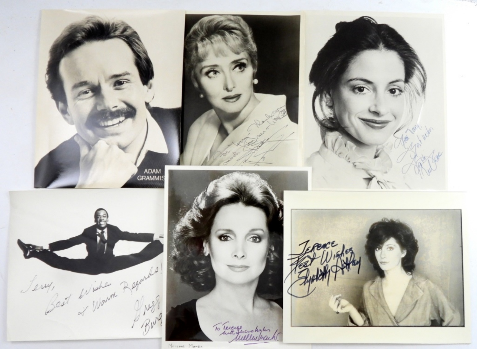 8X10 SIGNED CELESTE HOLM PICTURE AND PLAYBILL COVER , PATTY LUPONES AUTOGRAPHED 8X10 AND PLAYBILL COVER, A PICTURE OF ADAM GRAMMIS HEADSHOT, SIGNED 8X10 PHOTO OF GRESS BURGE, 8X10 AUTOGRAPHED MILLICENT MARTIN HEADSHOT,