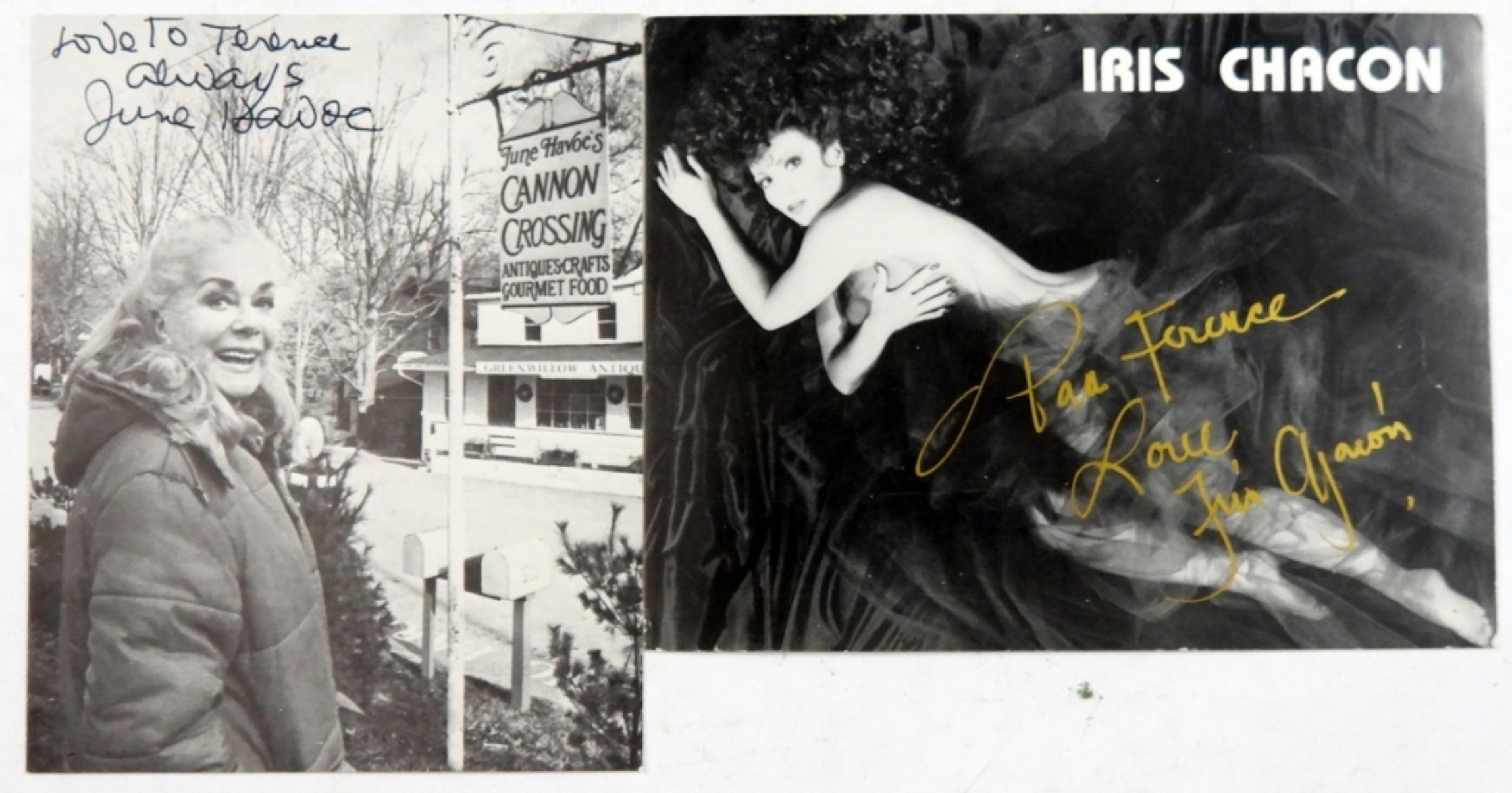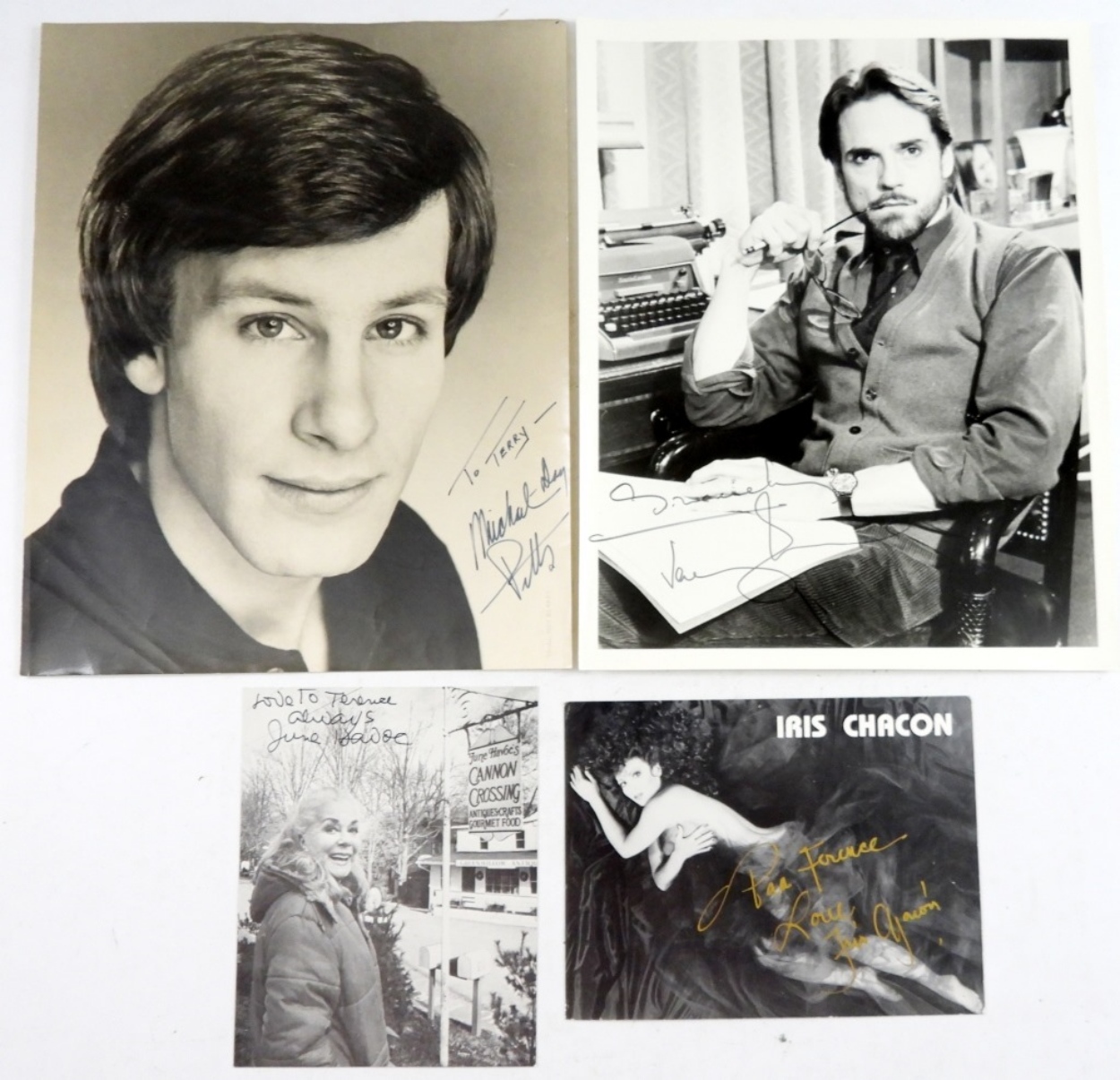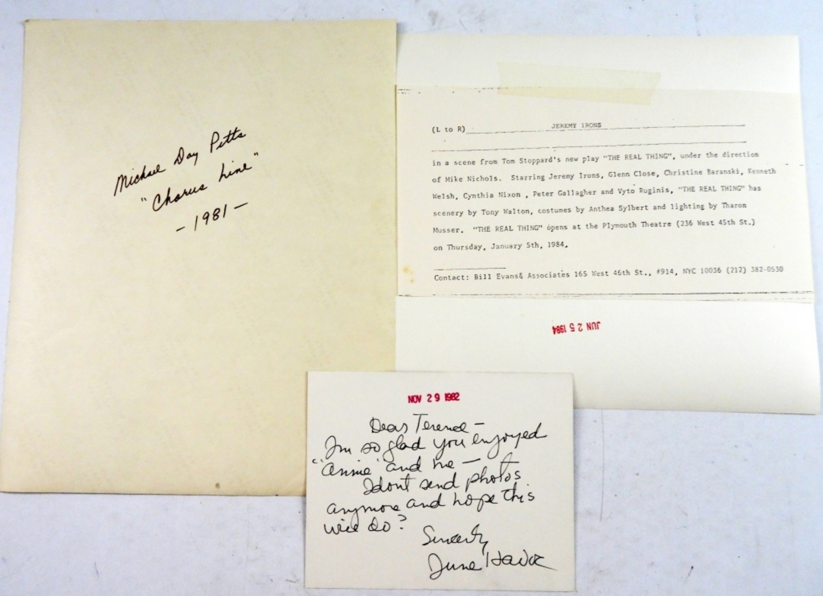SIGNED JEREMY IRONS 8X10 HEADSHOT , AN 8X10 MICHAEL DAY PITTS (CHORUS LINE )AUTOGRAPHED HEADSHOT,4X6 ARIS CHACON SIGNED PICTURE, A PERSONALIZED 4X6 JUNE HAVOC PHOTO SIGNED ON THE FRONT AND BACK OF PHOTO,NO COA