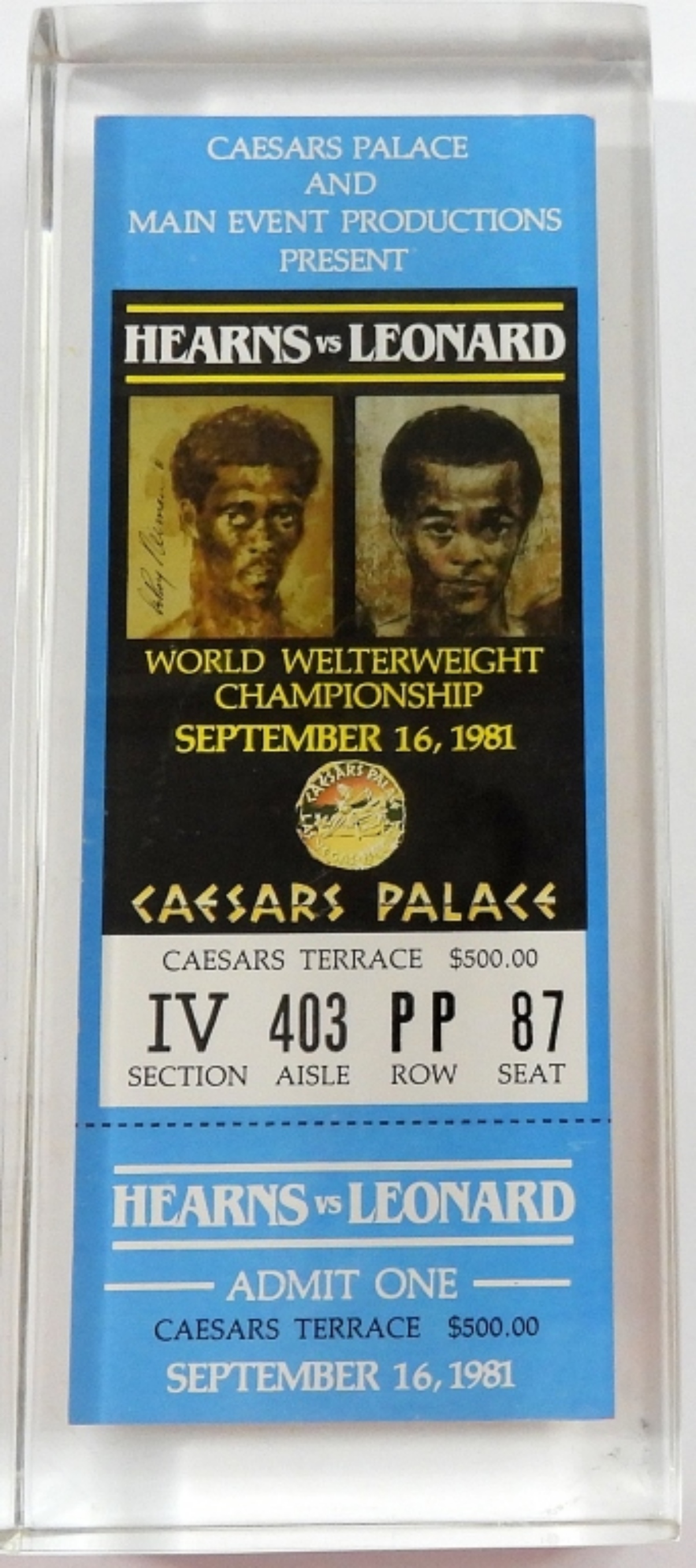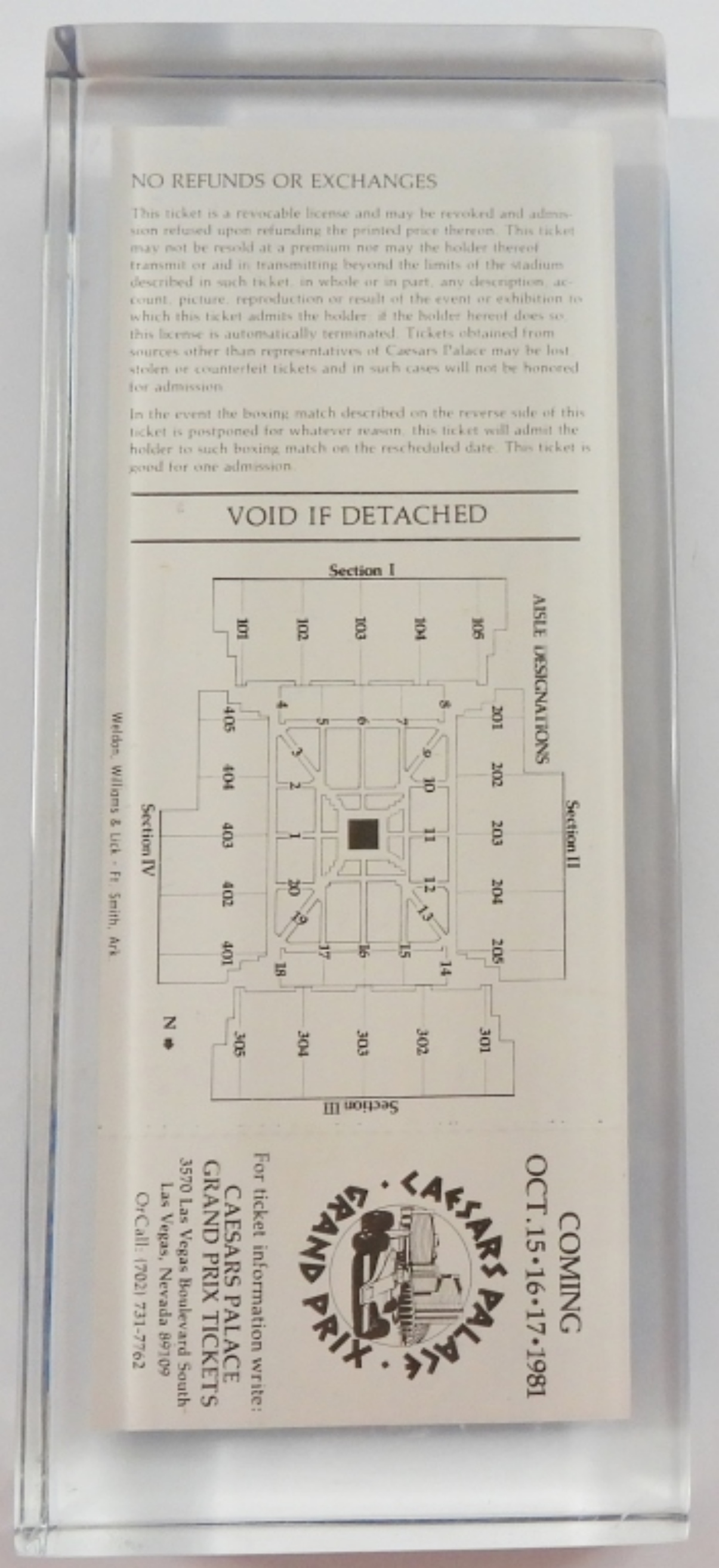 Boxing Ticket 1981 Boxers Sports 81 – ACRYLIC PAPERWEIGHT with ORIGINAL TICKET