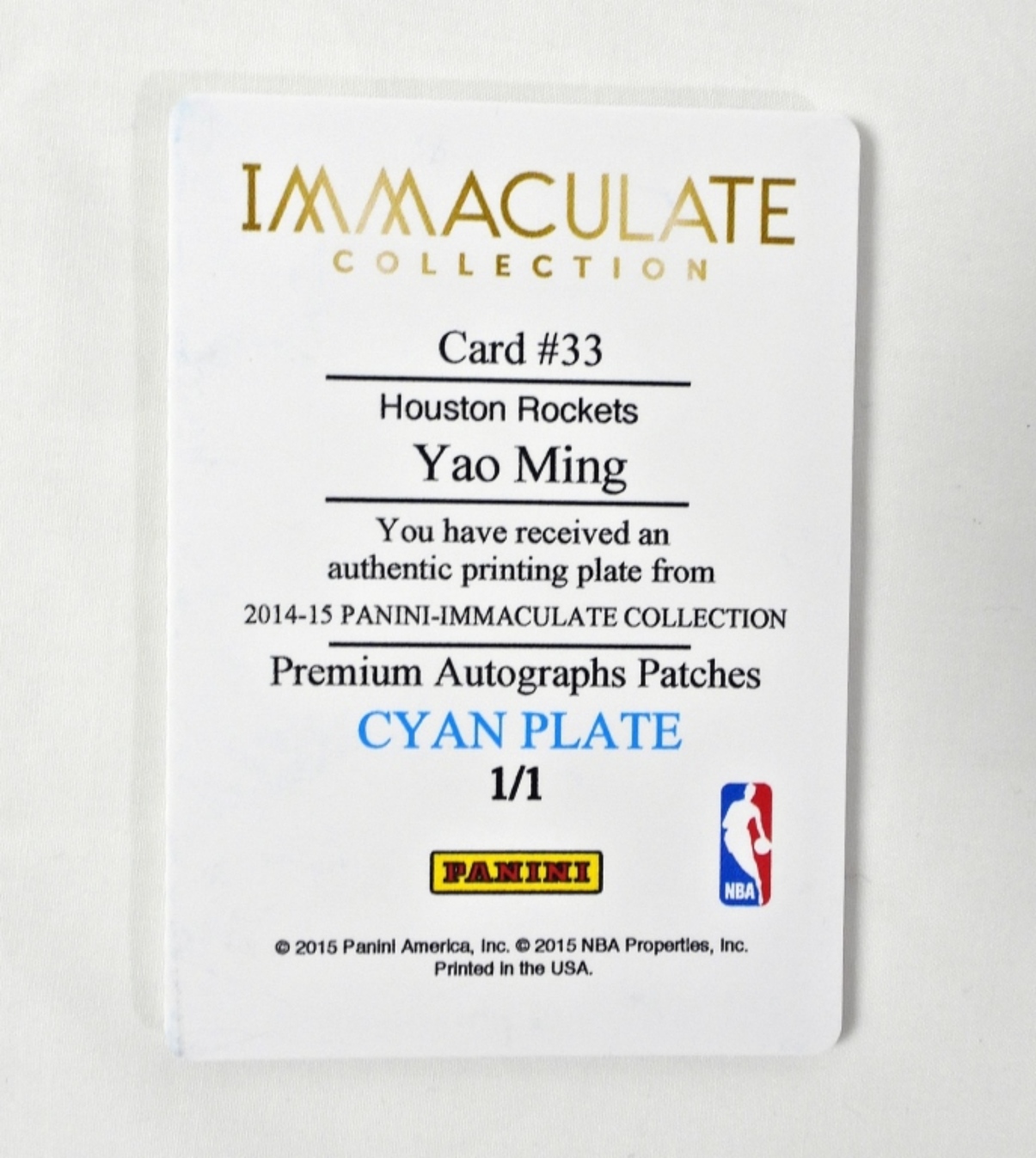PANINI CARD #33, YAO MING, PREMIUM AUTOGRAPHS PATCHES CYAN PLATE 1/1.