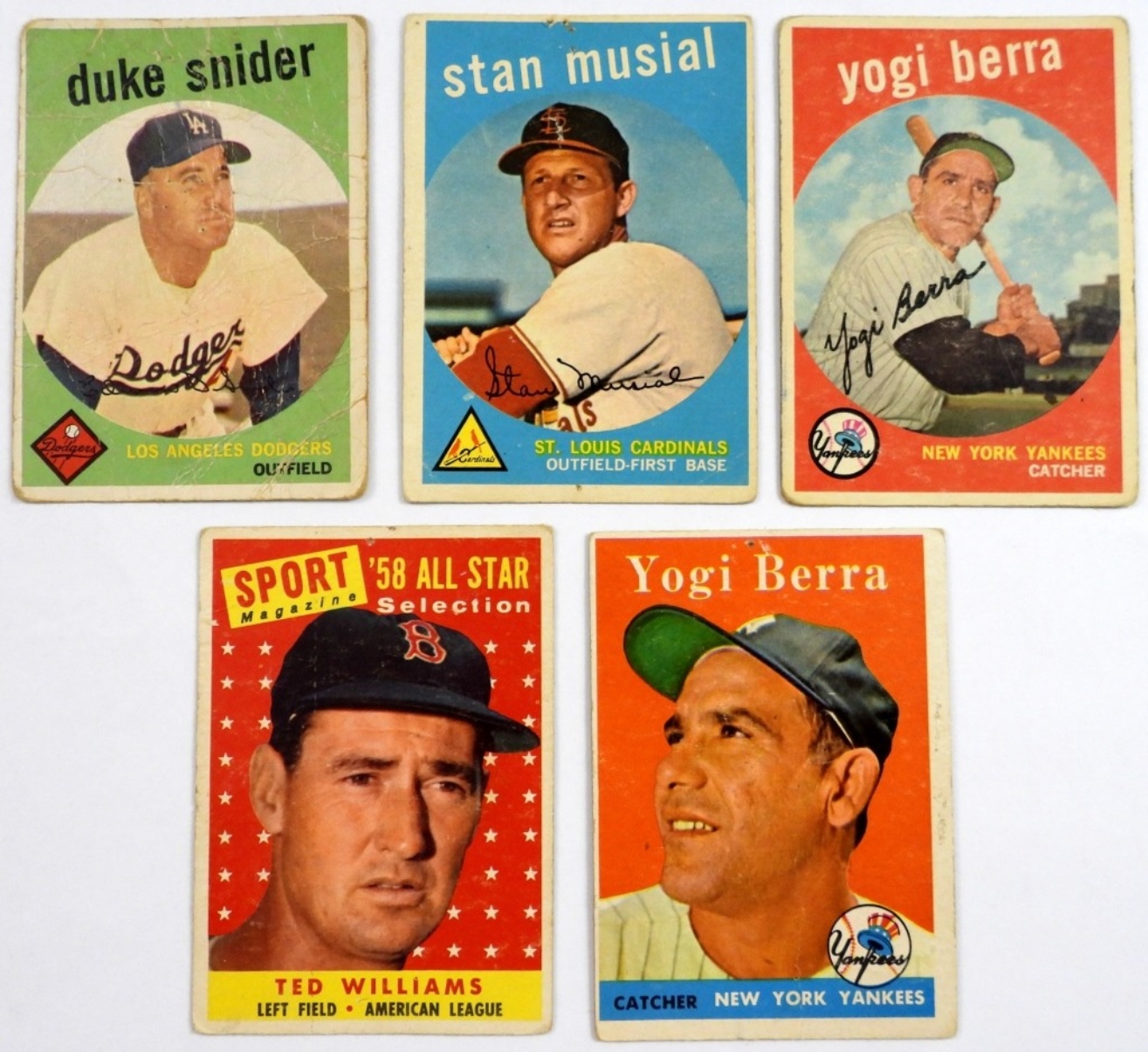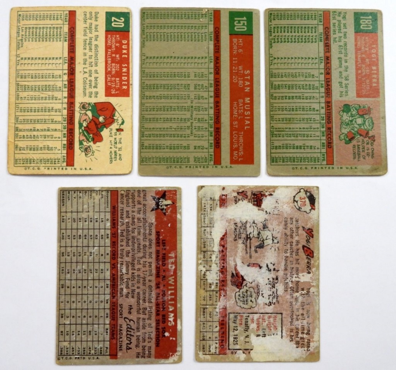 1958 T #485 TED WILLIAMS & #370 BERRA both lesser with glue on backs, (3) 1959 TOPPS lesser condition BERRA, MUSIAL, SNIDER