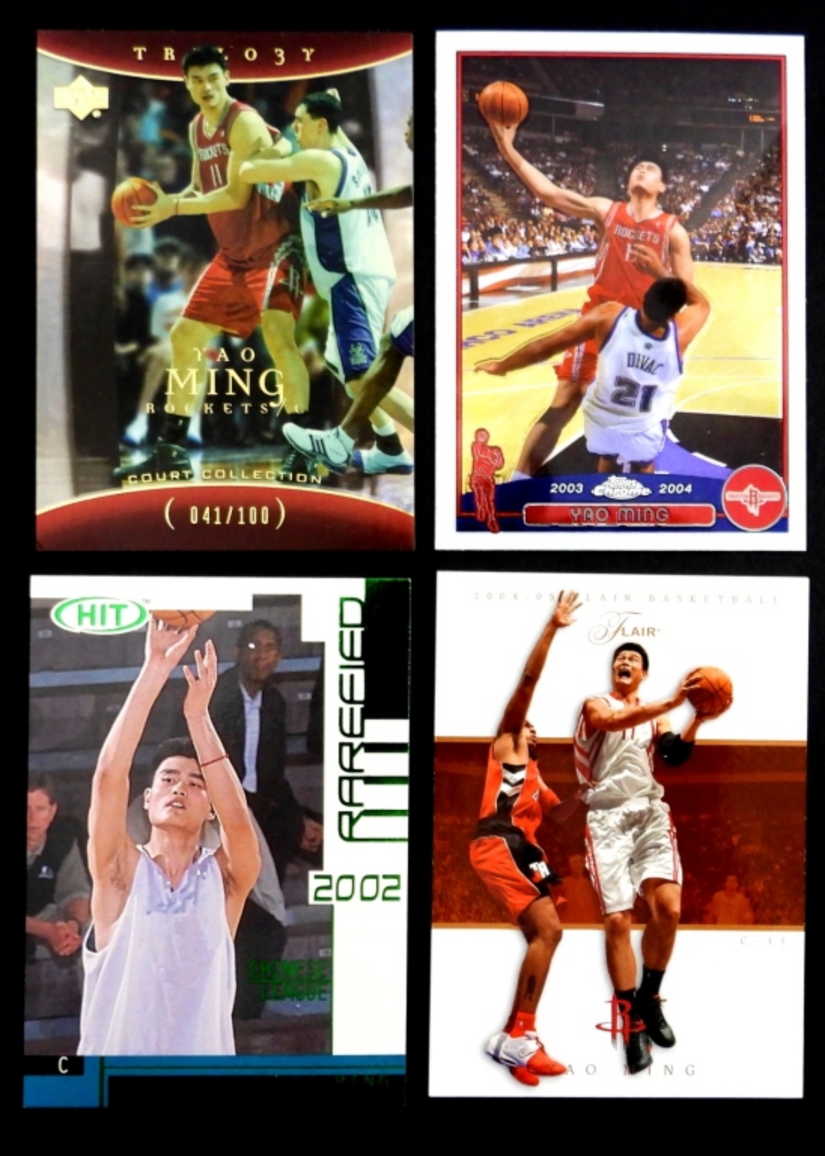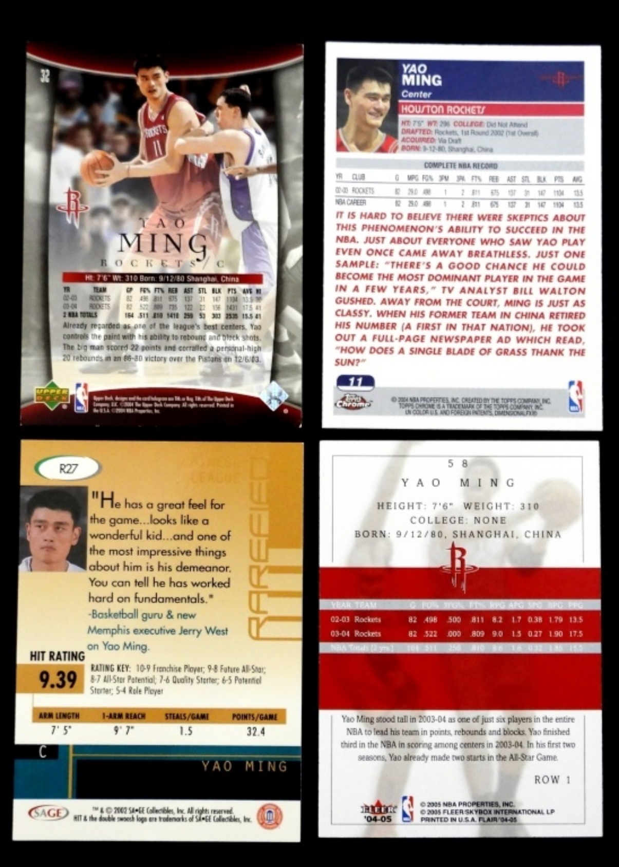YAO MING. HIT 2002 CHINESE LEAGUE CARD. 03-04 TOPPS CHROME CARD. UPPER DECK COURT COLLECTION 41/100. FLAIR 2004-05 . NM