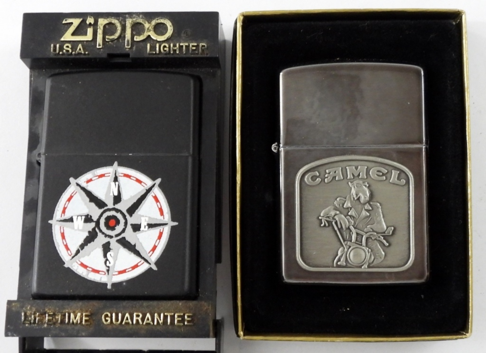 1992 ZIPPO LIGHTER UNFIRED ,WITH A CAMLE LOGO IN ORIGINAL BOX. 1998 MATTE BLACK MARLBORO ADVENTURE ZIPPO LIGHTER ,UNFIRED IN A ZIPPO CASE