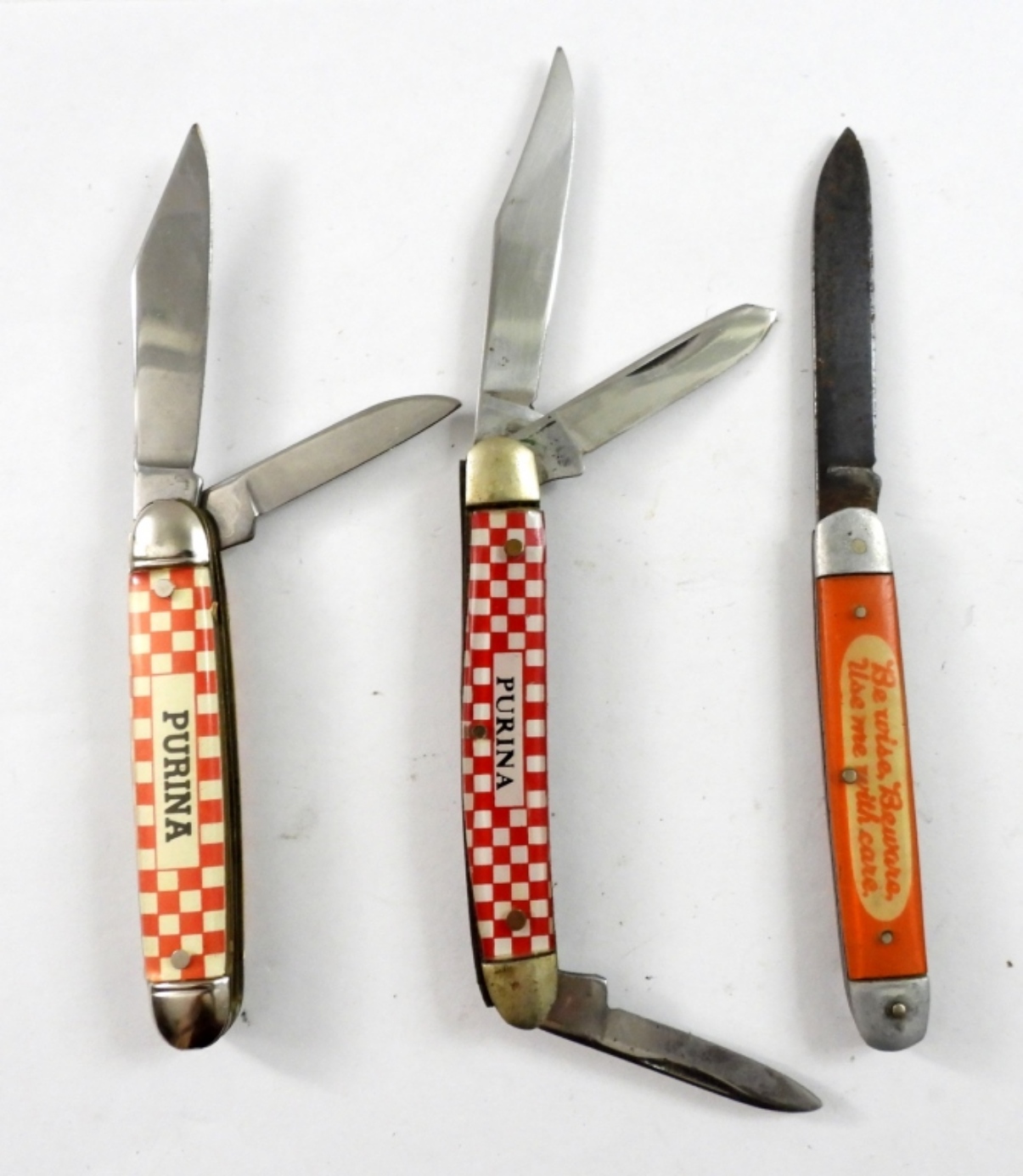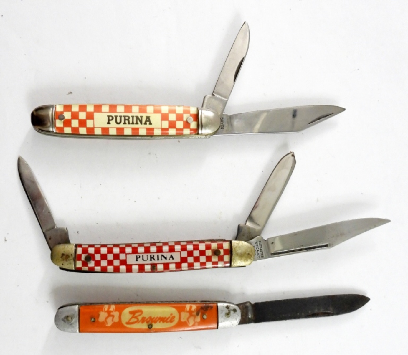 PURINA CUTMASTER THREE BLADE NICE, PURINA BAYES TWO BALDE NICE, BROWNIE KUTMASTER SINGLE BLADE shows wear
