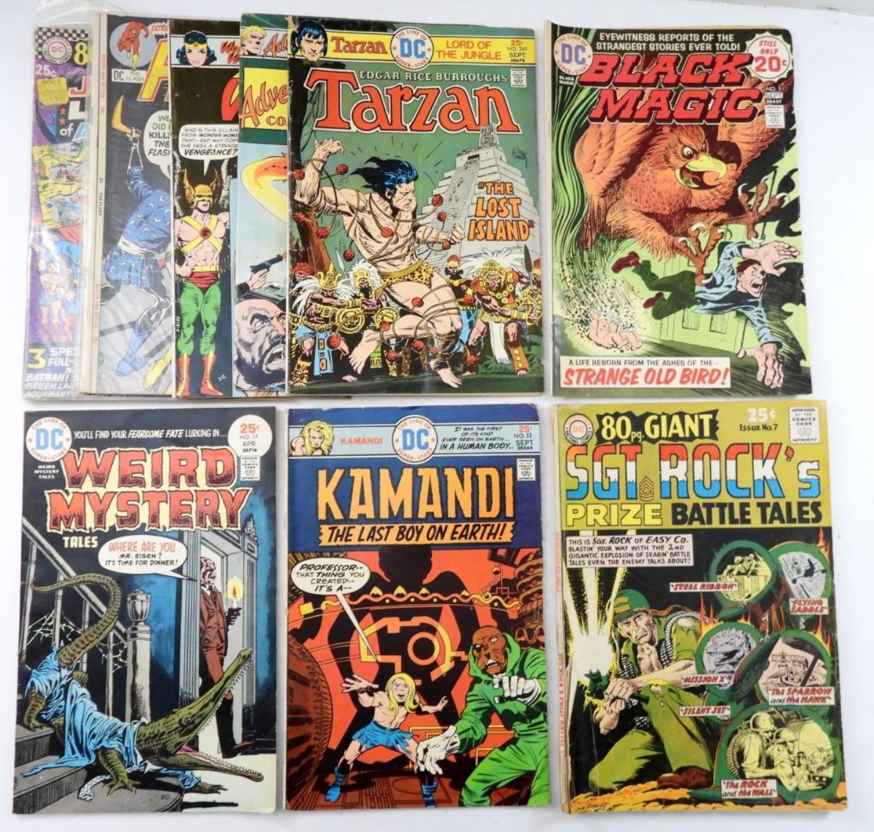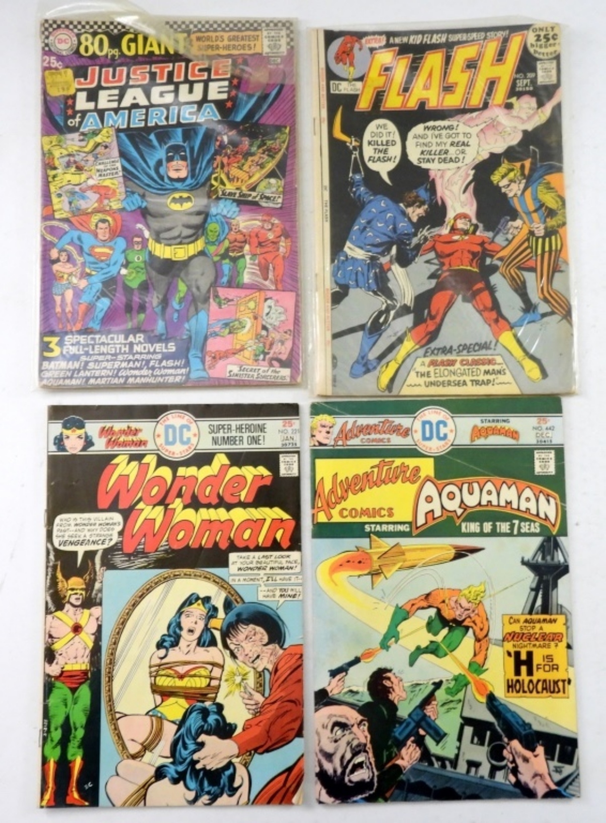 1966 80 PG. JUSTICES LEAGUE OF AMERICA #48 3 SPECTACULAR FULL-LENGTH NOVELS, GOOD,1965 80PG. SGT.ROCK’S PRIZE BATTLE TALES #7 FAI.1971 FLASH#209 VG.1975 WONDER WOMAN #221 GOOD. 1975 AQUAMAN KING OF 7 SEAS