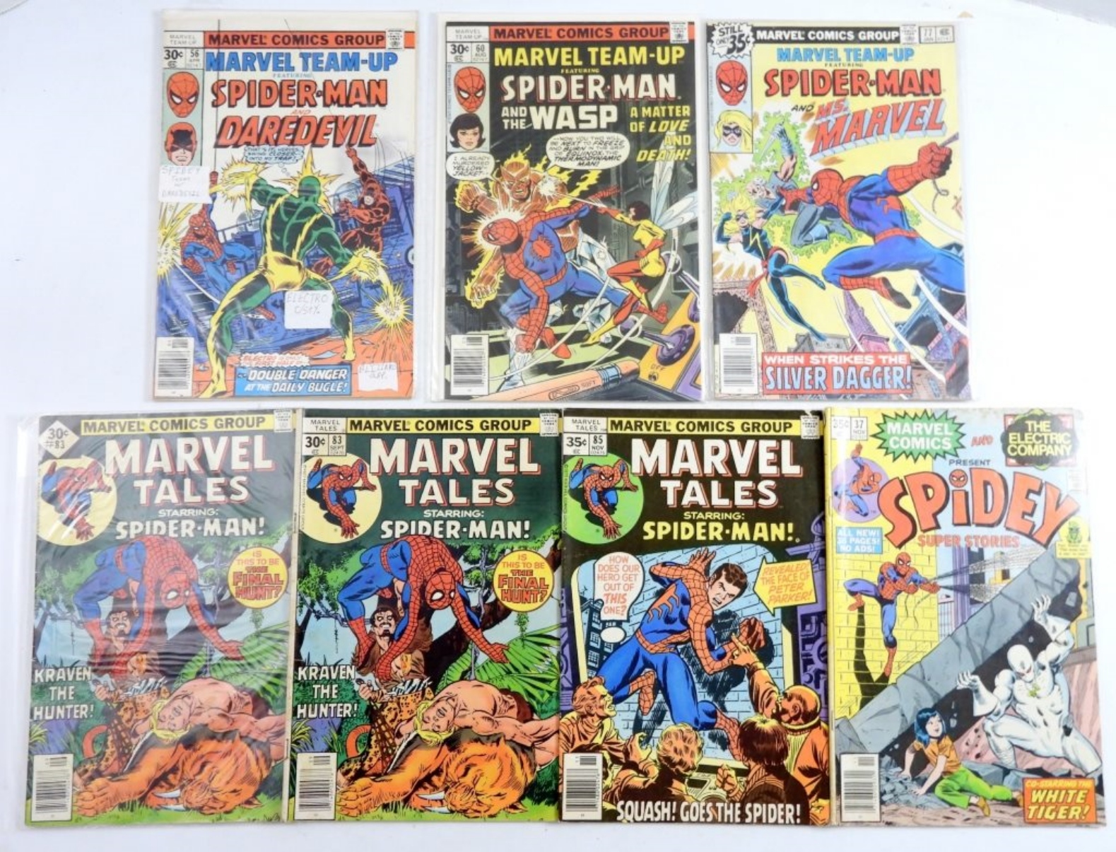 (2) 1977 PETER PARKER THE SPECTACULAR SPIDER-MAN #8,#11VG. 4(1977-1979) MARVEL TEAM-UP FEATURING SPIDERMAN #56,#60,#65.#77 VG/GOOD.3 (1977) MARVEL TALES STARING SPIDER-MAN (2) #83,#85,#VG/GOOD.1977 THE