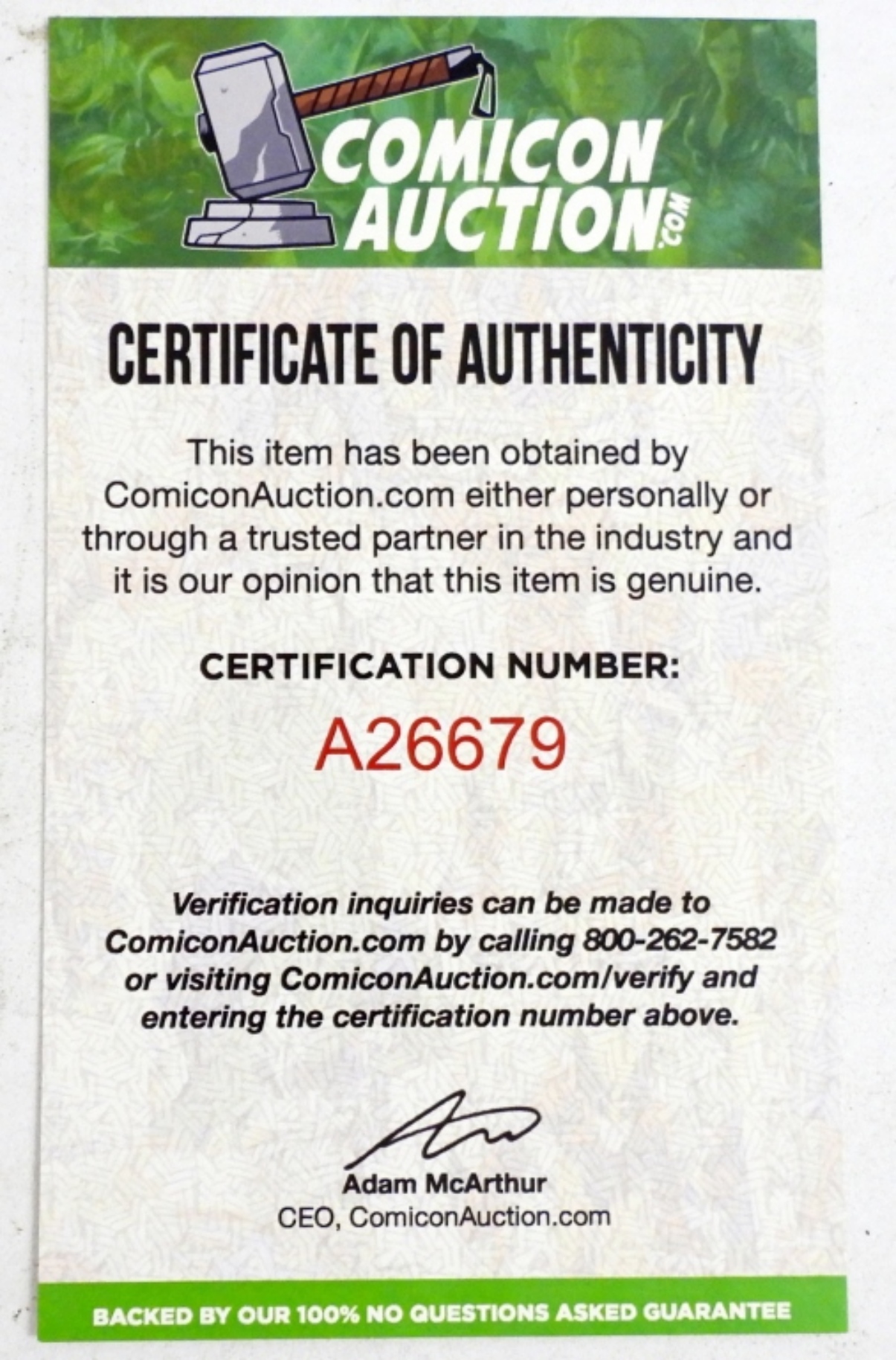 CERTIFICATE by COMICON AUCTION #A26679 – NM/MT