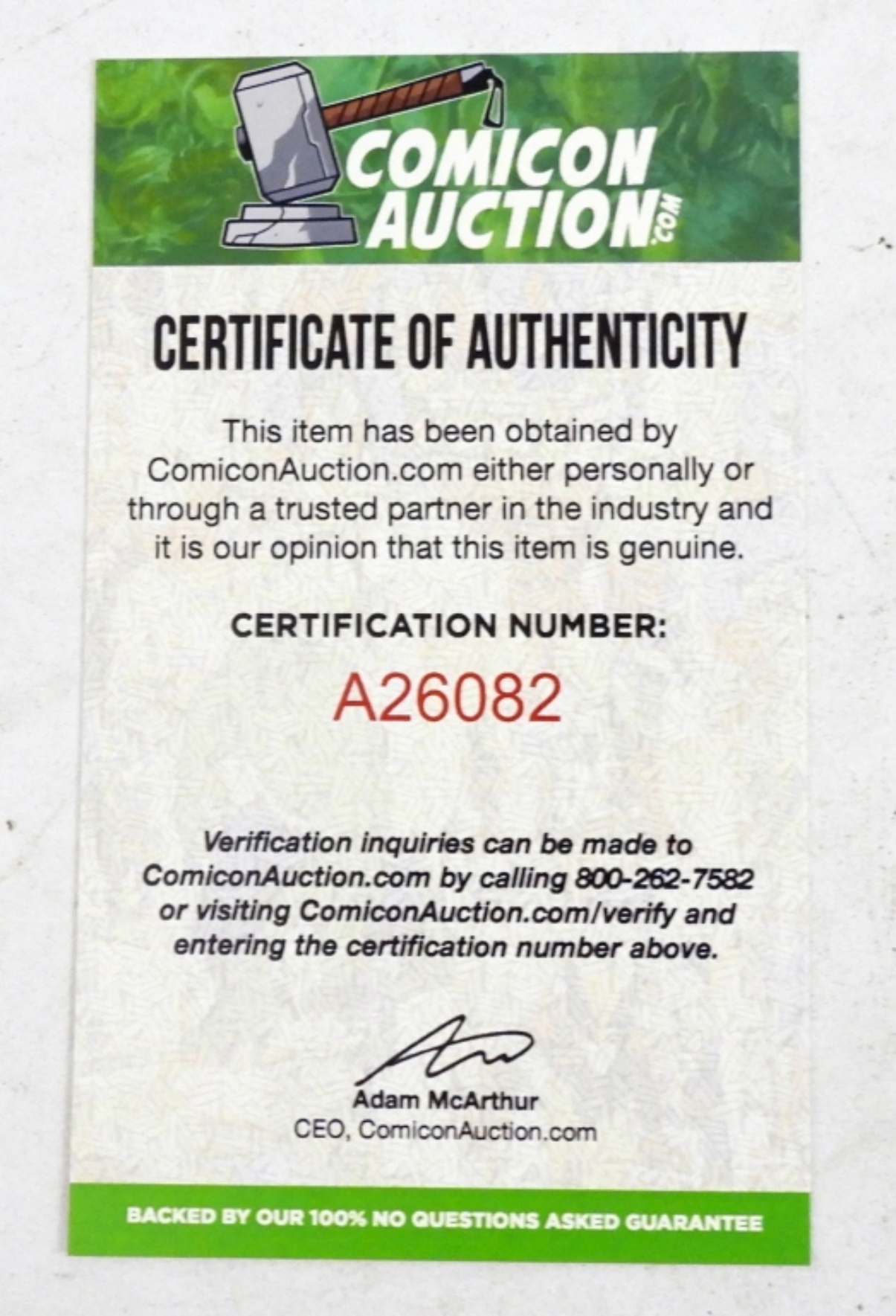 CERTIFICATE by COMICON AUCTION #A26082 – NM/MT