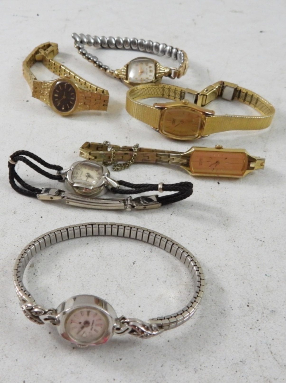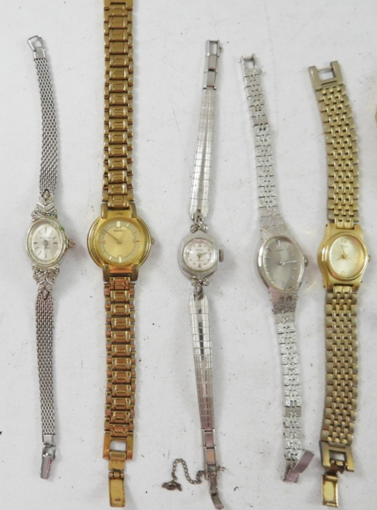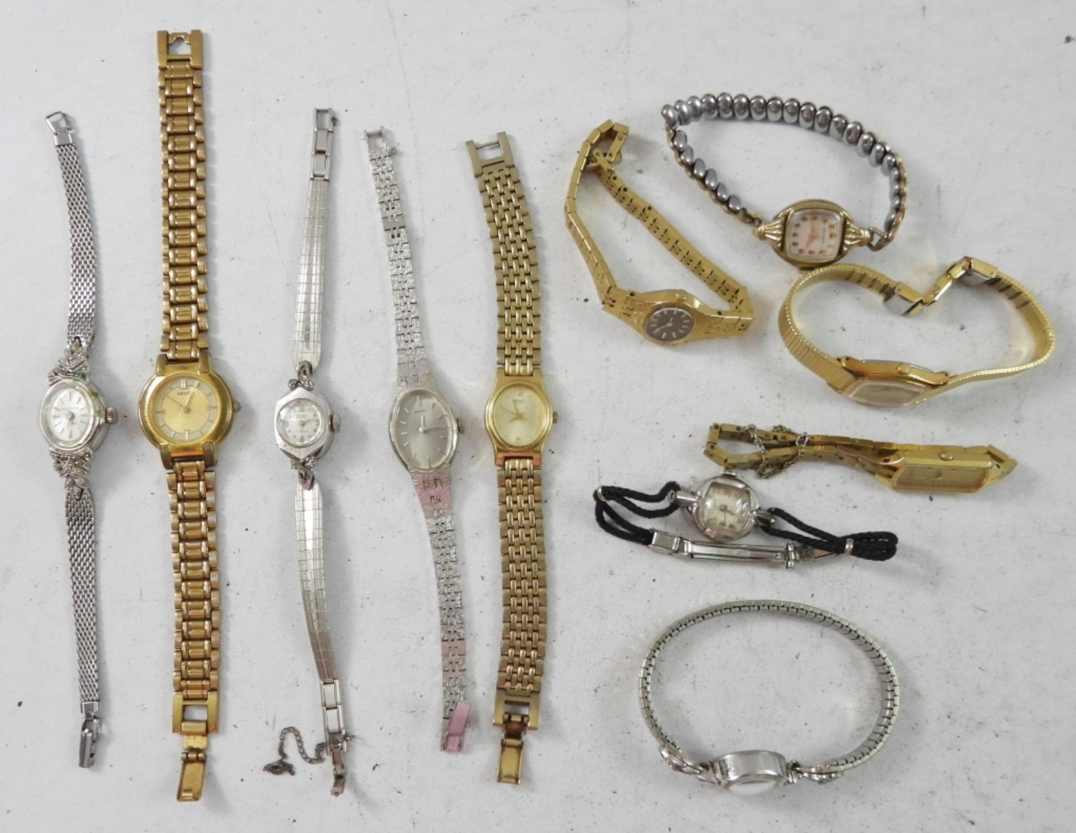 11 SMALL FACE LADIES WATCHES(2)WALTHAM(1) GRUEN,(1) HAMILTON,(1) WITTNAUER,(6) SEIKO. GOLD AND SILVER TONE NOT TESTED AS TO WORKING OR NOT