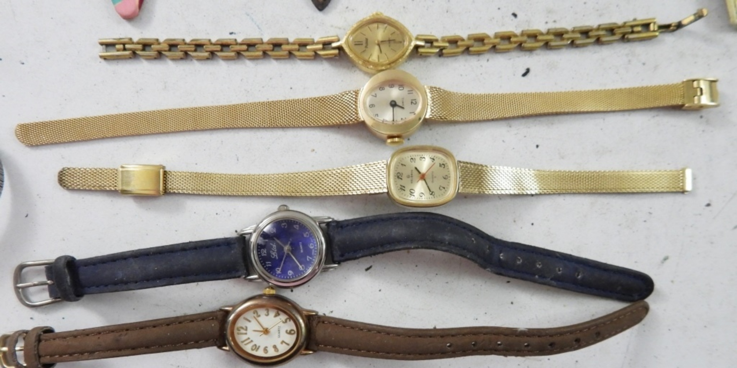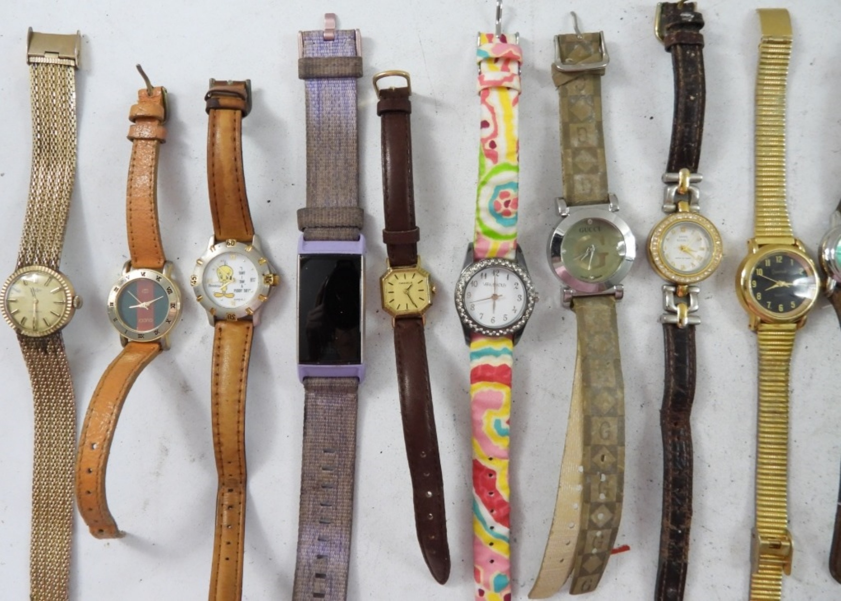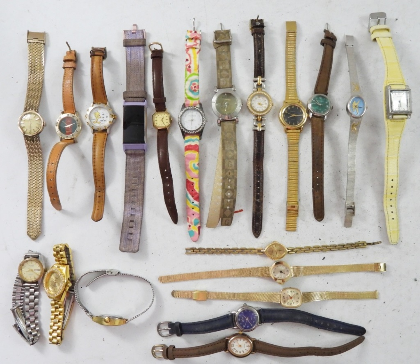 20 ASSORTED LADIES WATCHES ,VARIOUS COLORS AND STYLES, BOTH GOLD AND SILVER TONE .NOT TESTED AS TO WORKING OR NOT