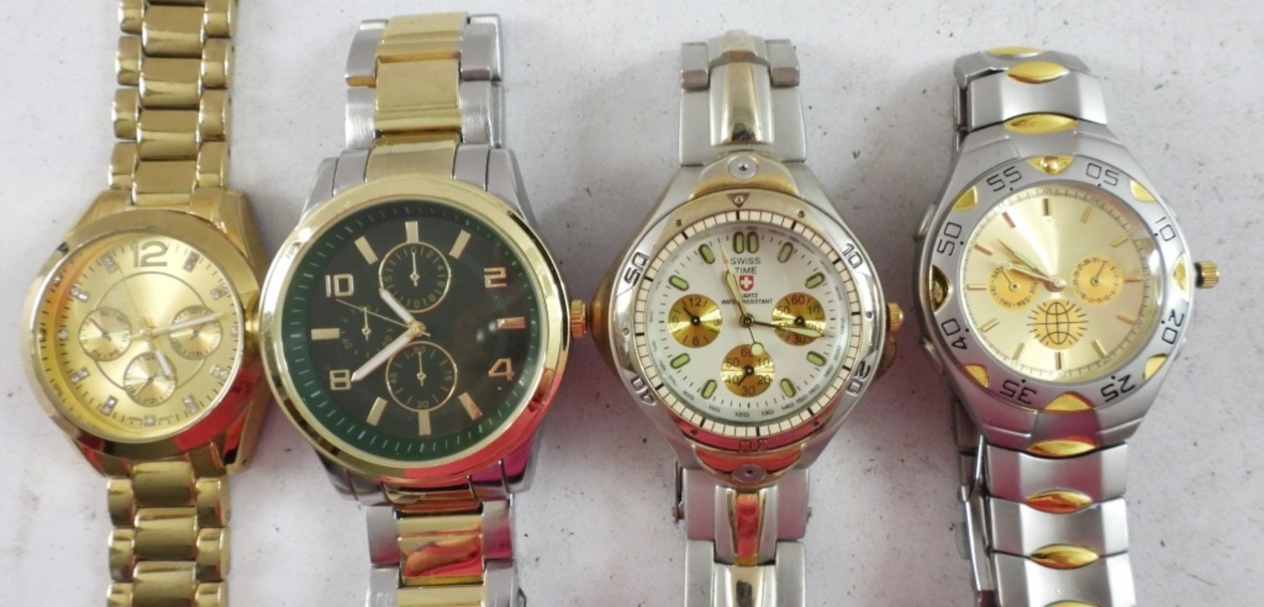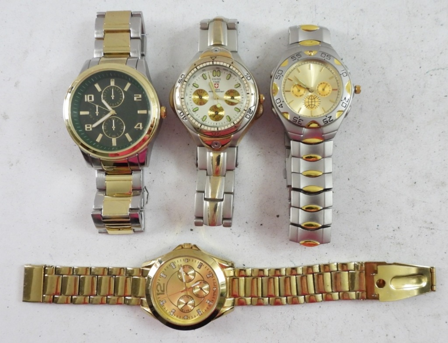 4 CHRONOGRAPH MENS WATCHES .3 GOLD & SILVER TONE .1 GOLD .ASSORTED COLOR FACES. NOT TESTED AS TO WORKING OR NOT