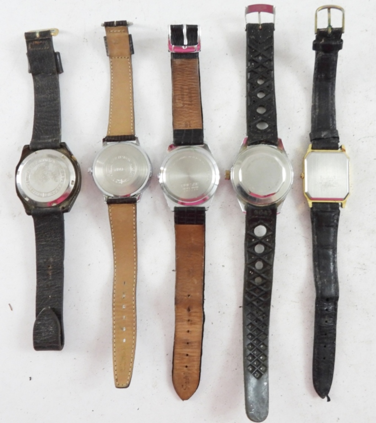 5 MENS DATE/ DAY WATCHES WITH LEATHER BANDS .NOT TESTED AS TO WORKING OR NOT