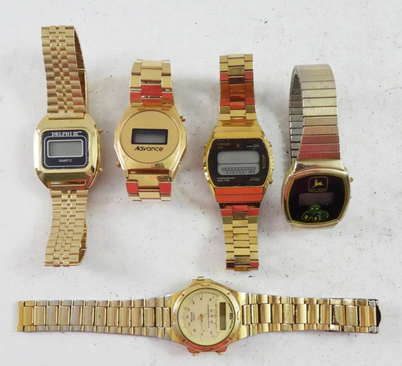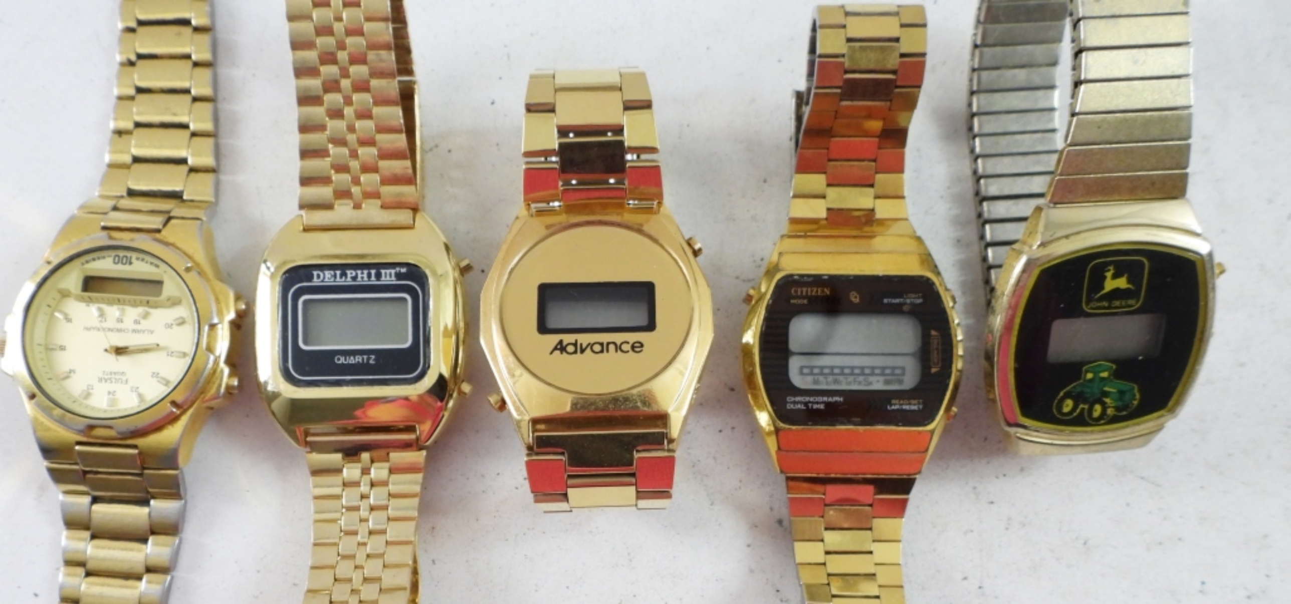 5 UNISEX LCD GOLD TONE WATCHES ,4 WITH CLASP BAND 1 STRETCHY BAND. NOT TESTED AS TO WORKING OR NOT