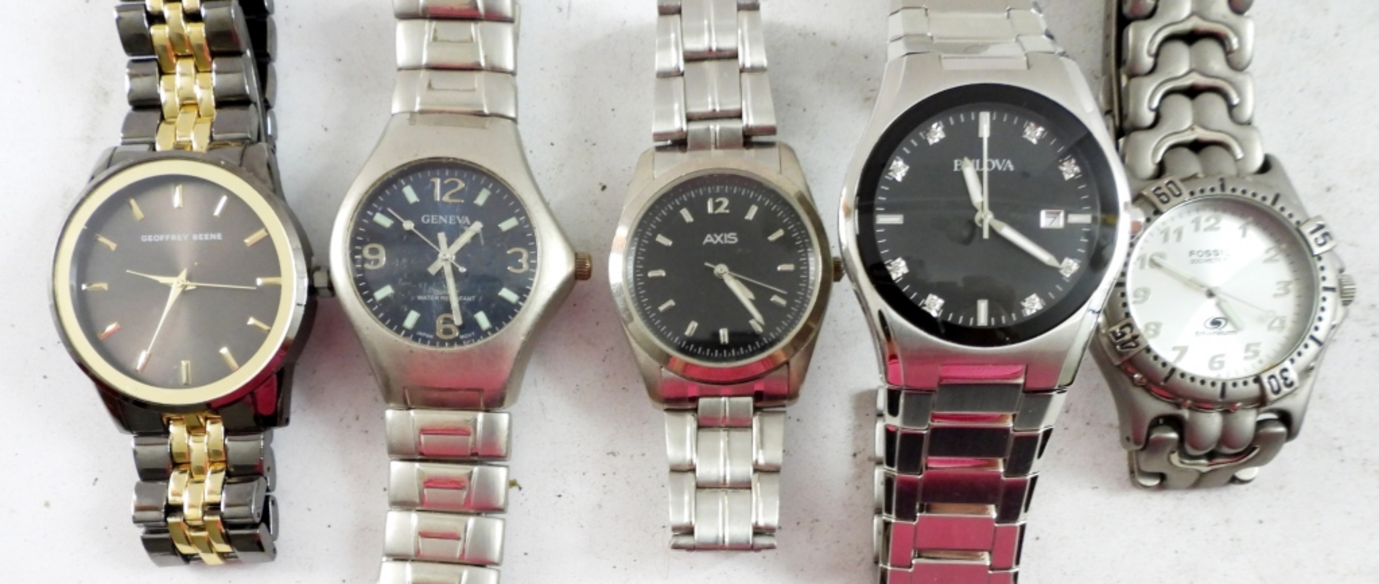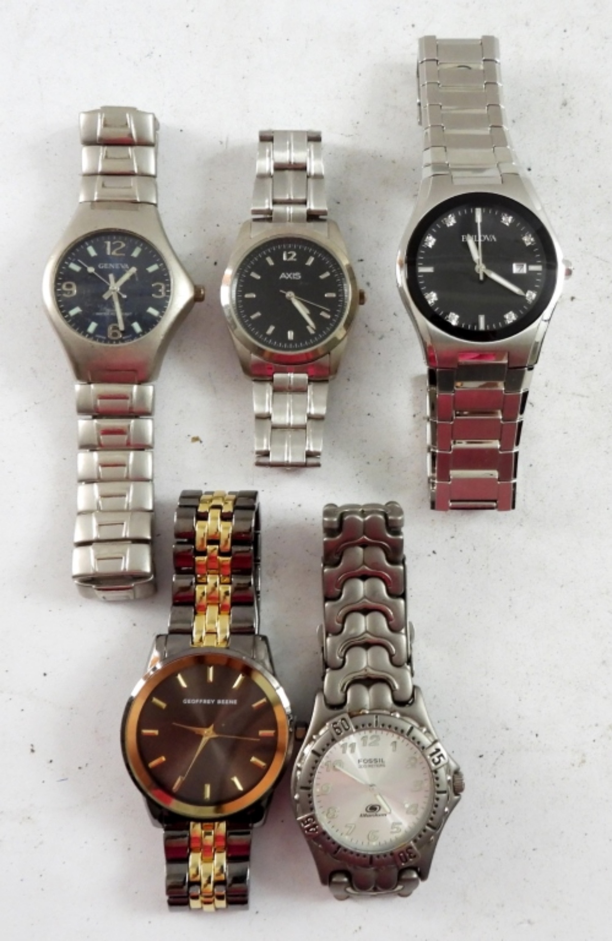 5 MENS FASHION WATCHES , 4 ARE SILVER TONE ,1 GOLD TONE ALL WITH CLASP BANDS . NOT TESTED AS TO WORKING OR NOT