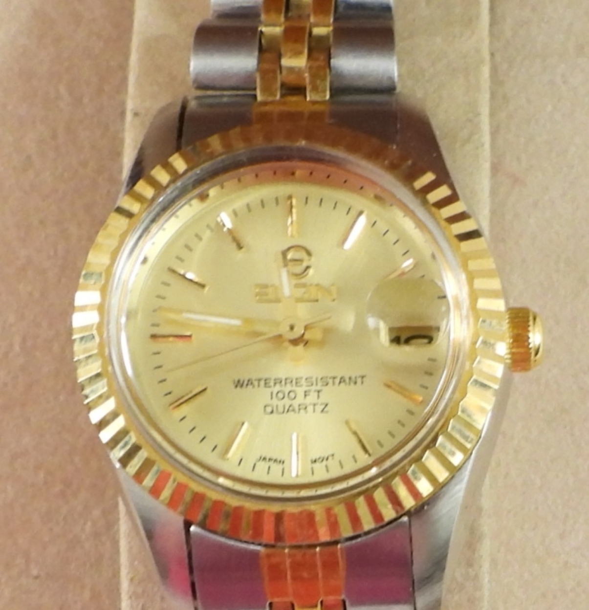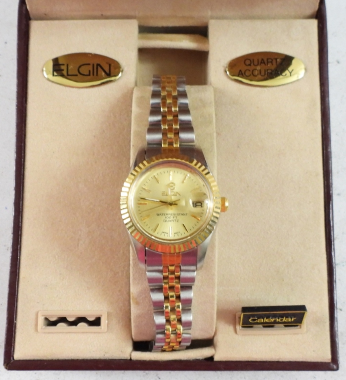 ELGIN 2 TONE LADIES DATE WATCH IN ORIGINAL BOX. NOT TESTED AS TO WORKING OR NOT