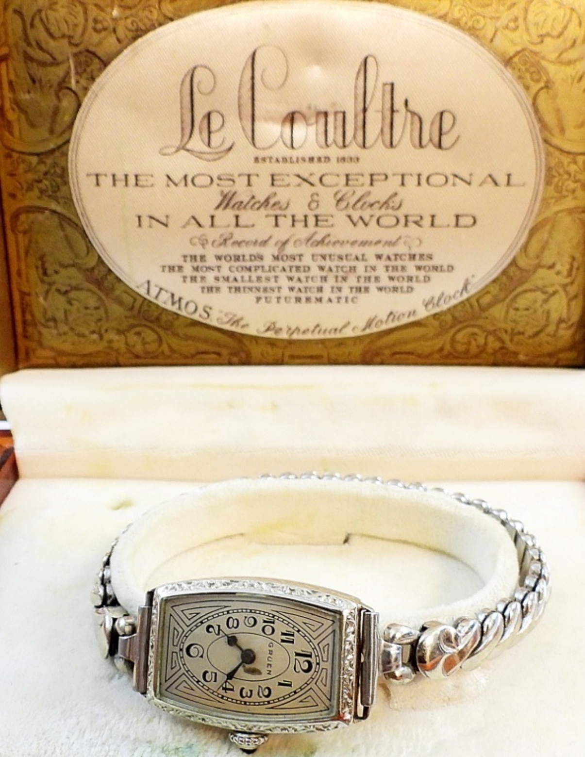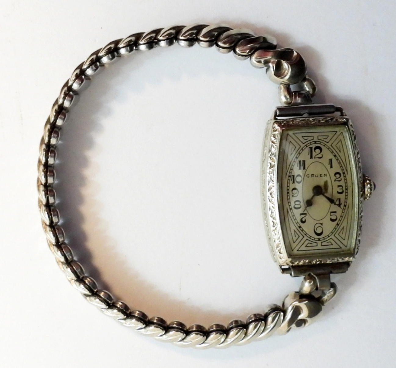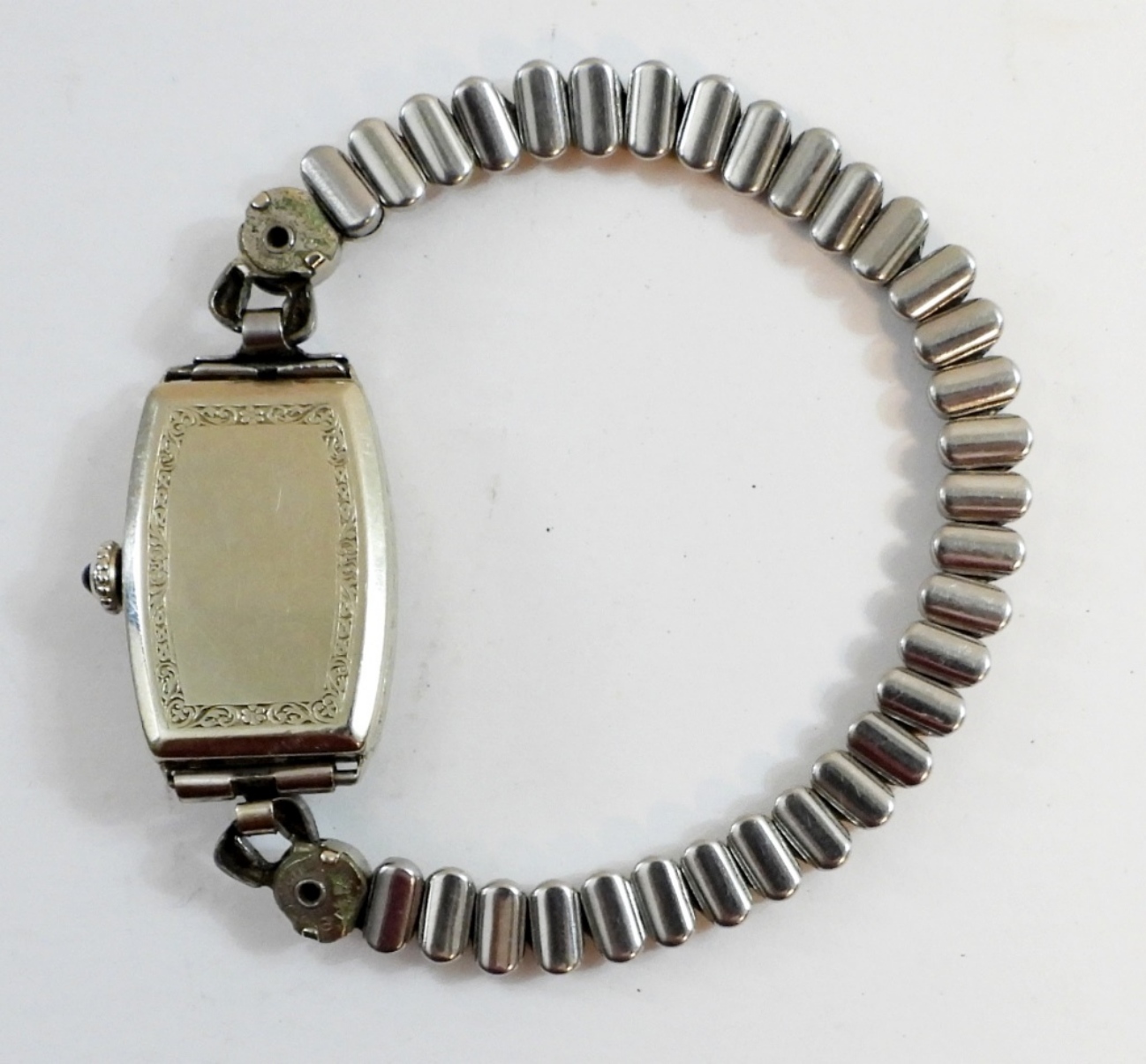 GRUEN ART DECO 14K WHITE GOLD WADSWORTH WATCH. INSIDE, BACK OF WATCH SAYS “GRUEN 14K GOLD REINFORCED WITH METAL – WADSWORTH – 5166338 – OS-3” NOT WORKING. STRETCHY BAND IS STAINLESS STEEL. COMES IN AN OLD LE
