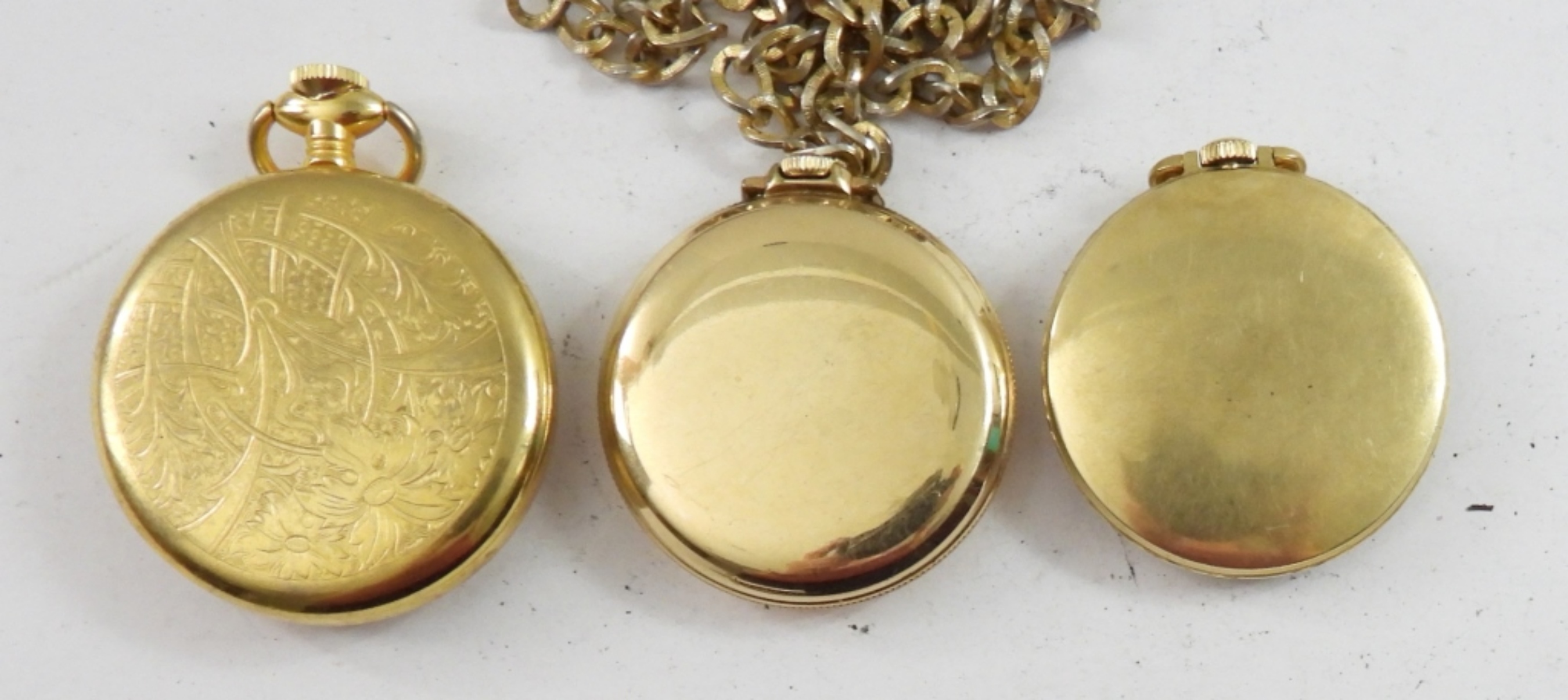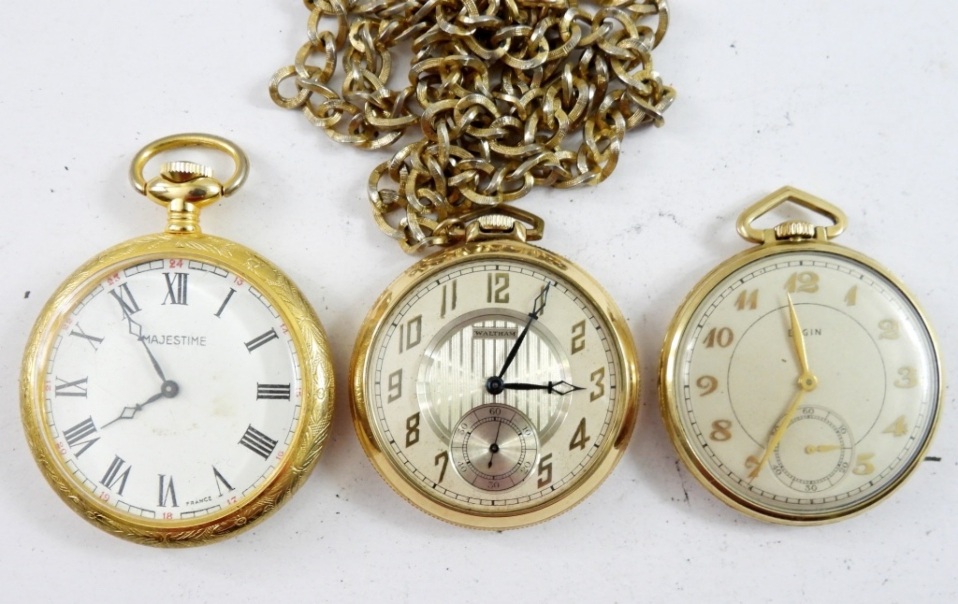 3 VINTAGE MENS GOLD TONE POCKET WATCH ,1 ELGIN,WALTHAM & MAJESTIME.