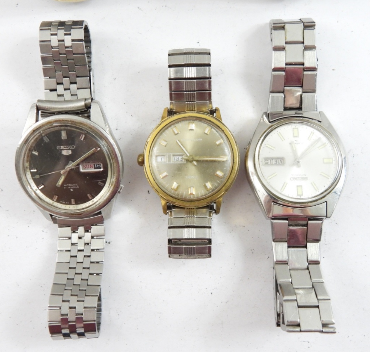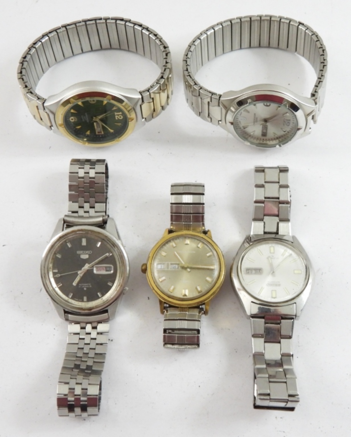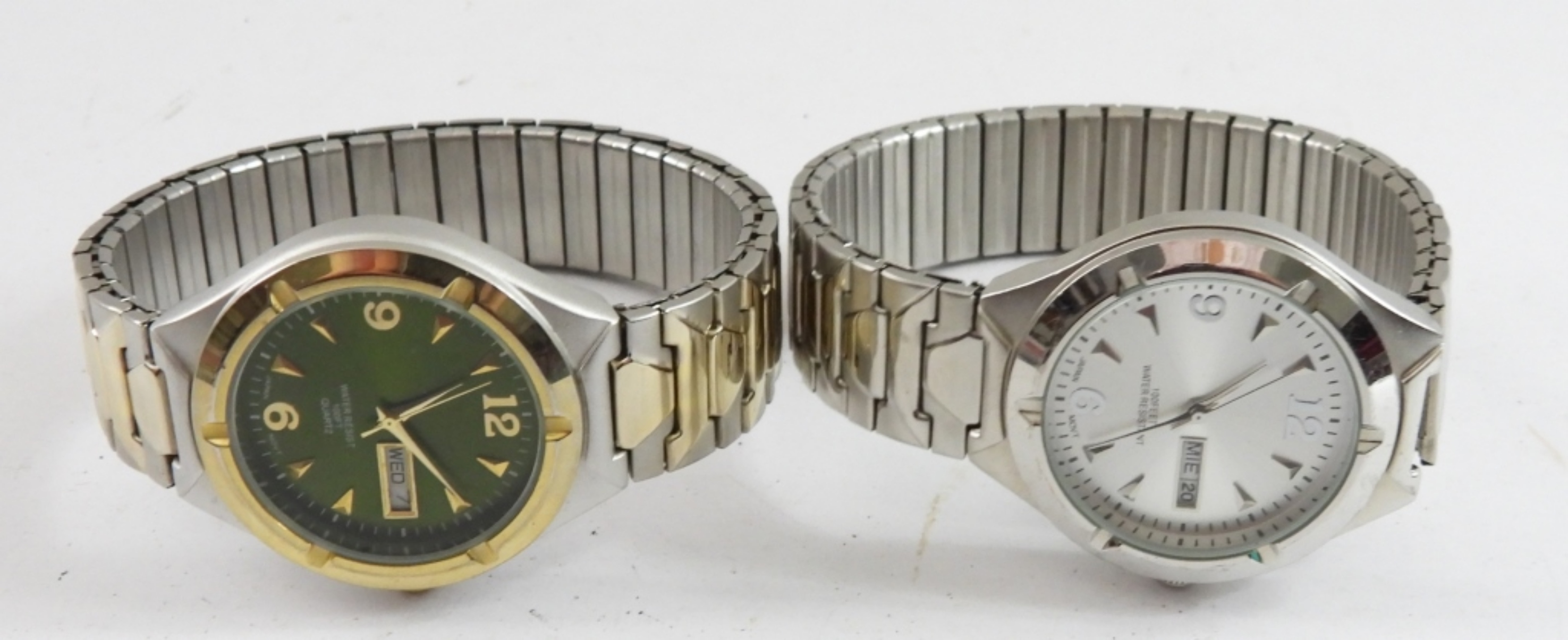 5 MENS DATE / DAY WATCHES .3 SILVER TONE ,2 GOLD/SILVER TONE . NOT TESTED AS TO WORKING OR NOT