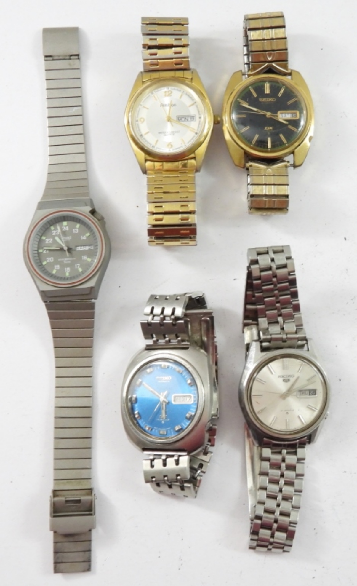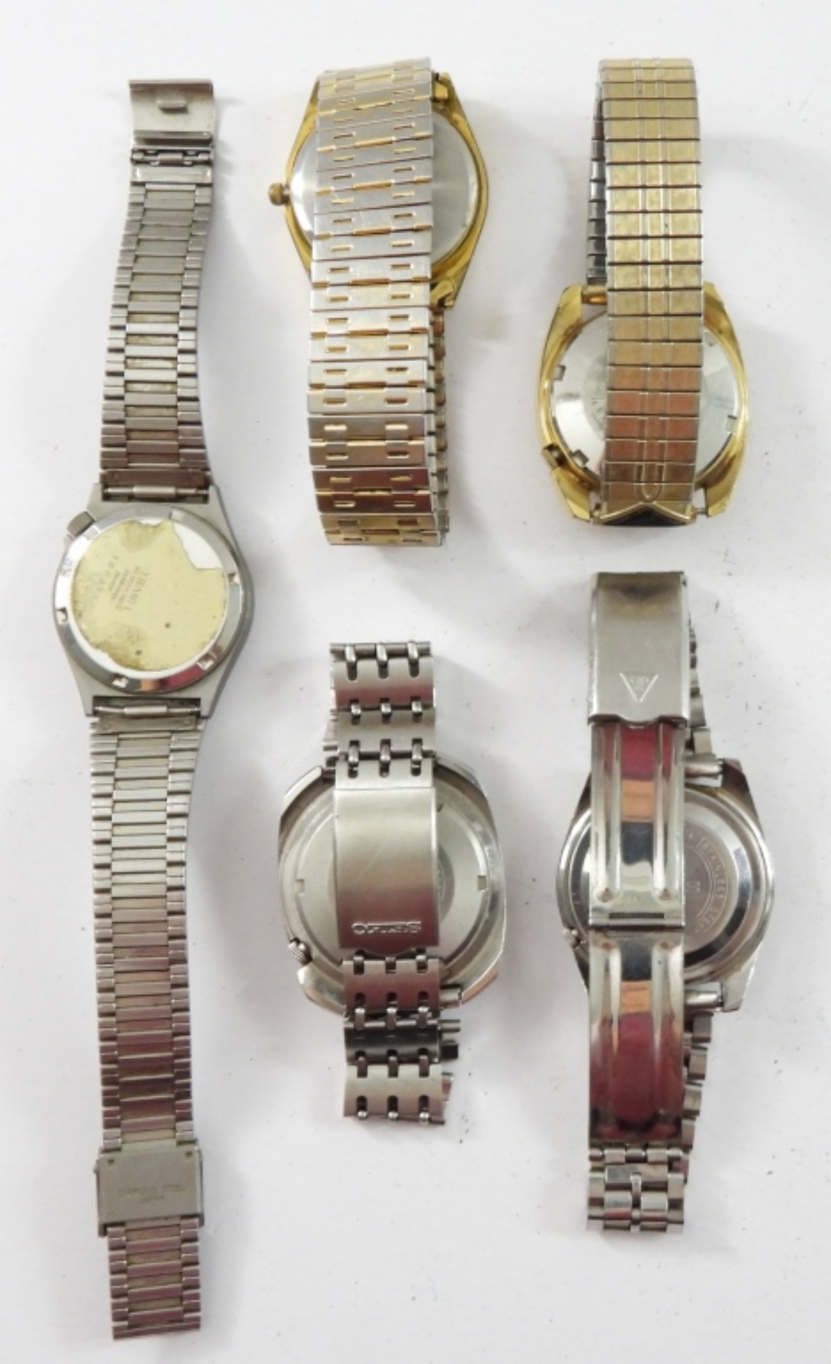 5 MENS FASHION WATCHES.3 SILVER TONE 2 GOLD TONE.2 WITH STRETCHY BANDS 3 CLASP BANDS. NOT TESTED AS TO WORKING OR NOT