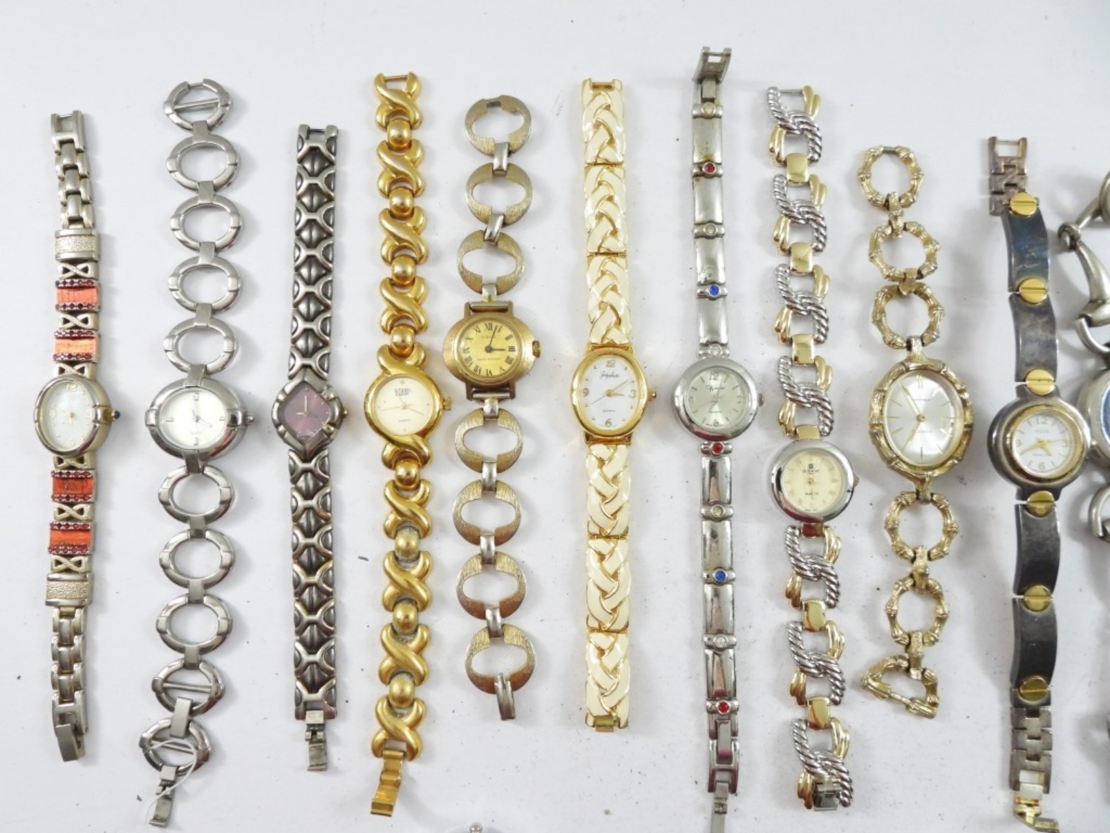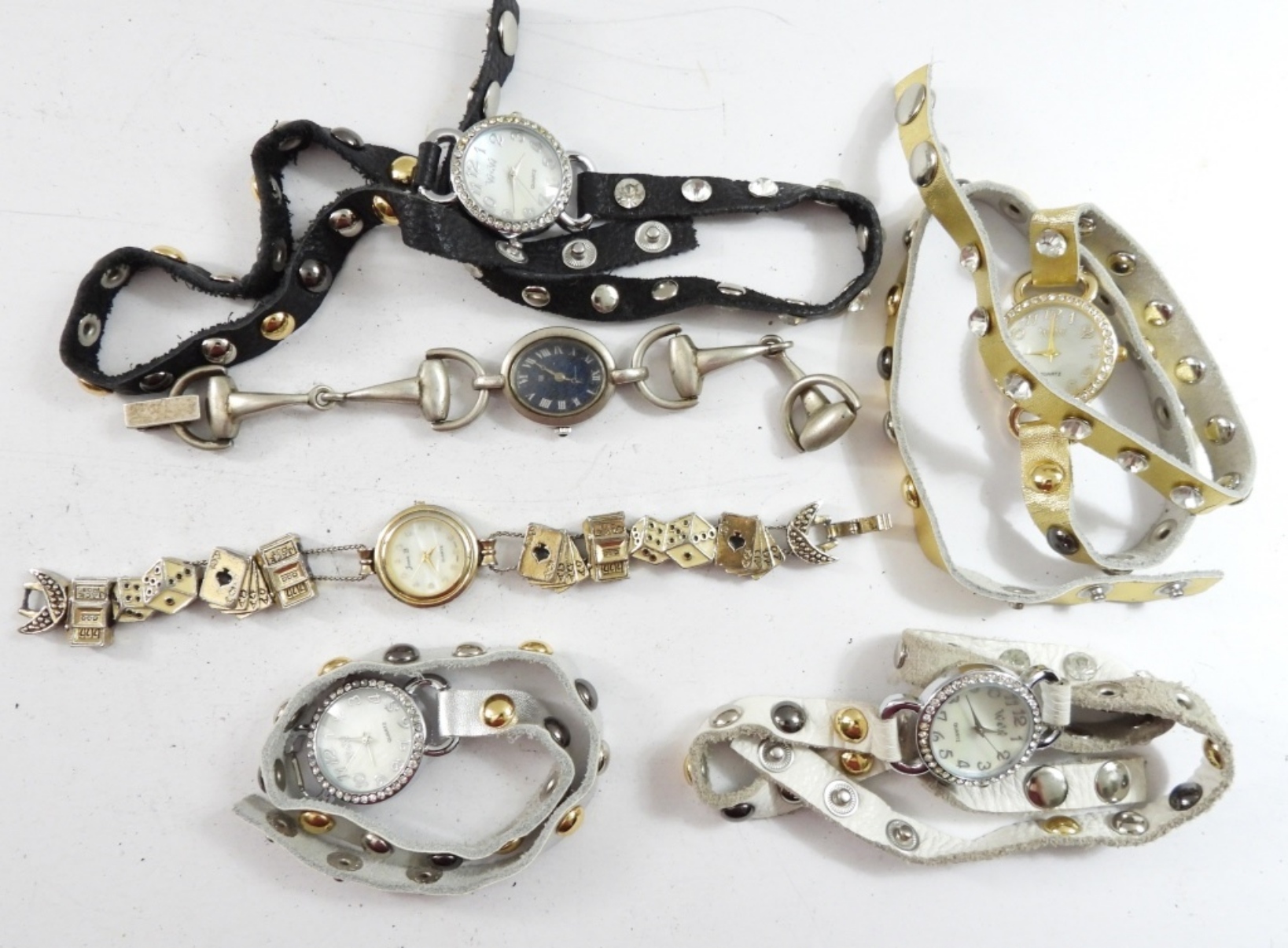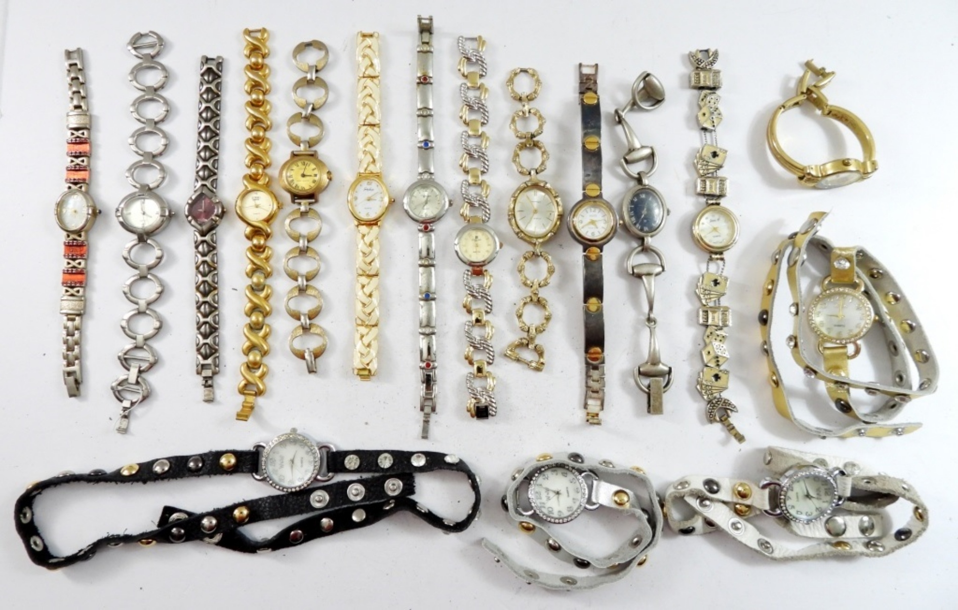 17 LADIES FASHION WATCHES,4 WRAP AROUND WATCHES MILTI COLORS, 13 GOLD AND SILVER TONE CLASP WATCHES ,NOT TESTED AS TO WORKING OR NOT